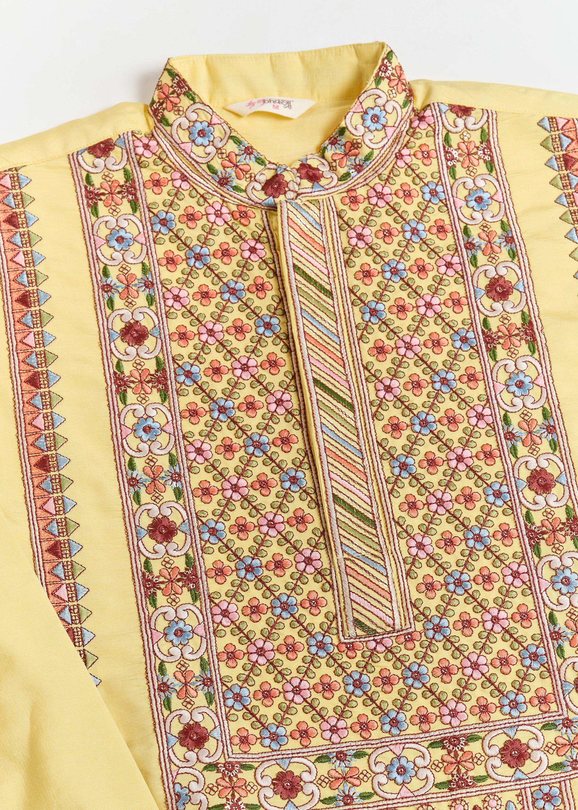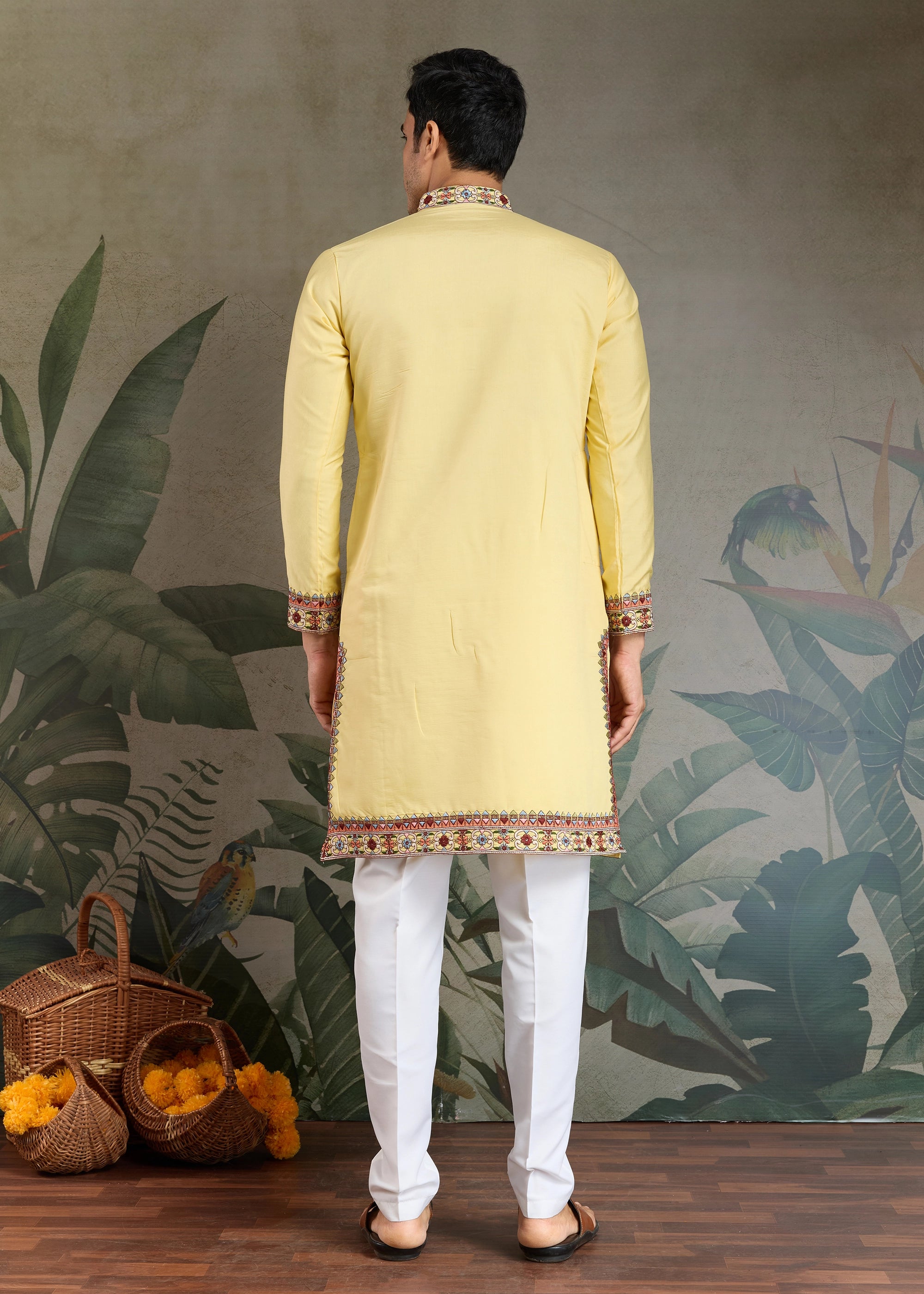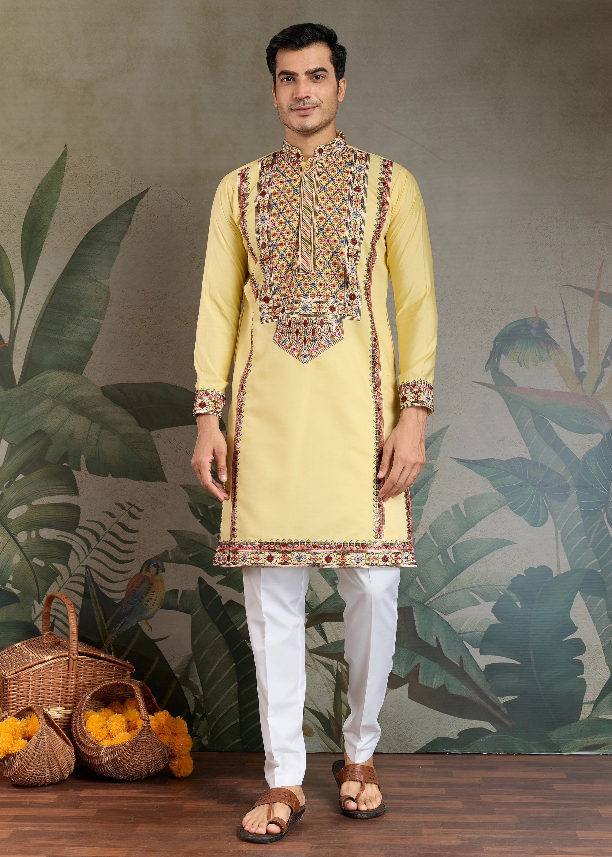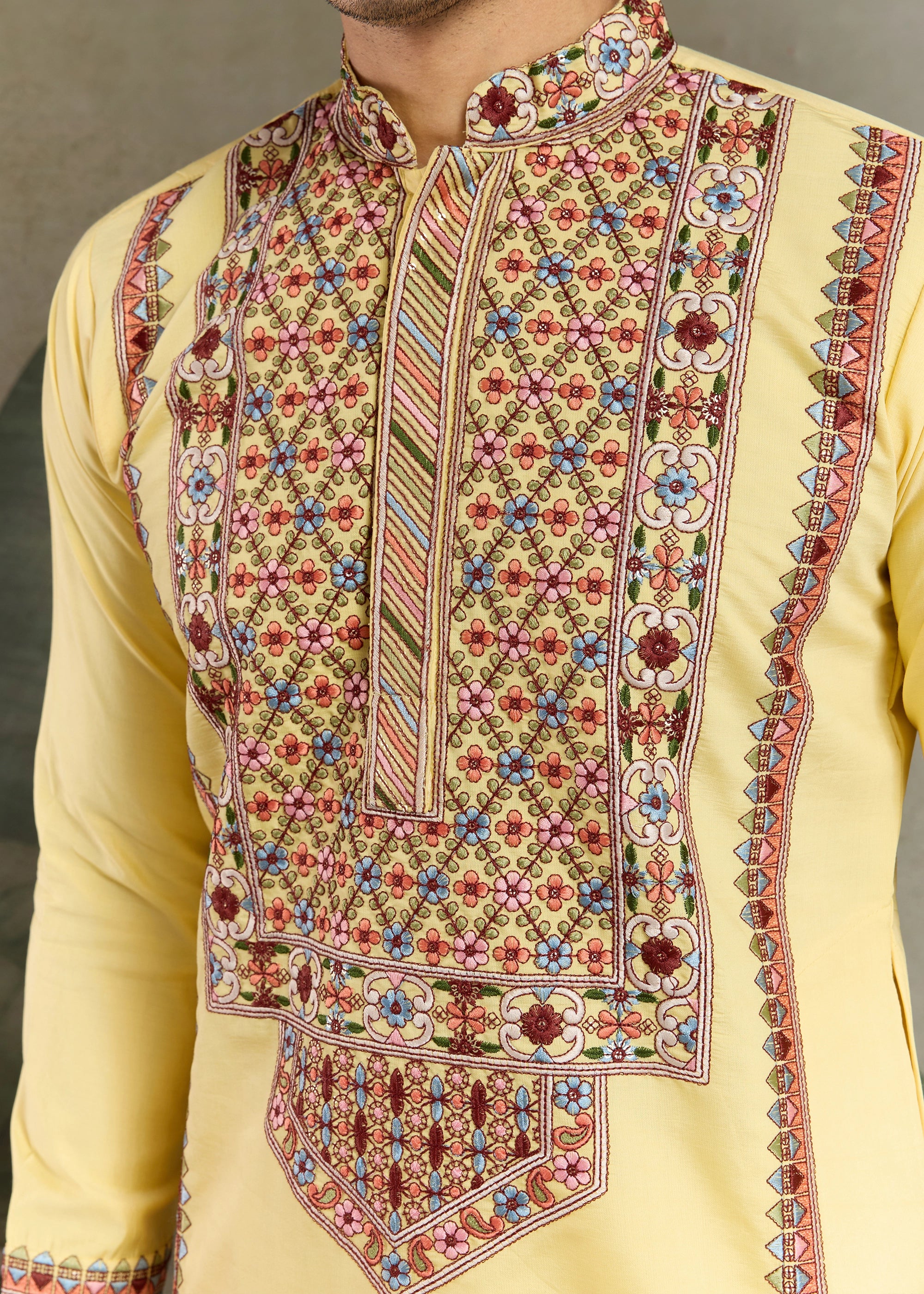 This men's kurta set features with intricate embroidery, notably on the open-front jacket and along the kurta's neckline and cuffs. The design incorporates detailed floral and possibly figurative patterns, creating an ornate and traditional aesthetic. The embroidery work provides a rich texture and visual depth, enhancing the elegance of this festive or ceremonial attire.