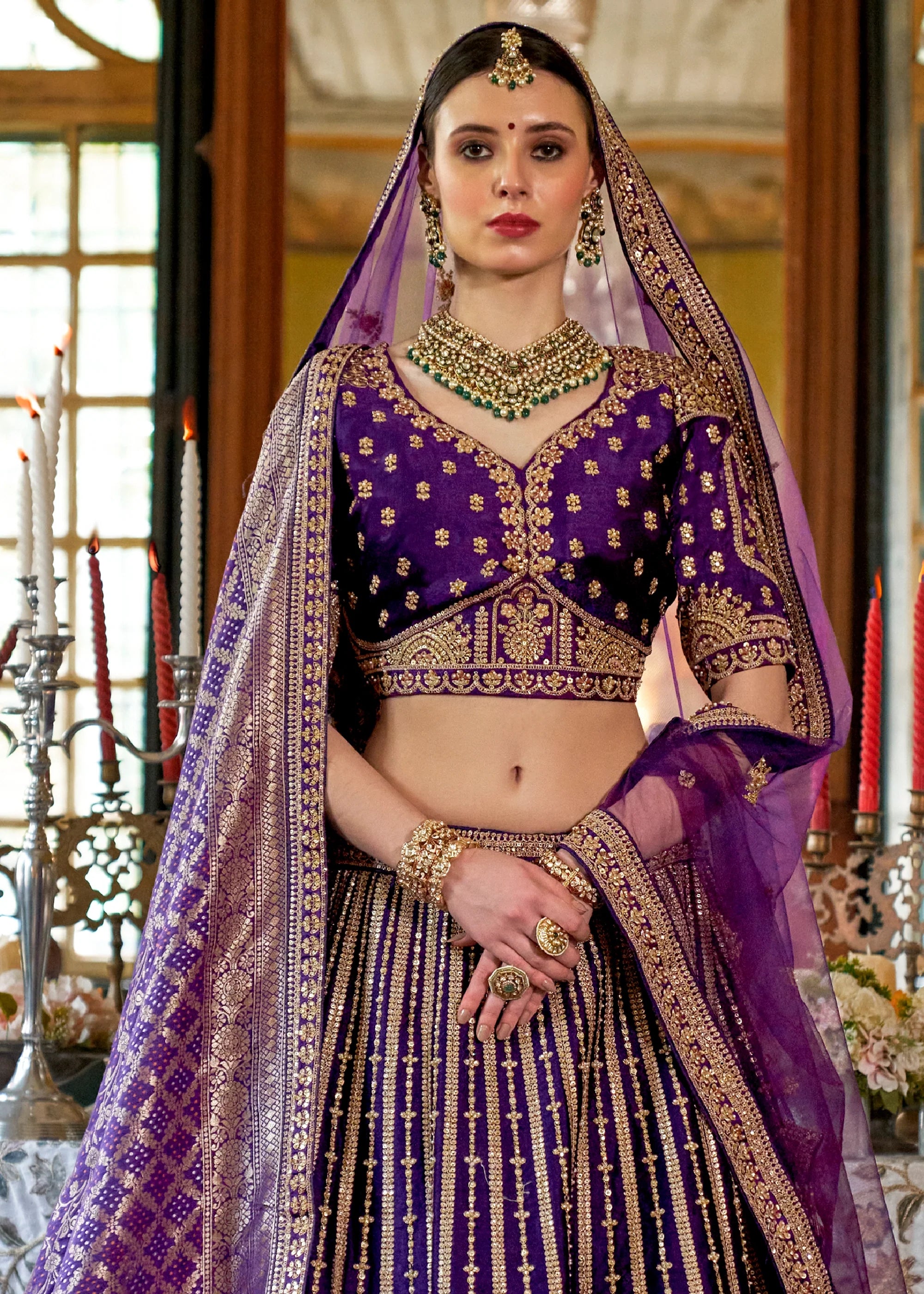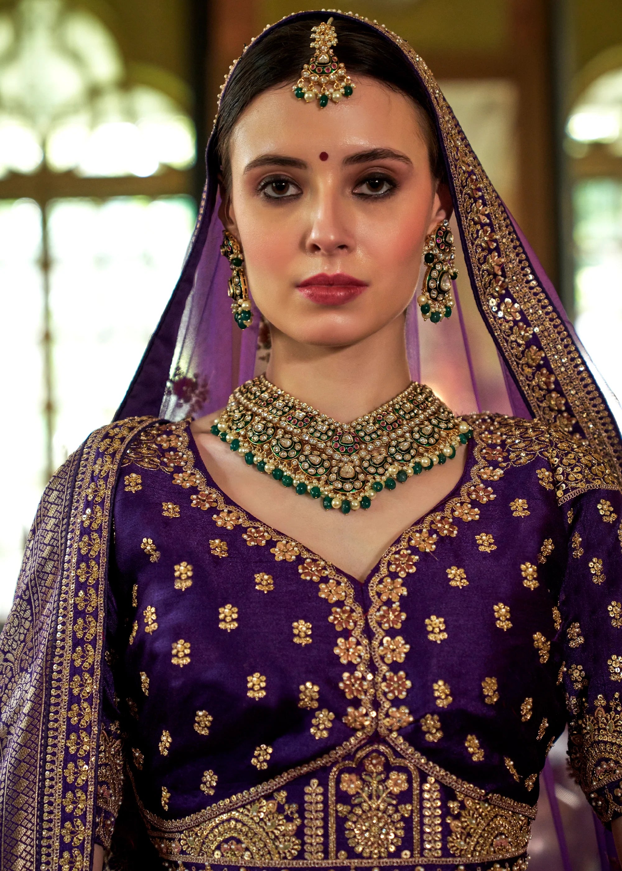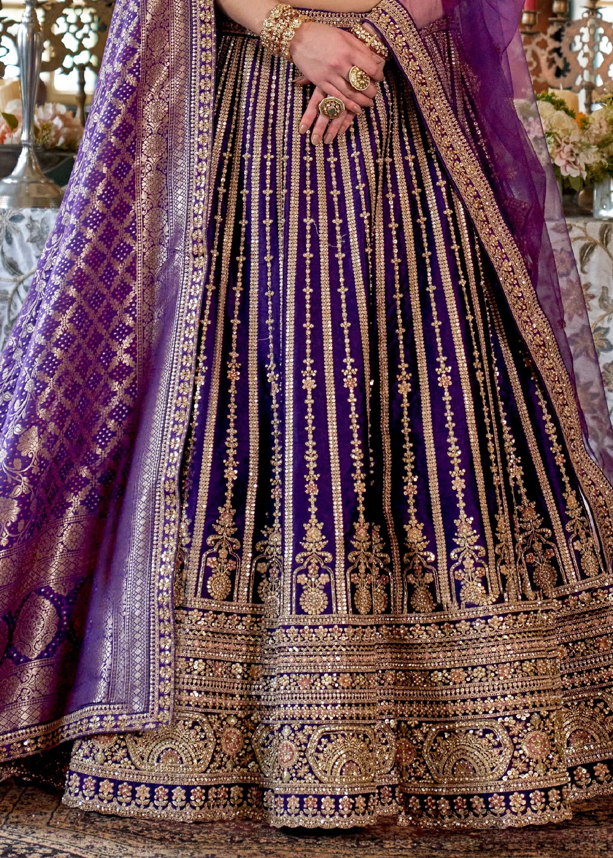 This elegant semi-stitched bridal lehenga in silk is enhanced with delicate thread woven details, shimmering sequins, gleaming zari, and bead...