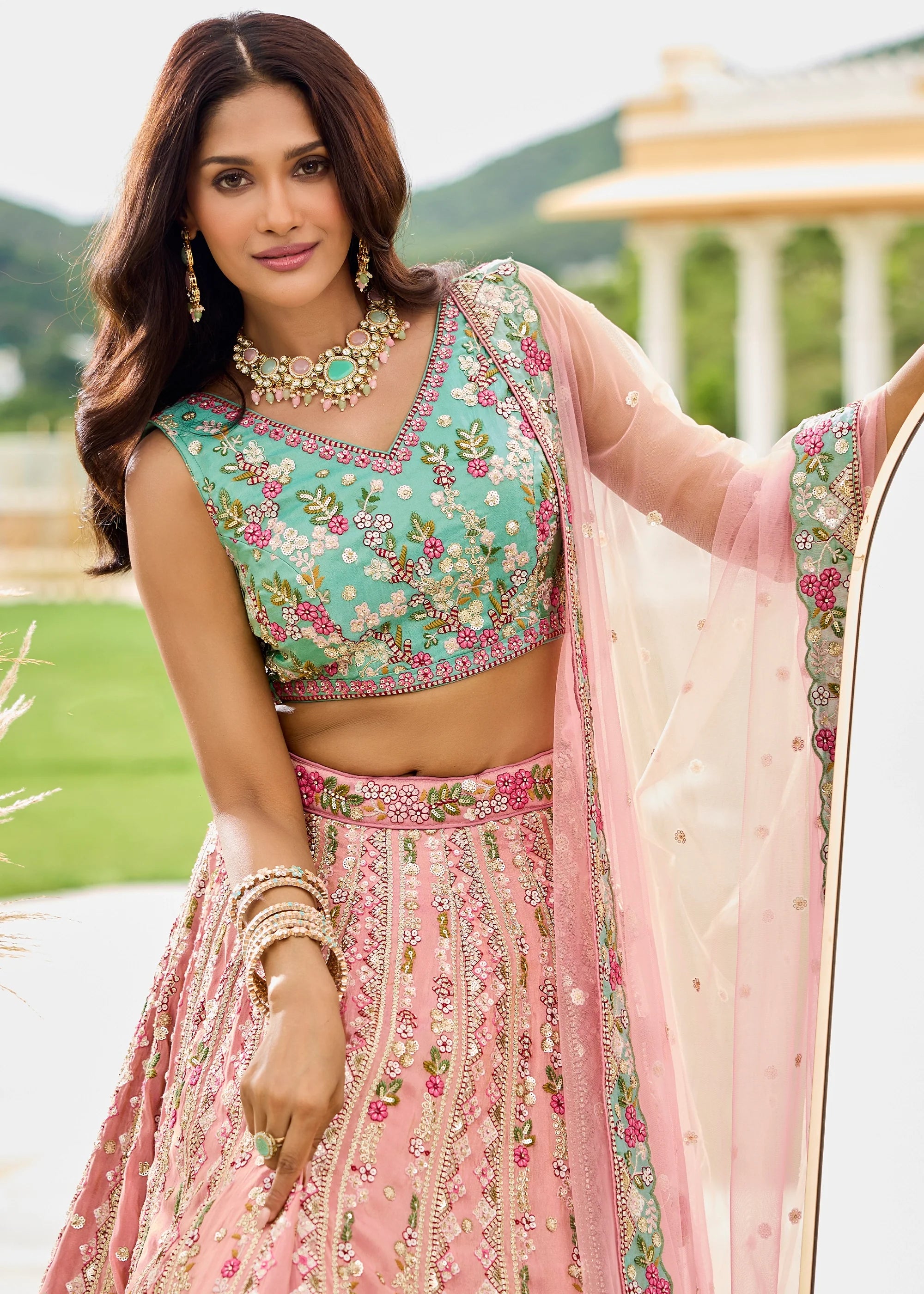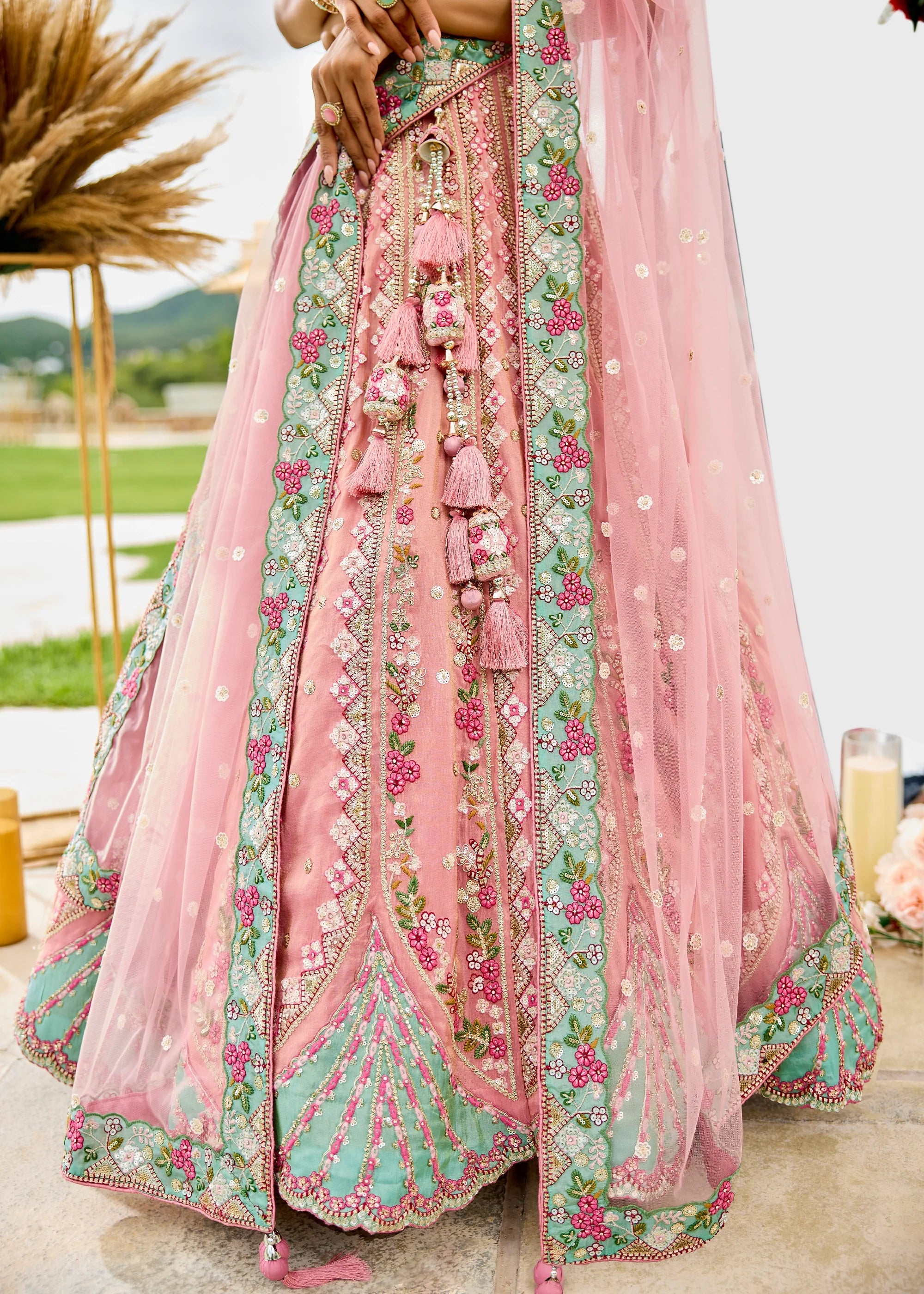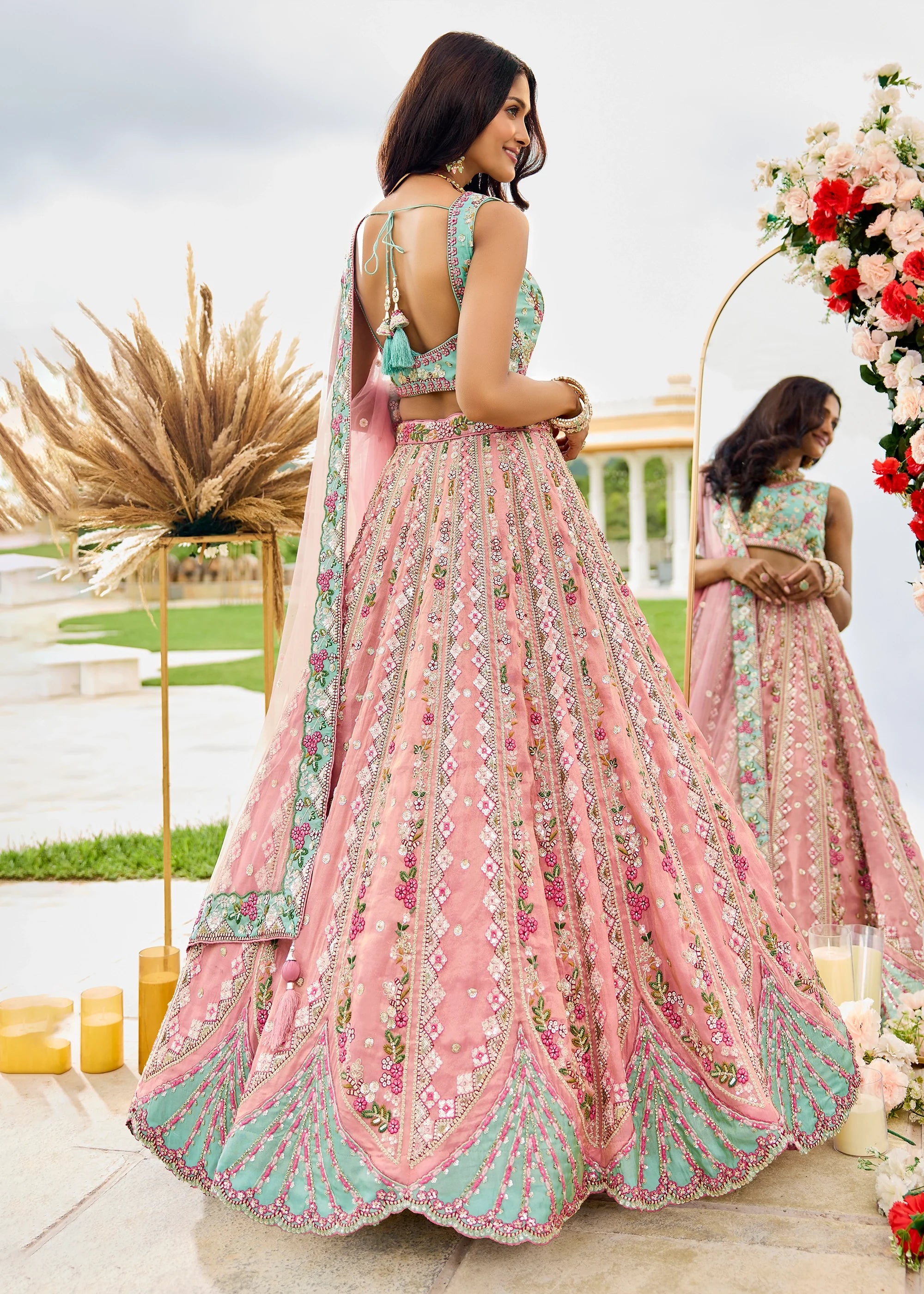 Elegant Pink Tissue Embroidered Wedding Lehenga
