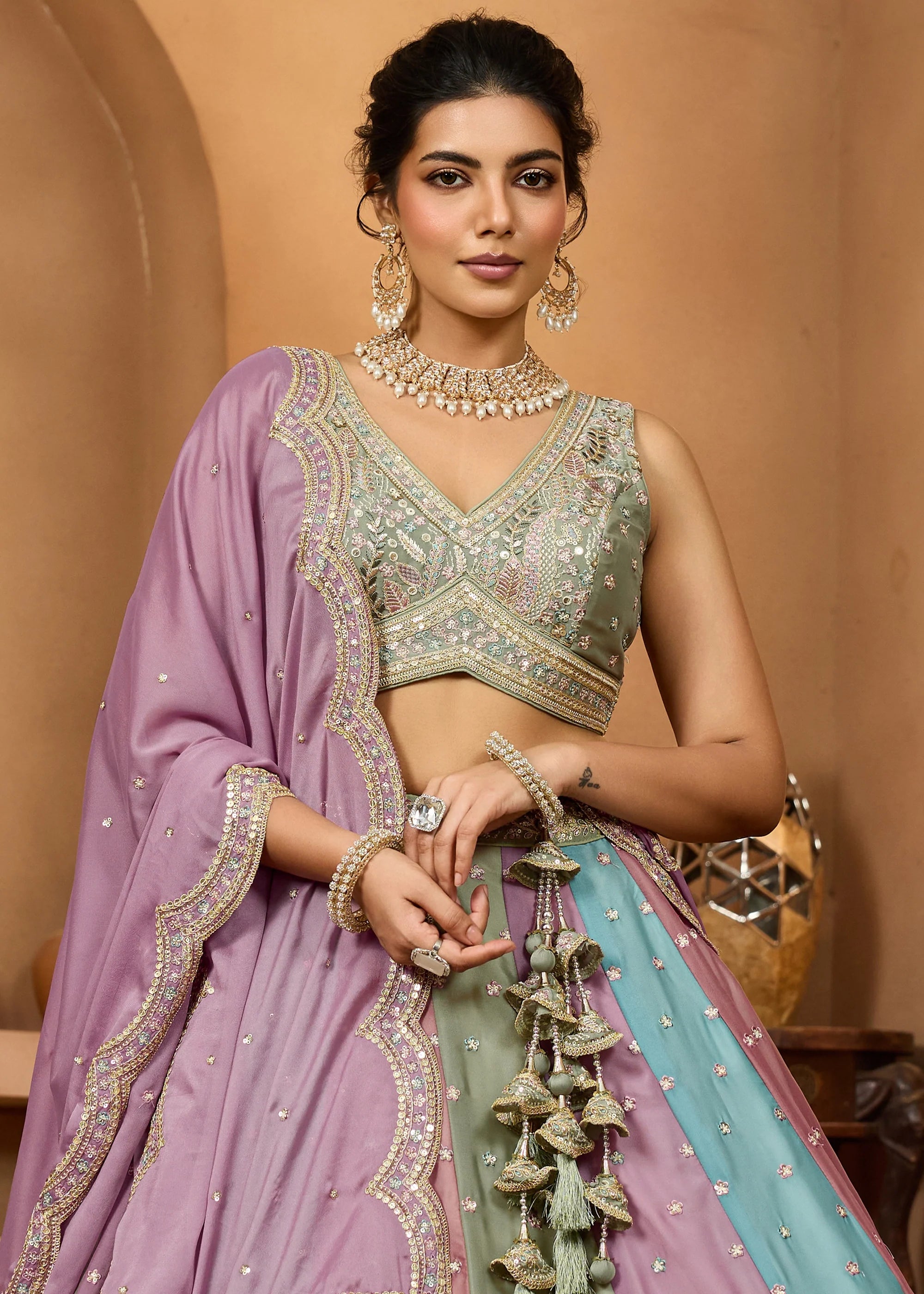 This stunning multi-color georgette lehenga choli features intricate sequin, stone, and thread embroidery work, perfect for festive occasions or weddings.