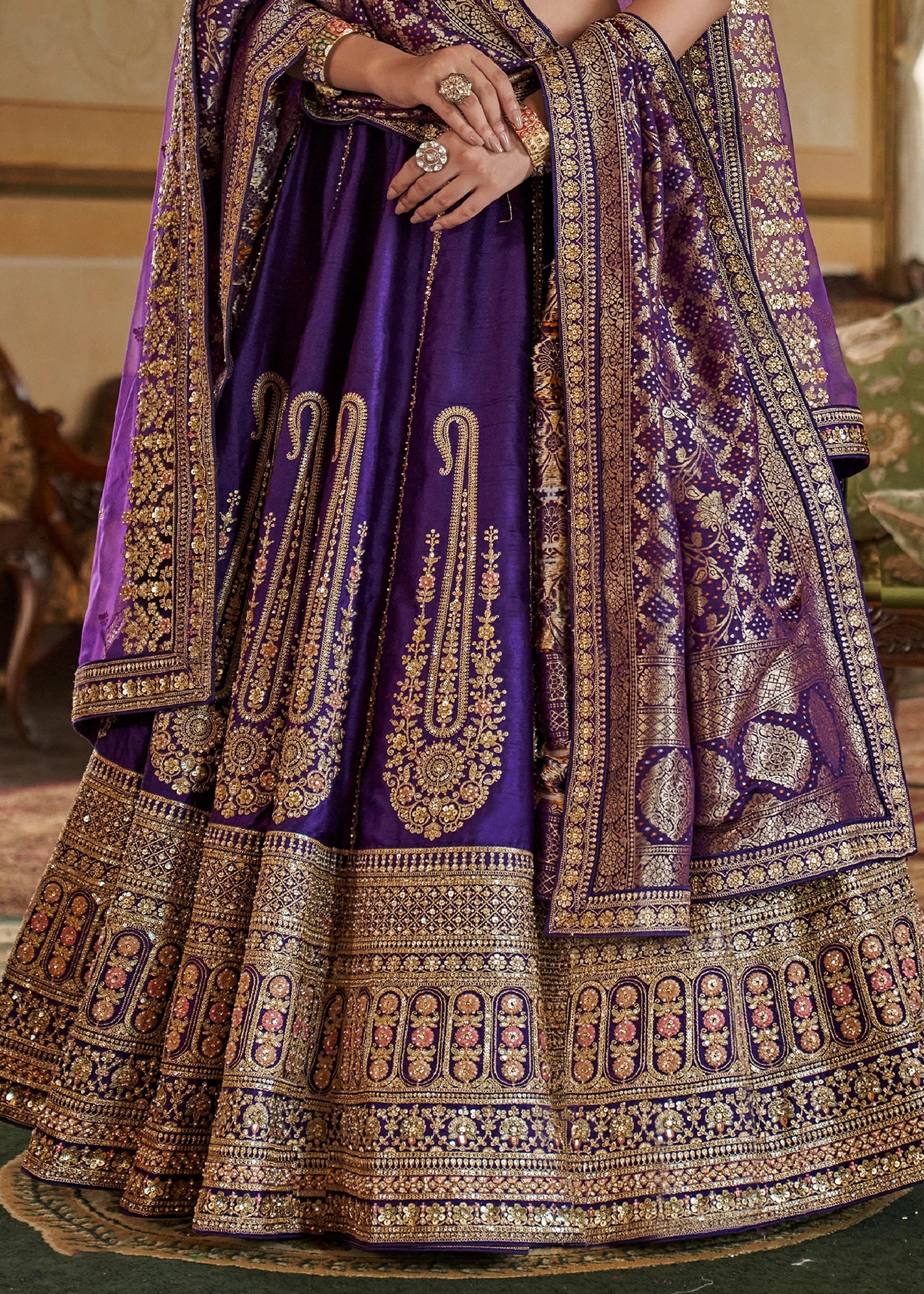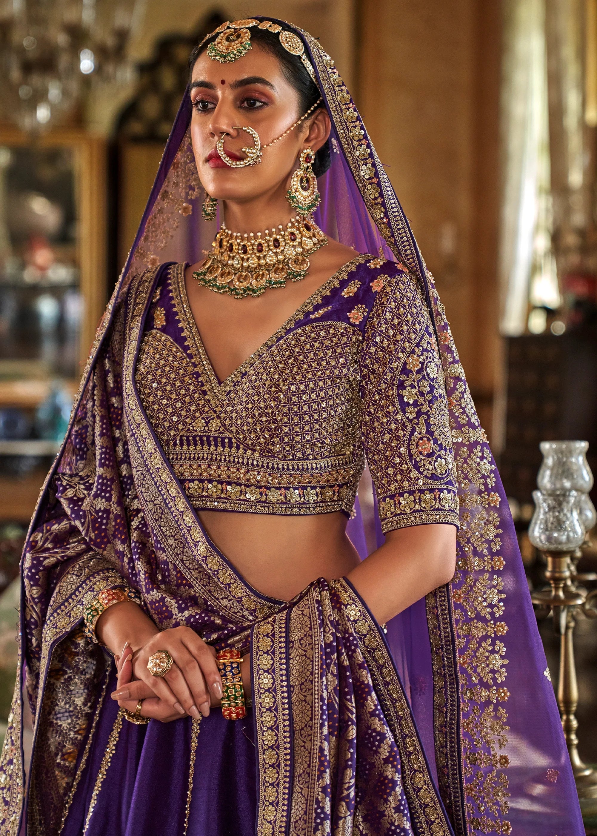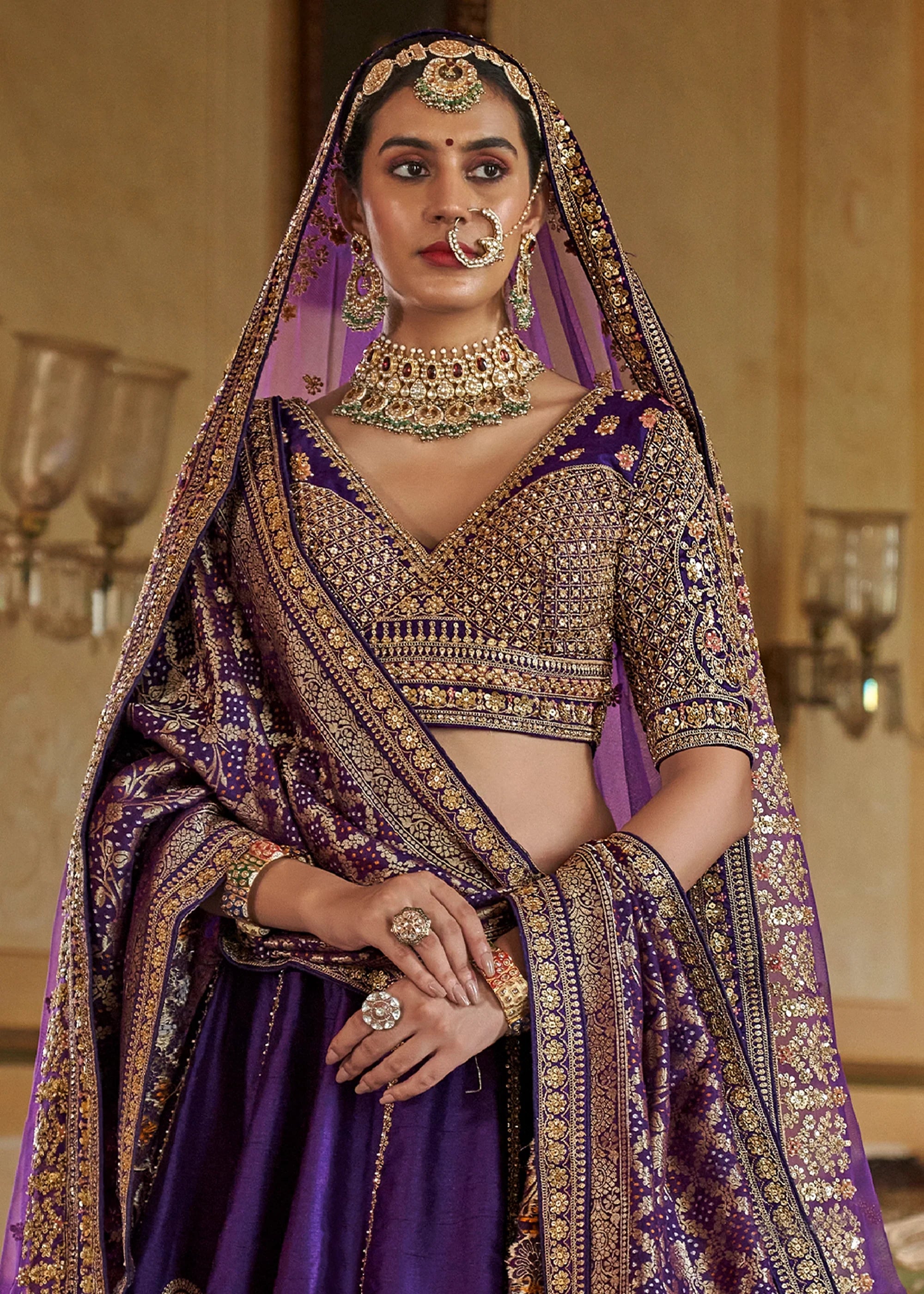 This stunning bridal silk lehenga choli is a masterpiece of traditional craftsmanship. Intricately decorated with heavy embroidery, sequins, and zari work, it is perfect for a memorable wedding look.