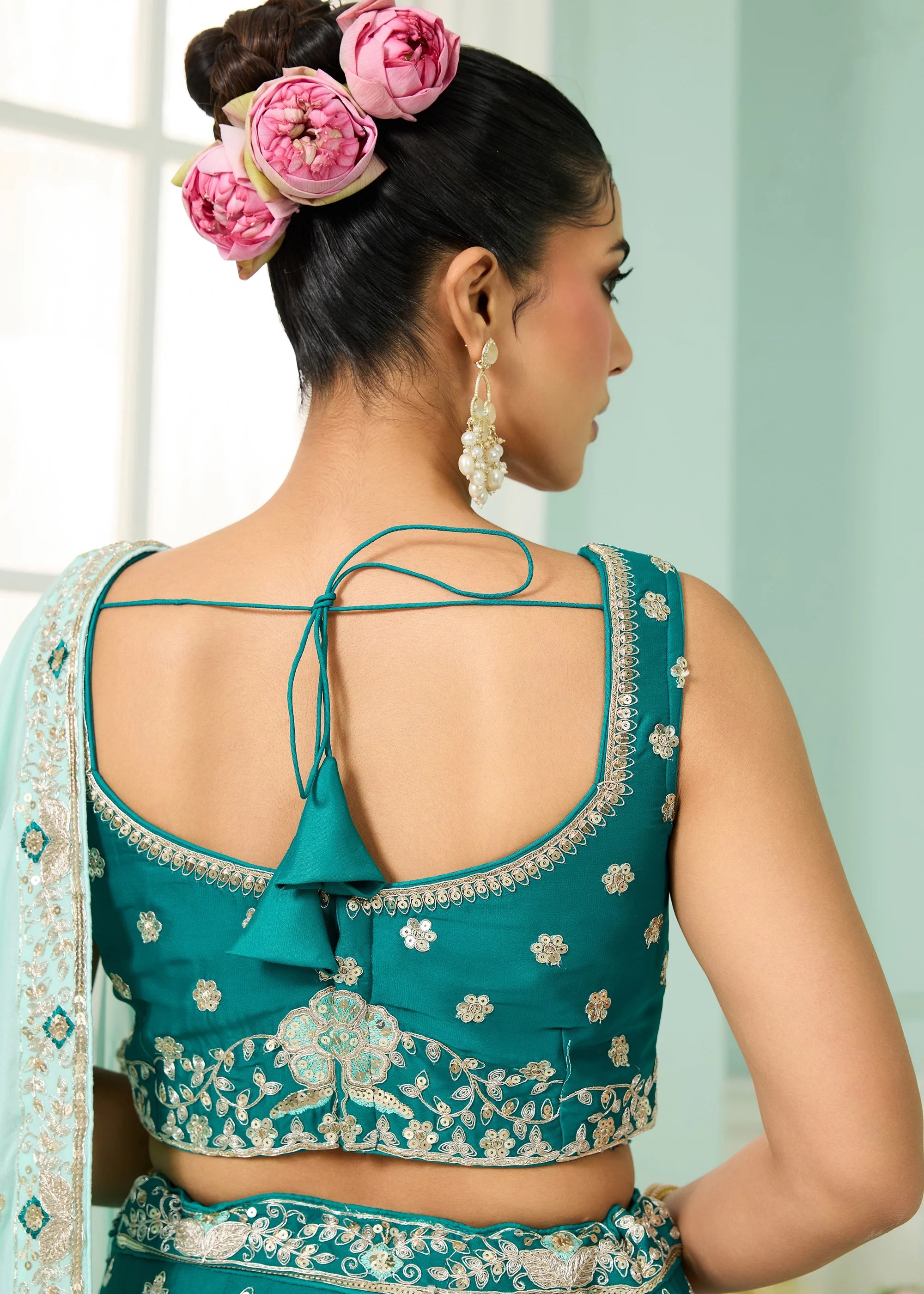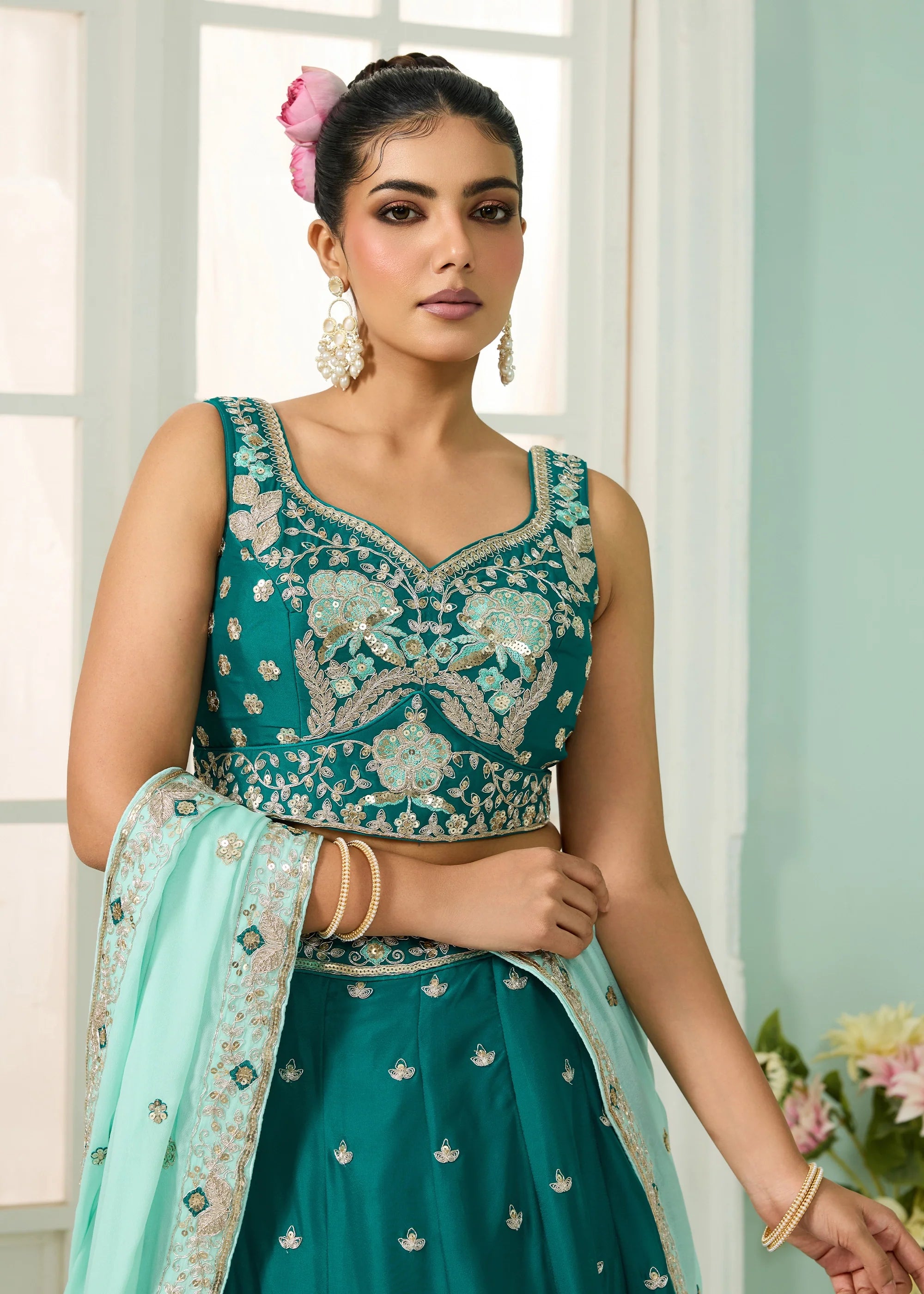 This stunning lehenga choli, crafted from silk, features intricate dori, embroidery, and sequins work. Paired with a delicate organza dupatta, it offers a striking and elegant look for festive occasions and weddings.