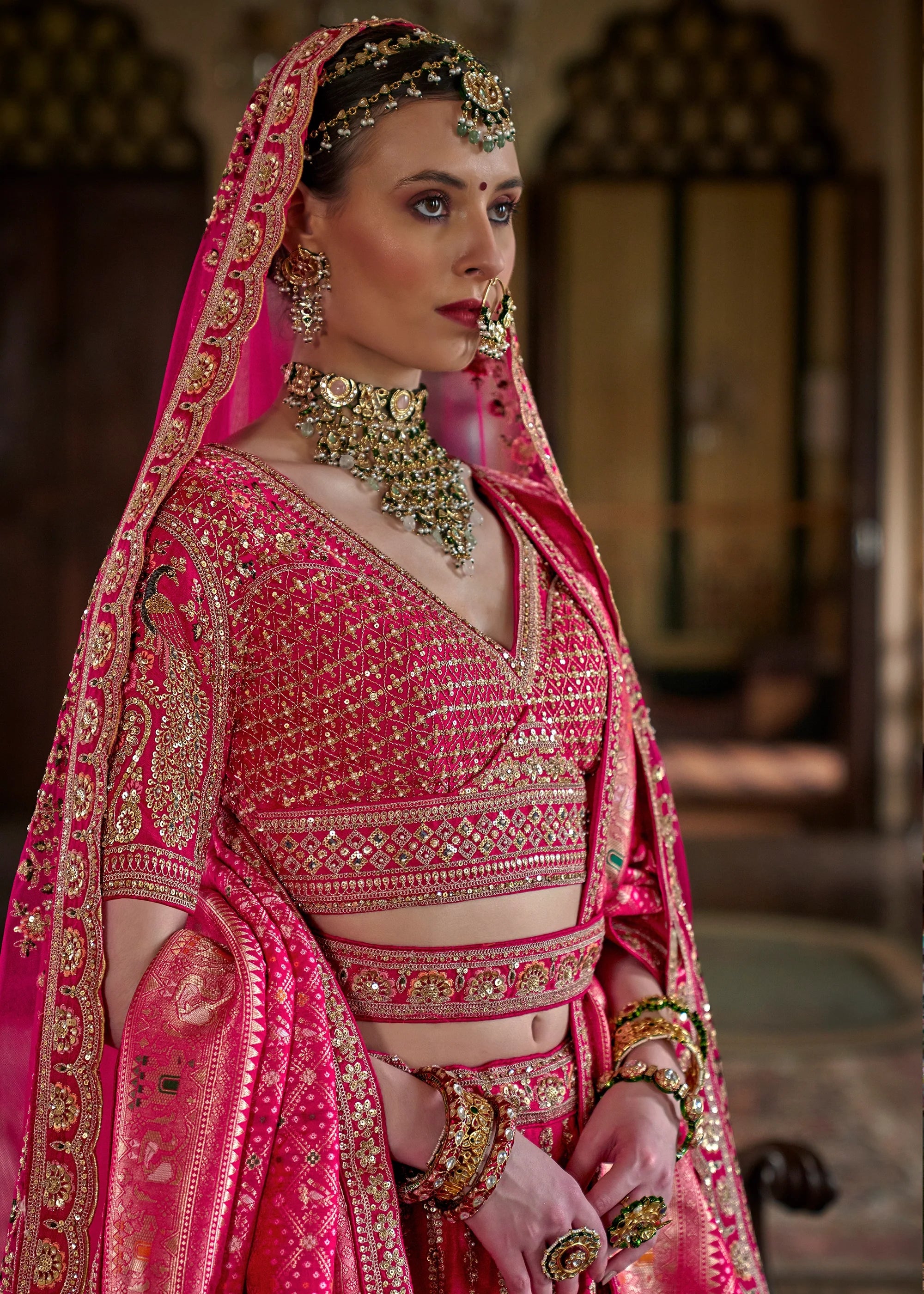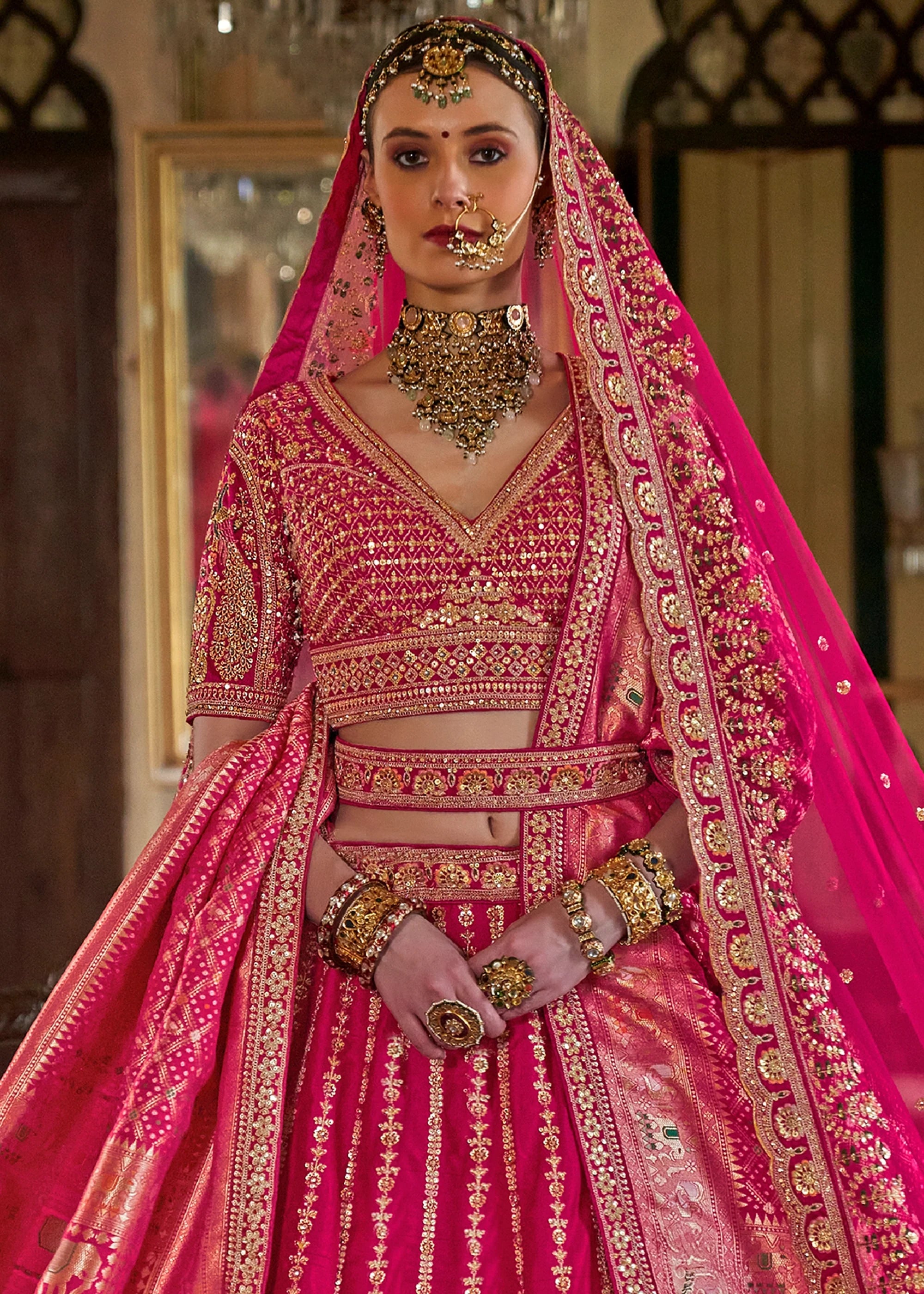 This stunning bridal silk lehenga choli is a masterpiece of traditional craftsmanship. Intricately decorated with heavy embroidery, sequins, and zari work, it is perfect for a memorable wedding look.