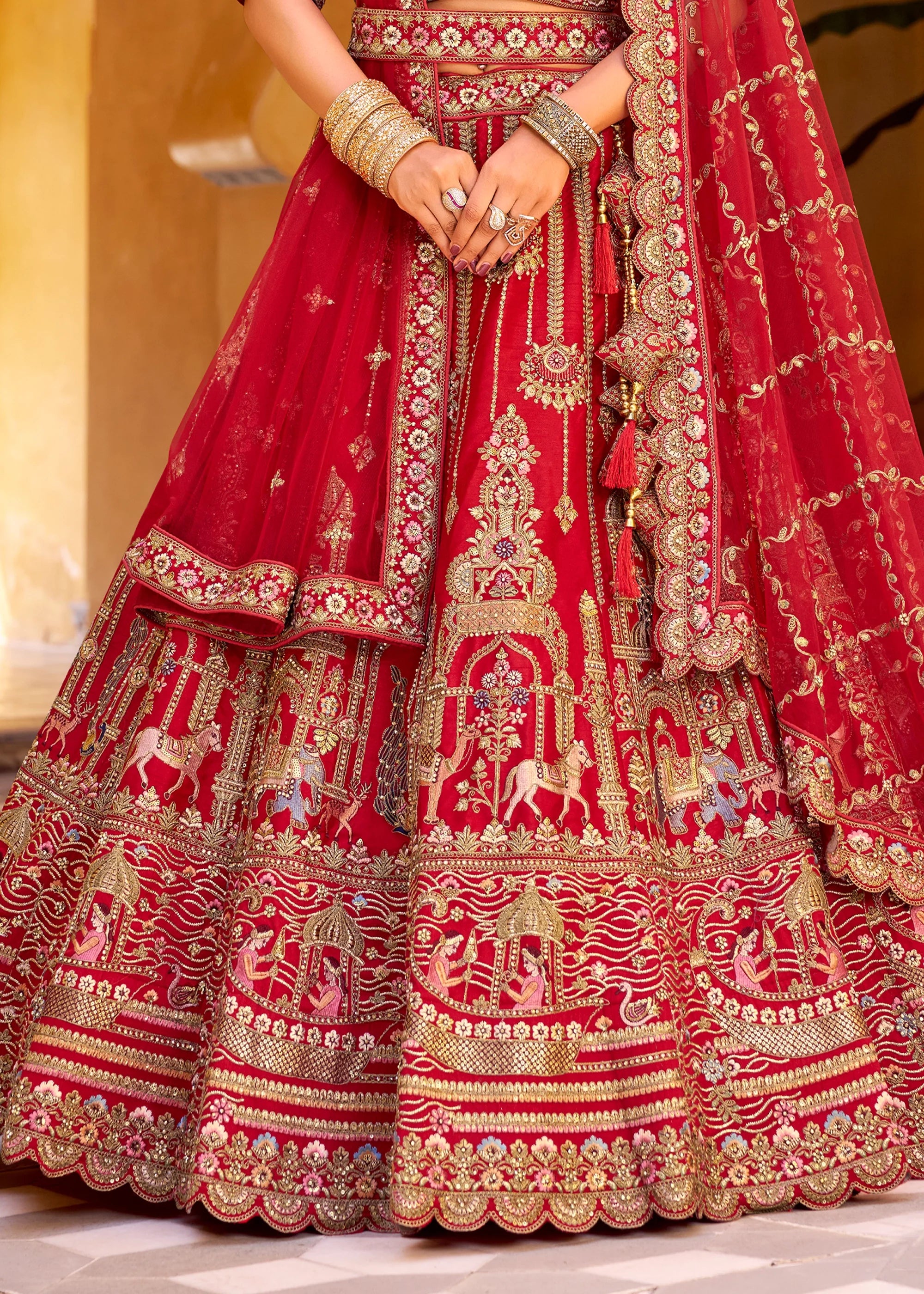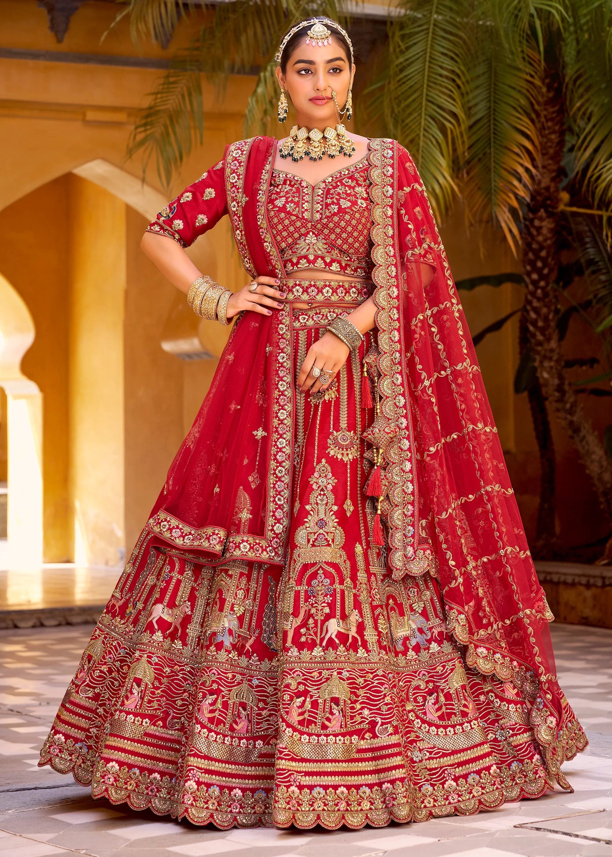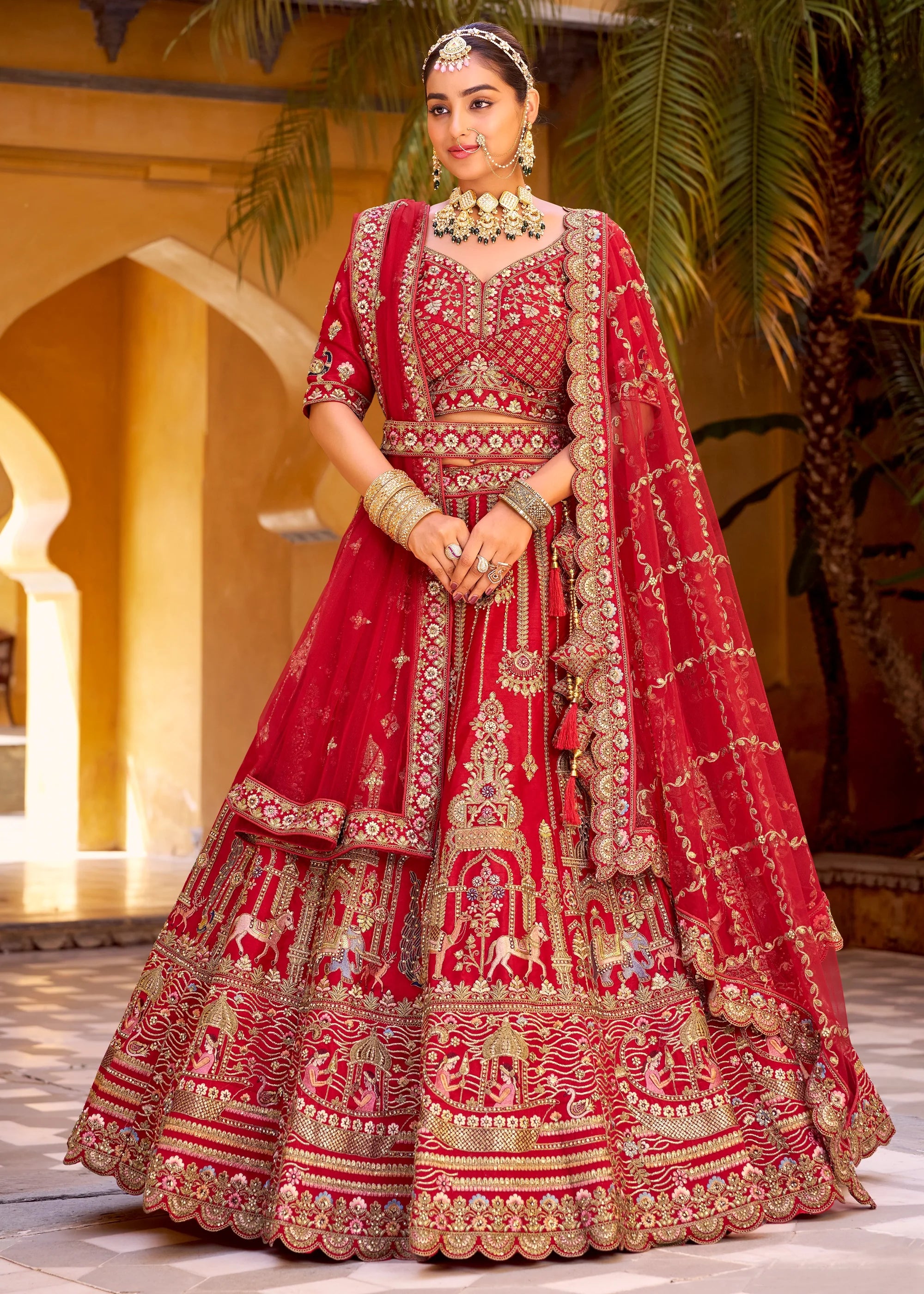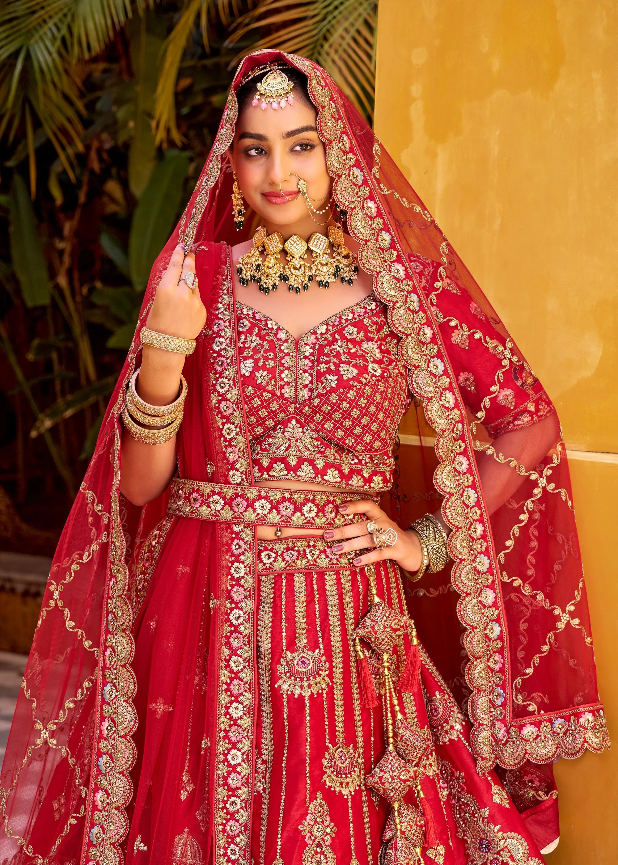This is soft silk bridal lehenga choli featuring intricate embroidery with zari, resham, stones, and mirror work. The ensemble includes a matching choli and a double dupatta, creating a stunning and traditional look.