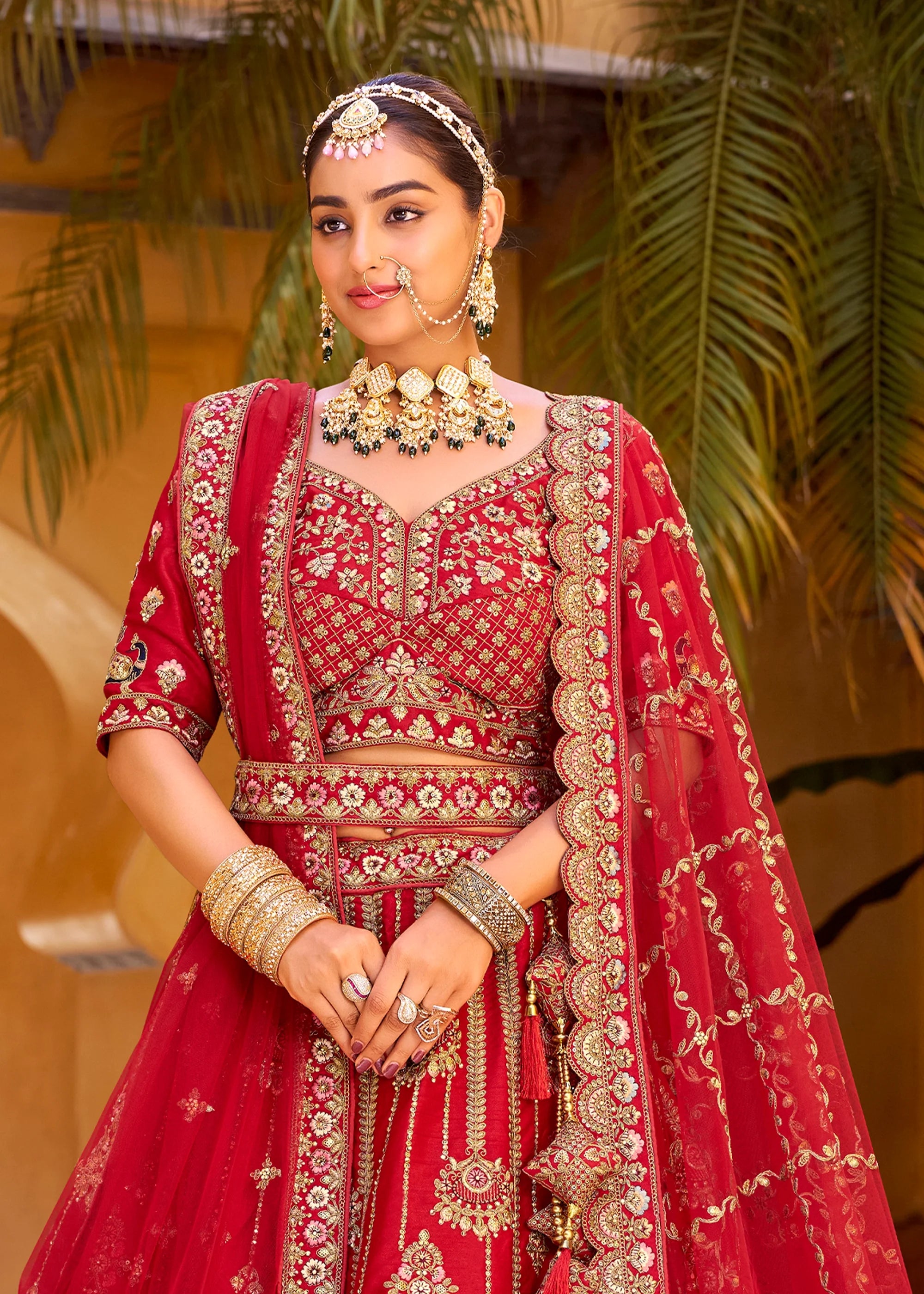 This is soft silk bridal lehenga choli featuring intricate embroidery with zari, resham, stones, and mirror work. The ensemble includes a...