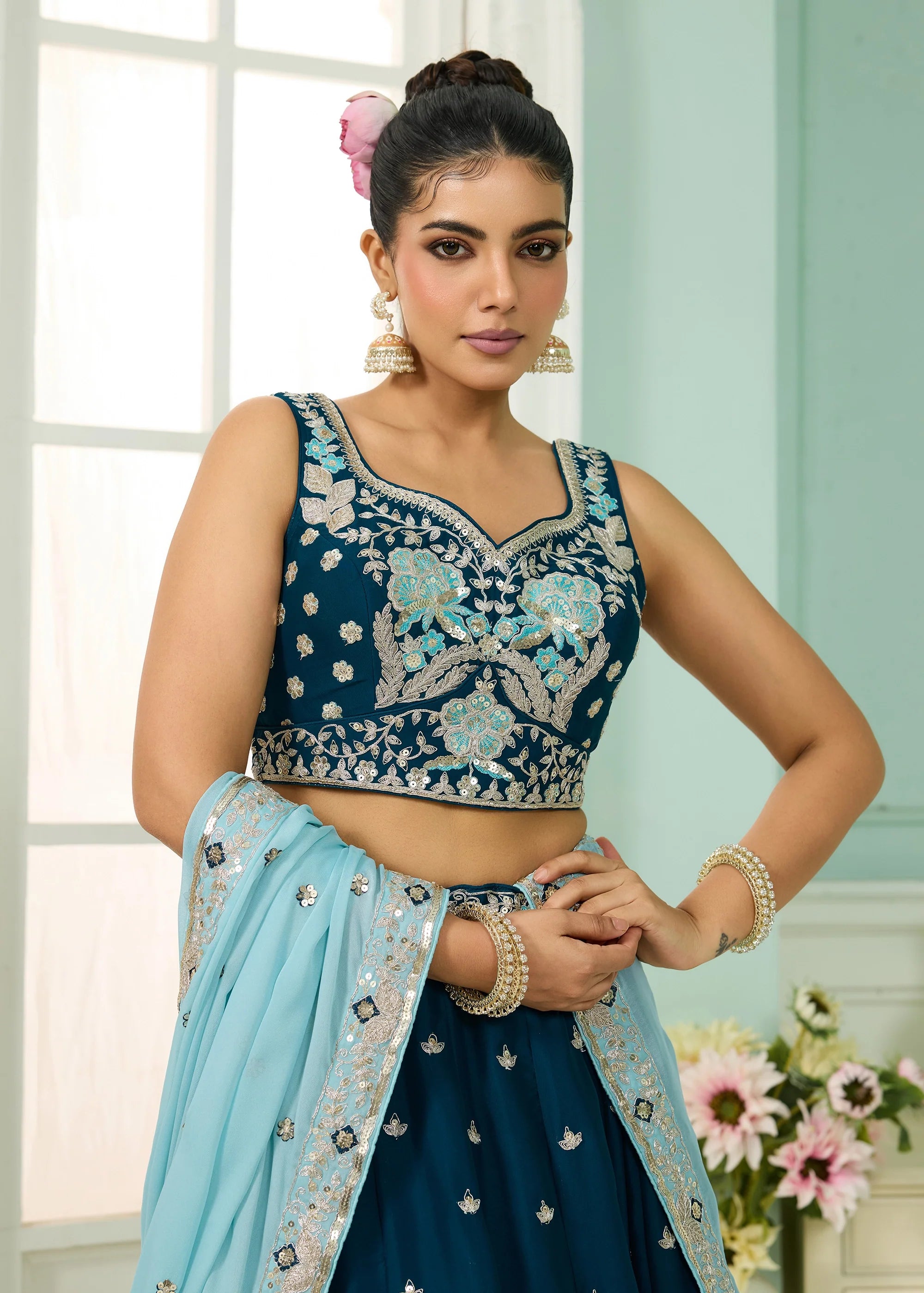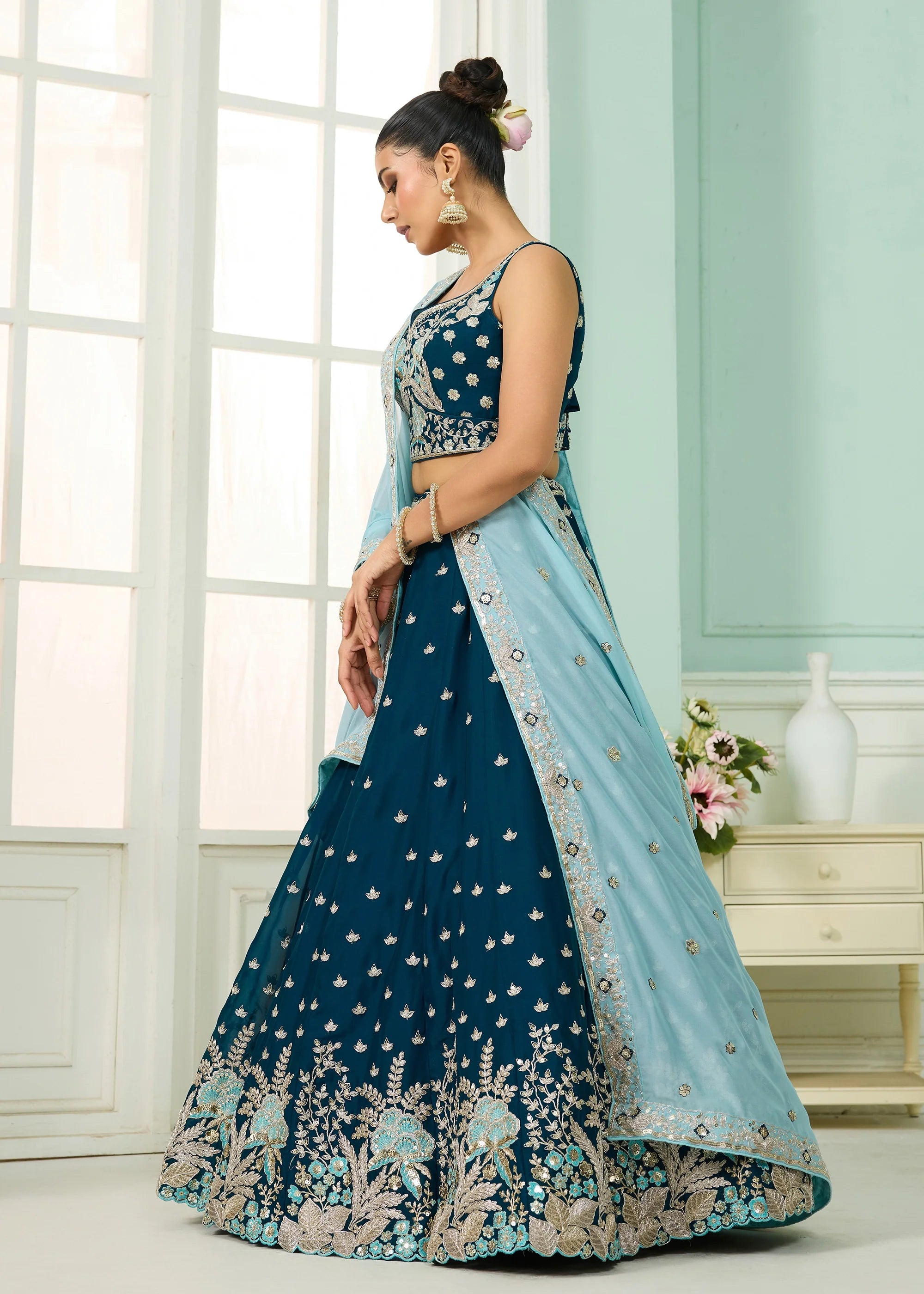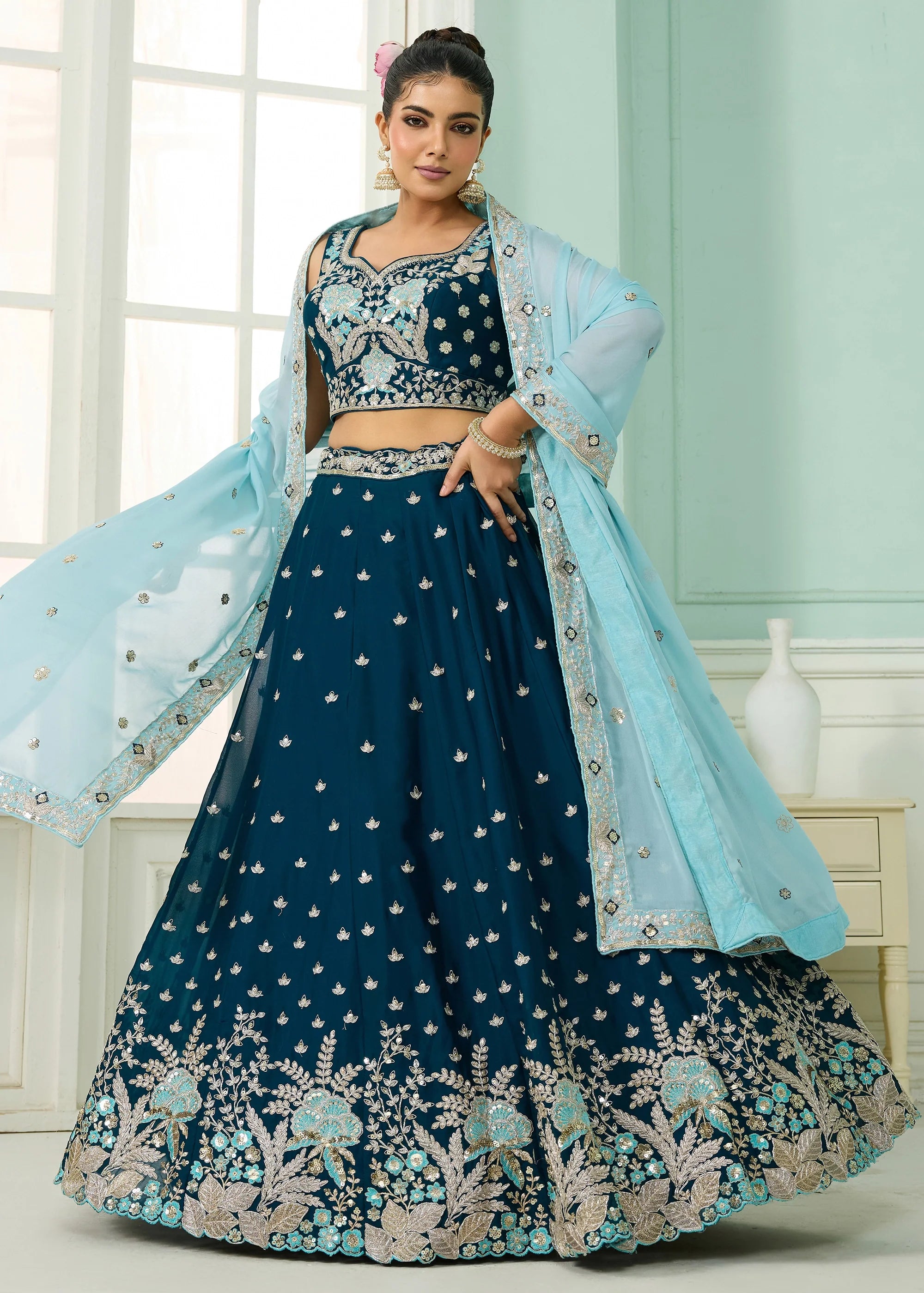 Teal Blue Georgette Embroidered Sequins Lehenga Set