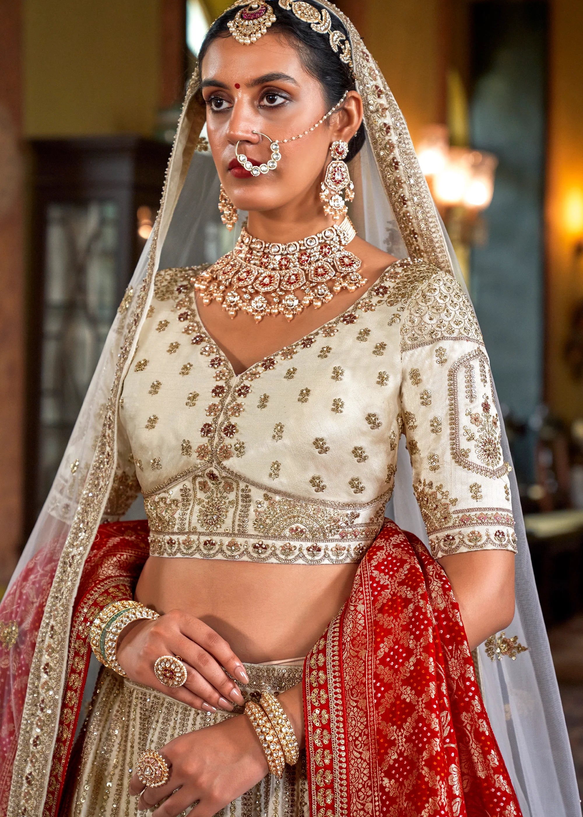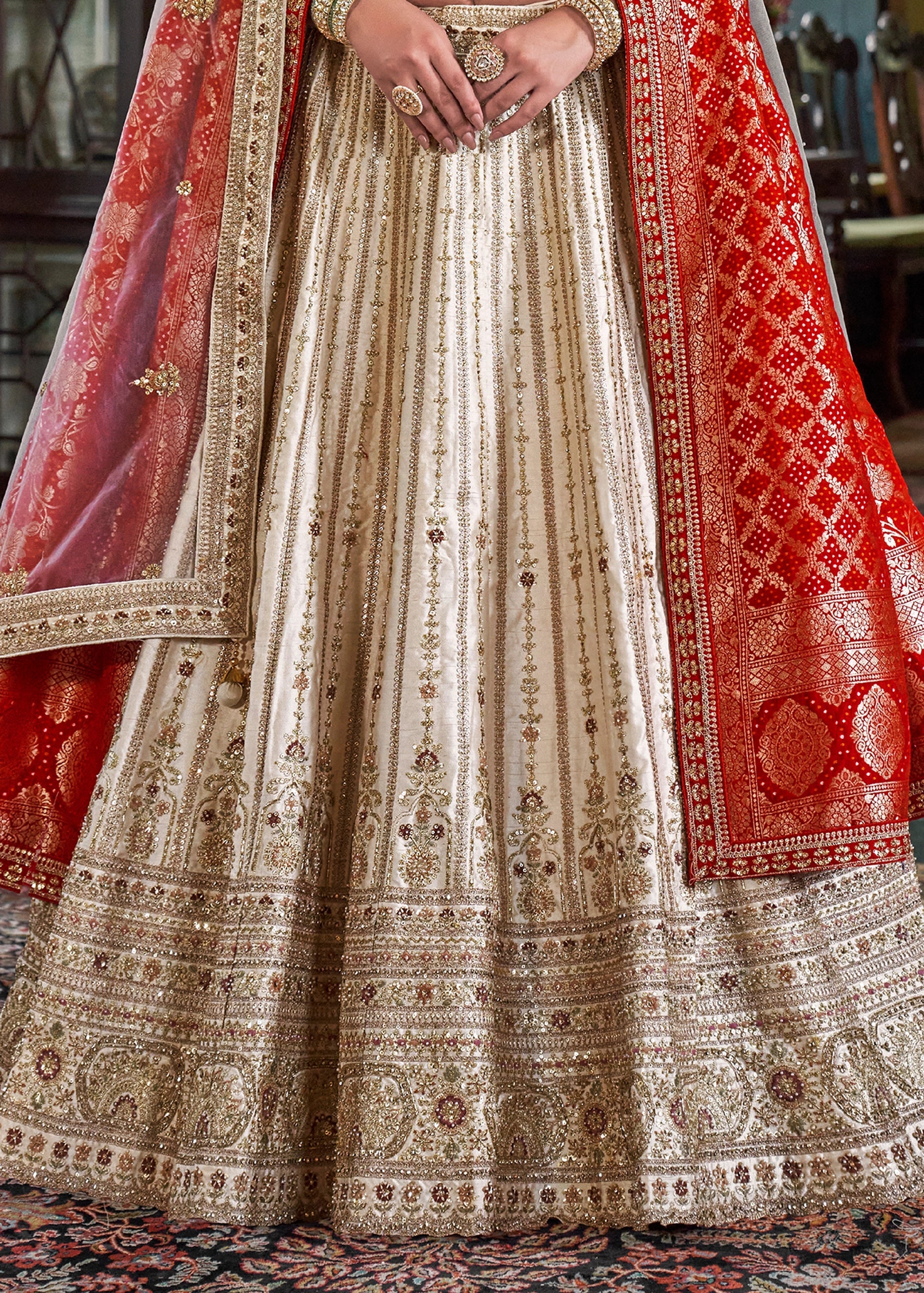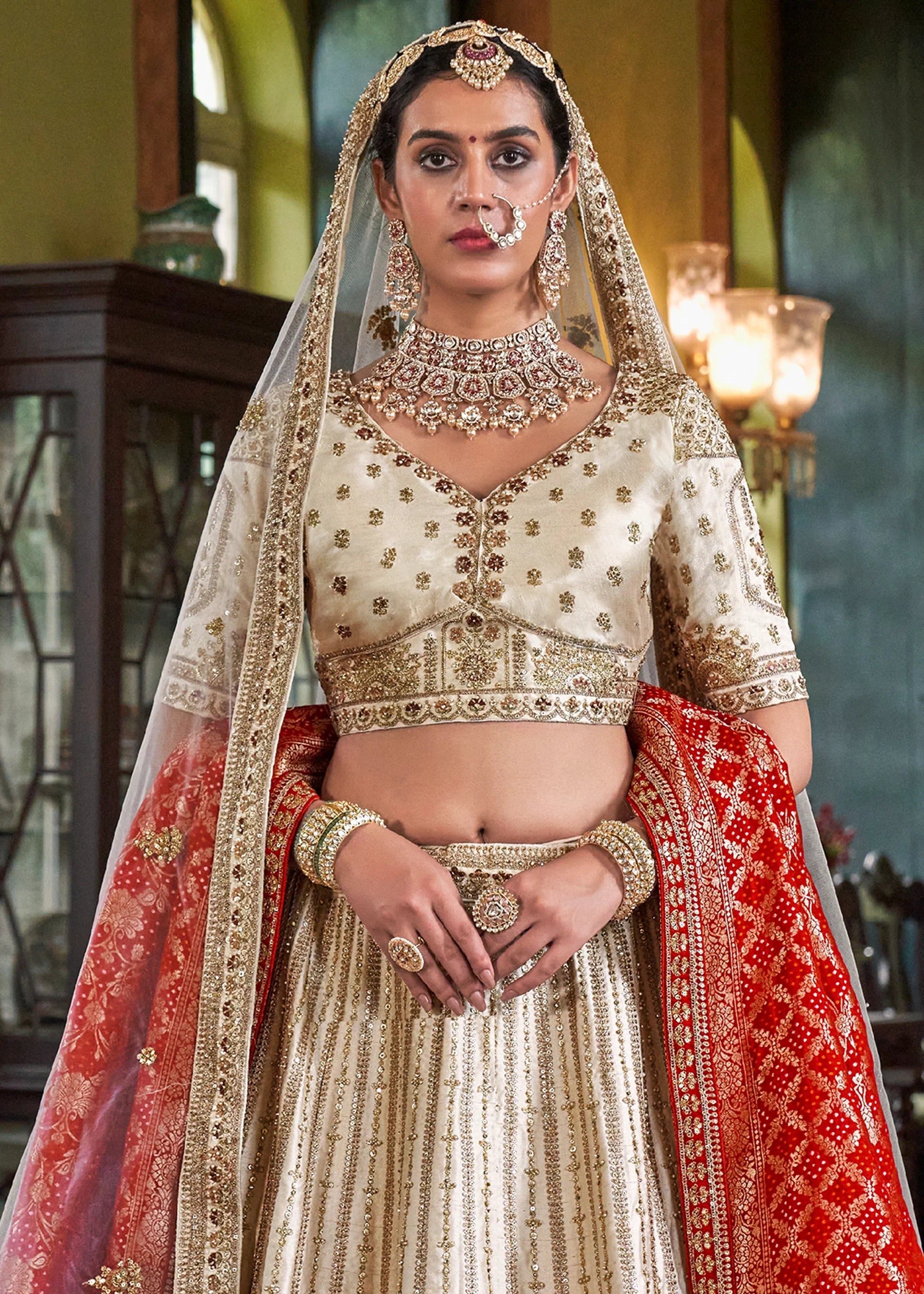 This elegant semi-stitched bridal lehenga in silk is enhanced with delicate thread woven details, shimmering sequins, gleaming zari, and bead embellishments for a luxurious appeal. It features a contrasting red Banarasi silk dupatta, perfect for special occasions.