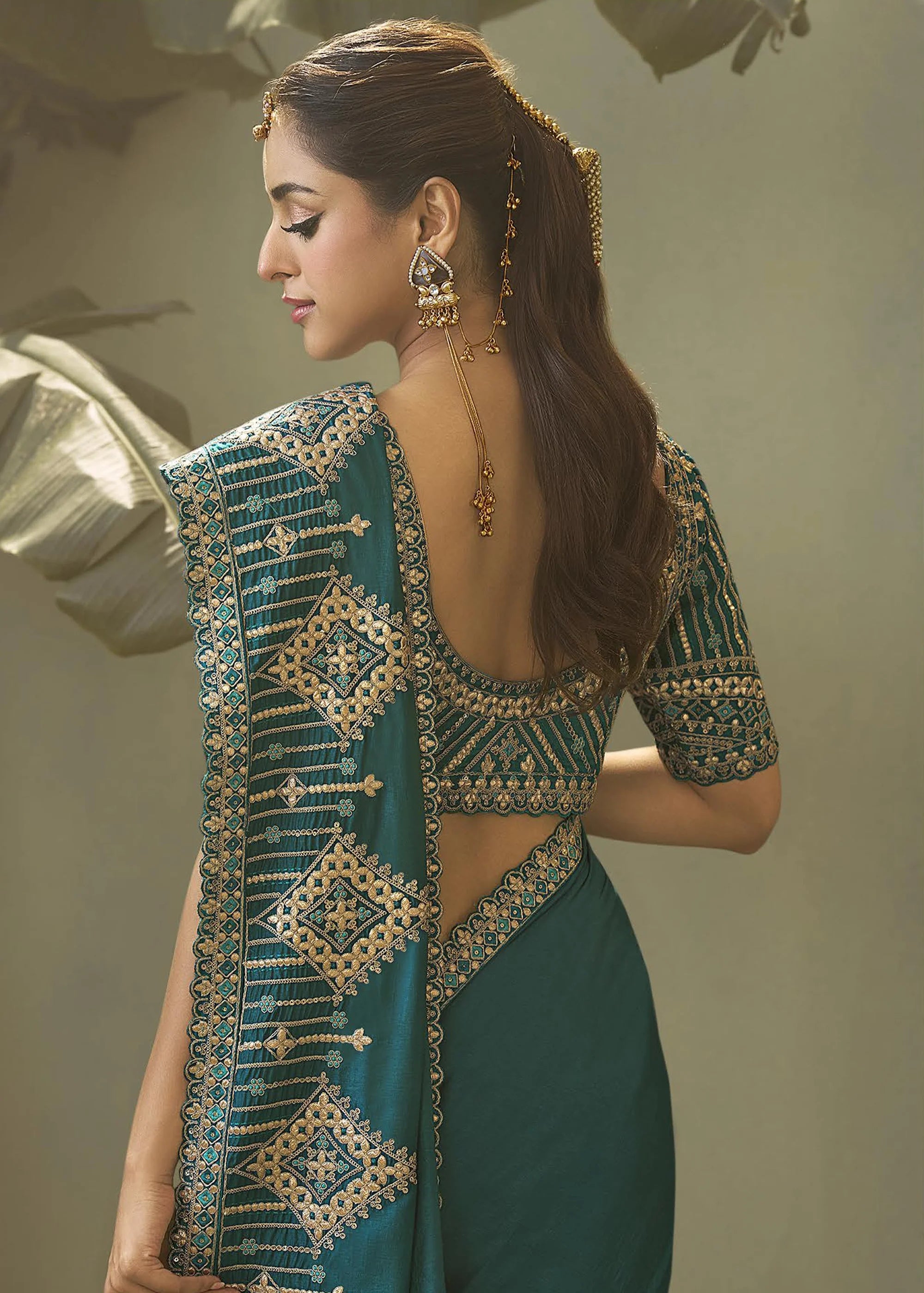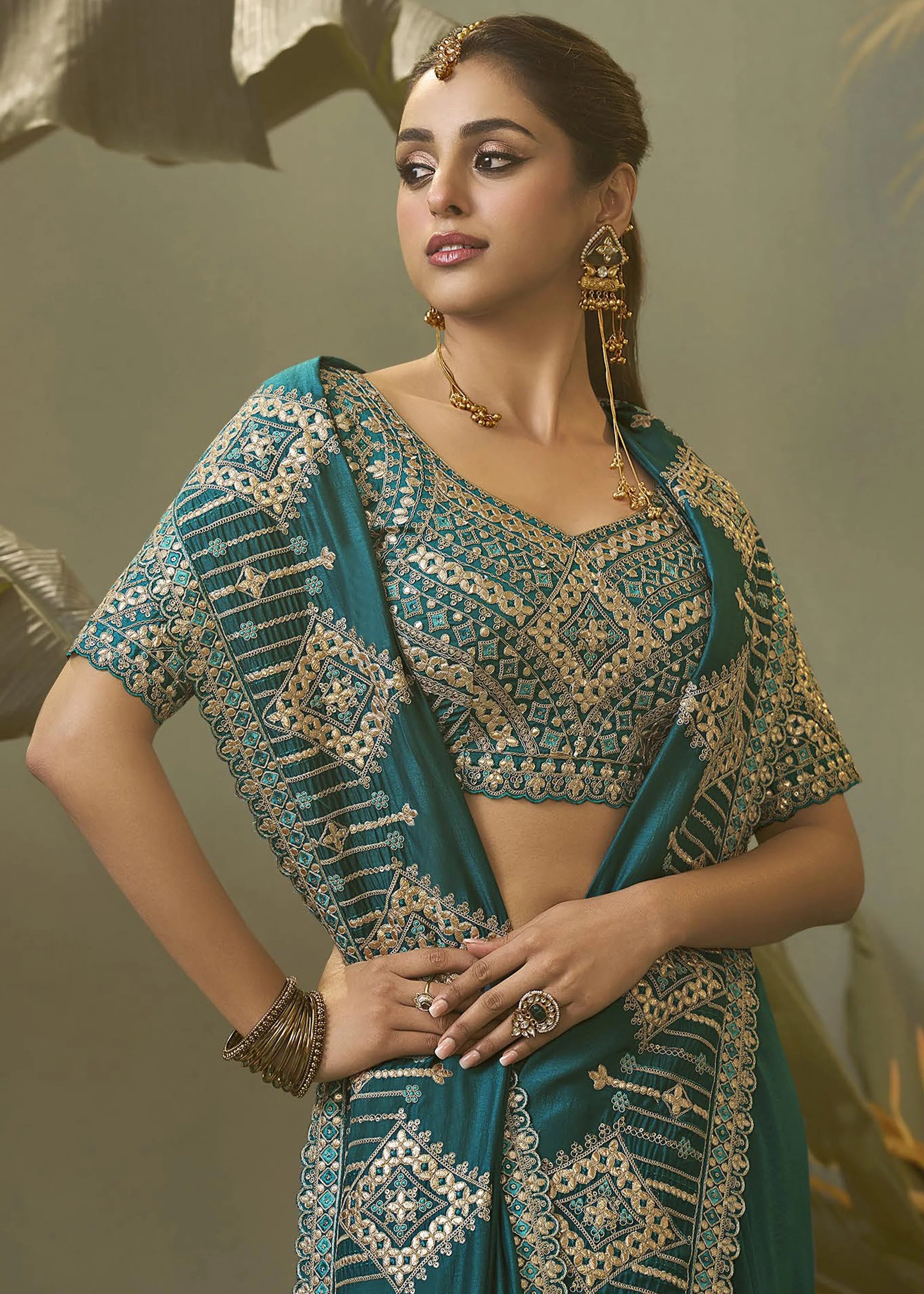 A stunning woman models an elegant saree. The vibrant garment is adorned with intricate gold zari work along its border and on the matching embroidered blouse, ideal for any special occasion.