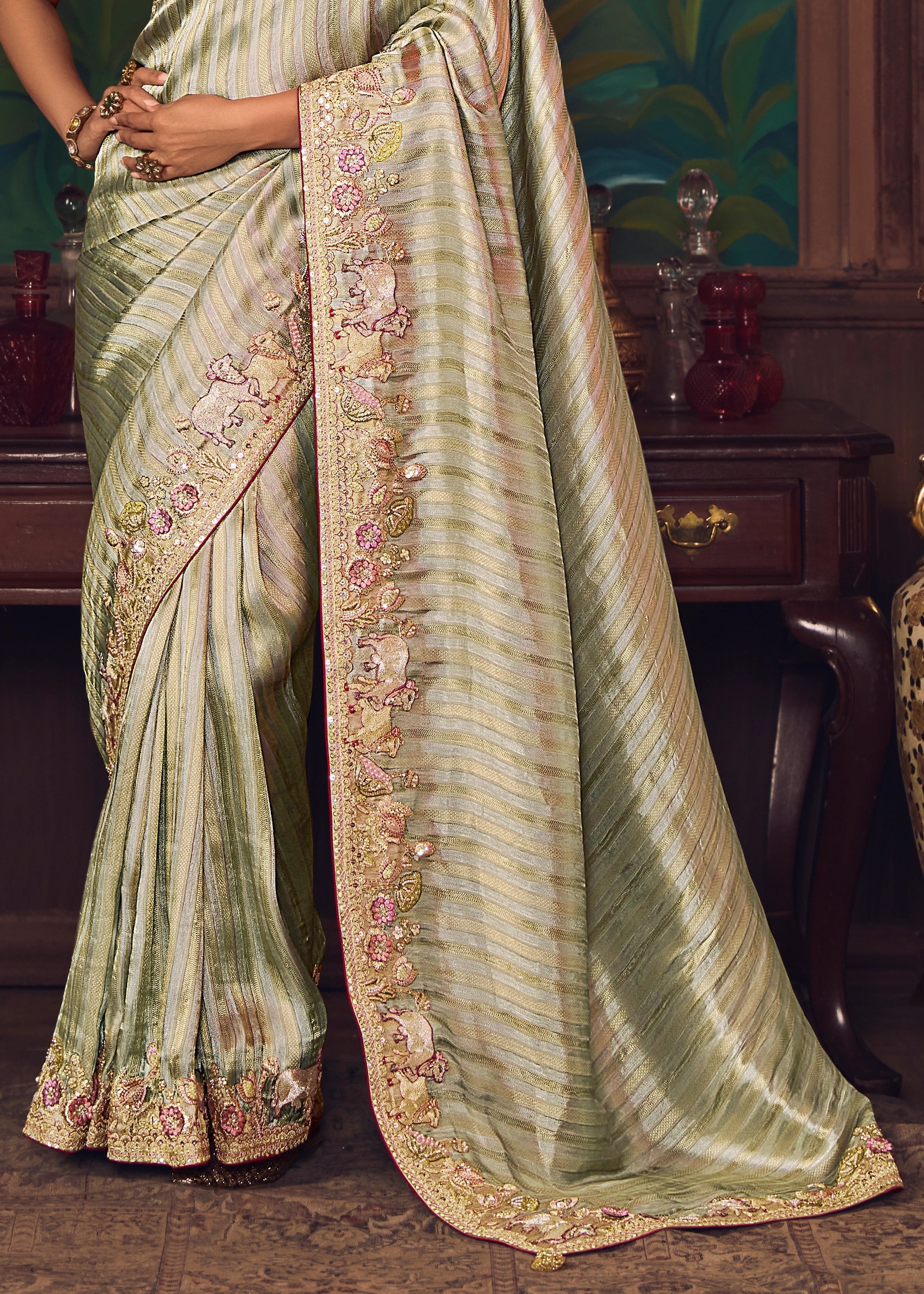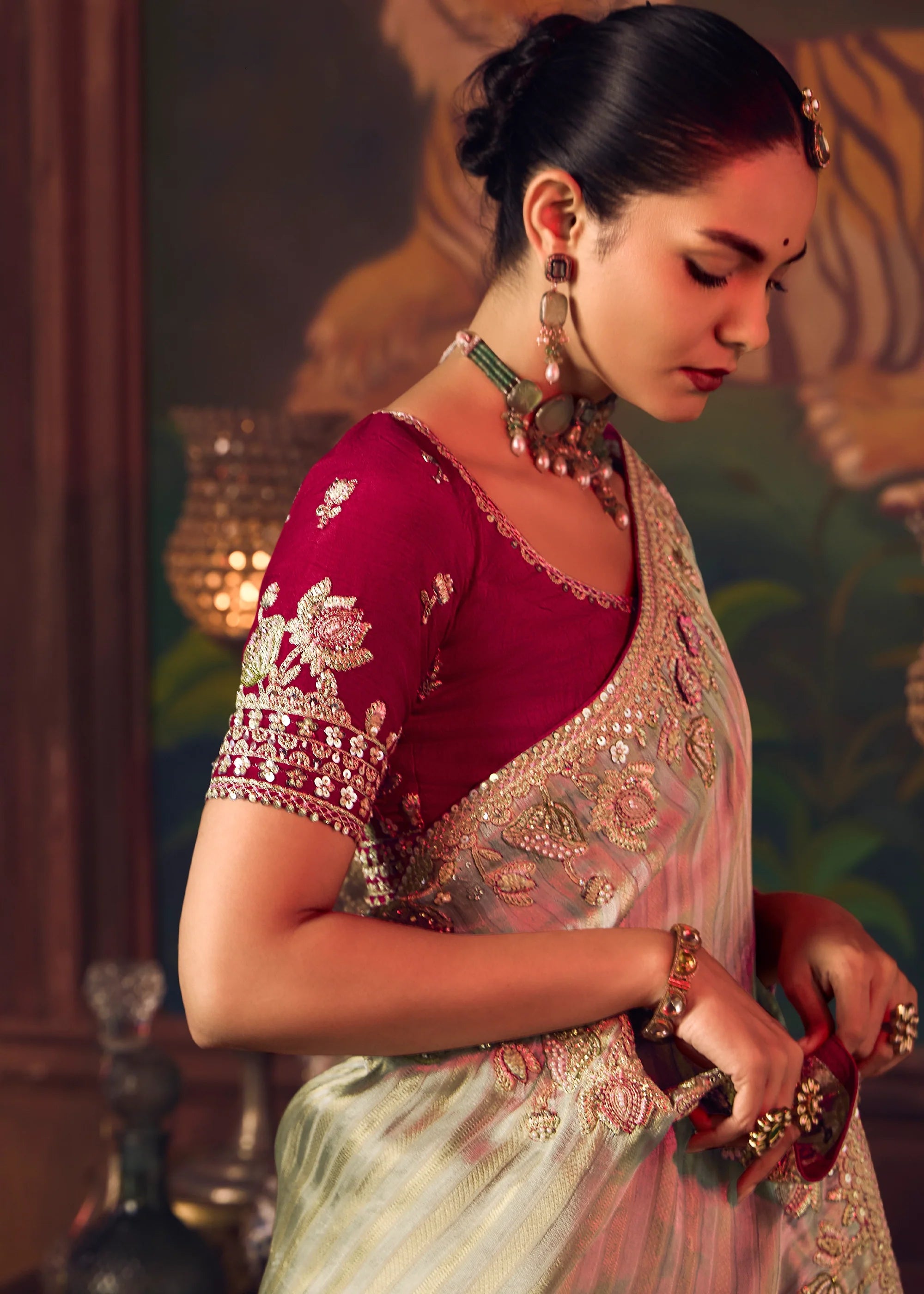 A stunning model in a lustrous saree with intricate multi-colored thread work and zari embroidery, paired with a rich, contrasting blouse. The elegant design and opulent fabric make it perfect for grand wedding events and formal reception