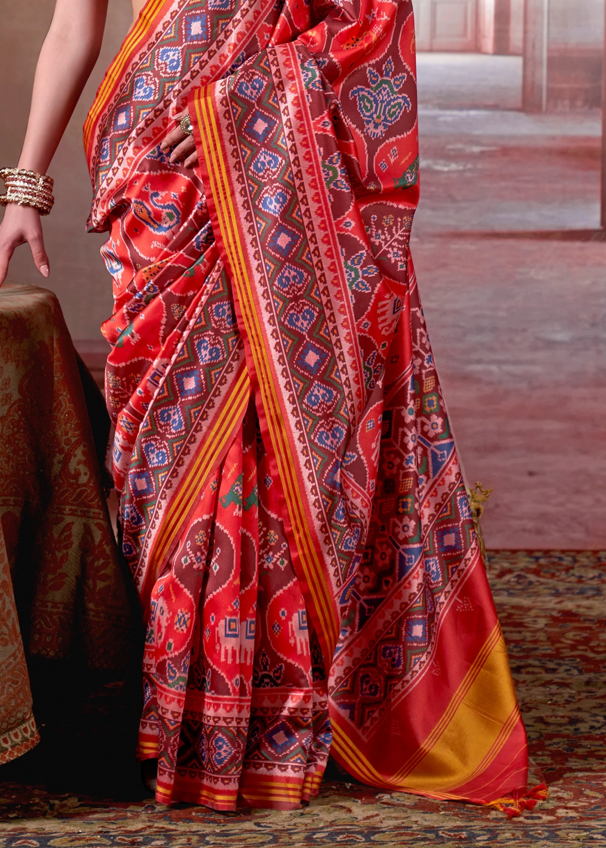 Experience the artistry of Patola in a modern form. This saree beautifully replicates the intricate double ikat weaving technique, resulting in mesmerizing patterns and a luxurious feel. The vibrant colors and elegant drape make it a truly special piece.