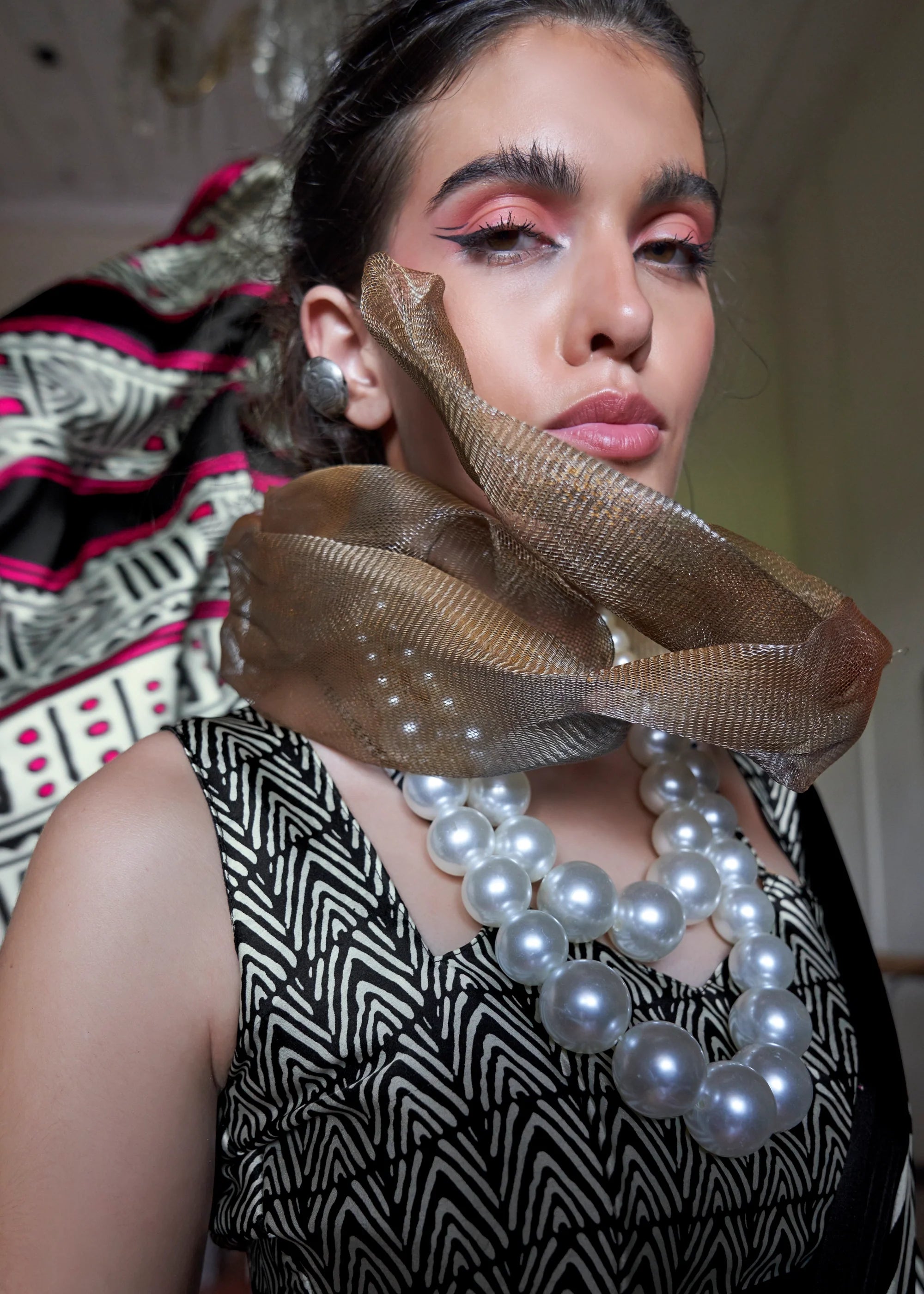 This elegant Modal Satin Print Saree features a striking black and white geometric pattern with vibrant pink accents along the...