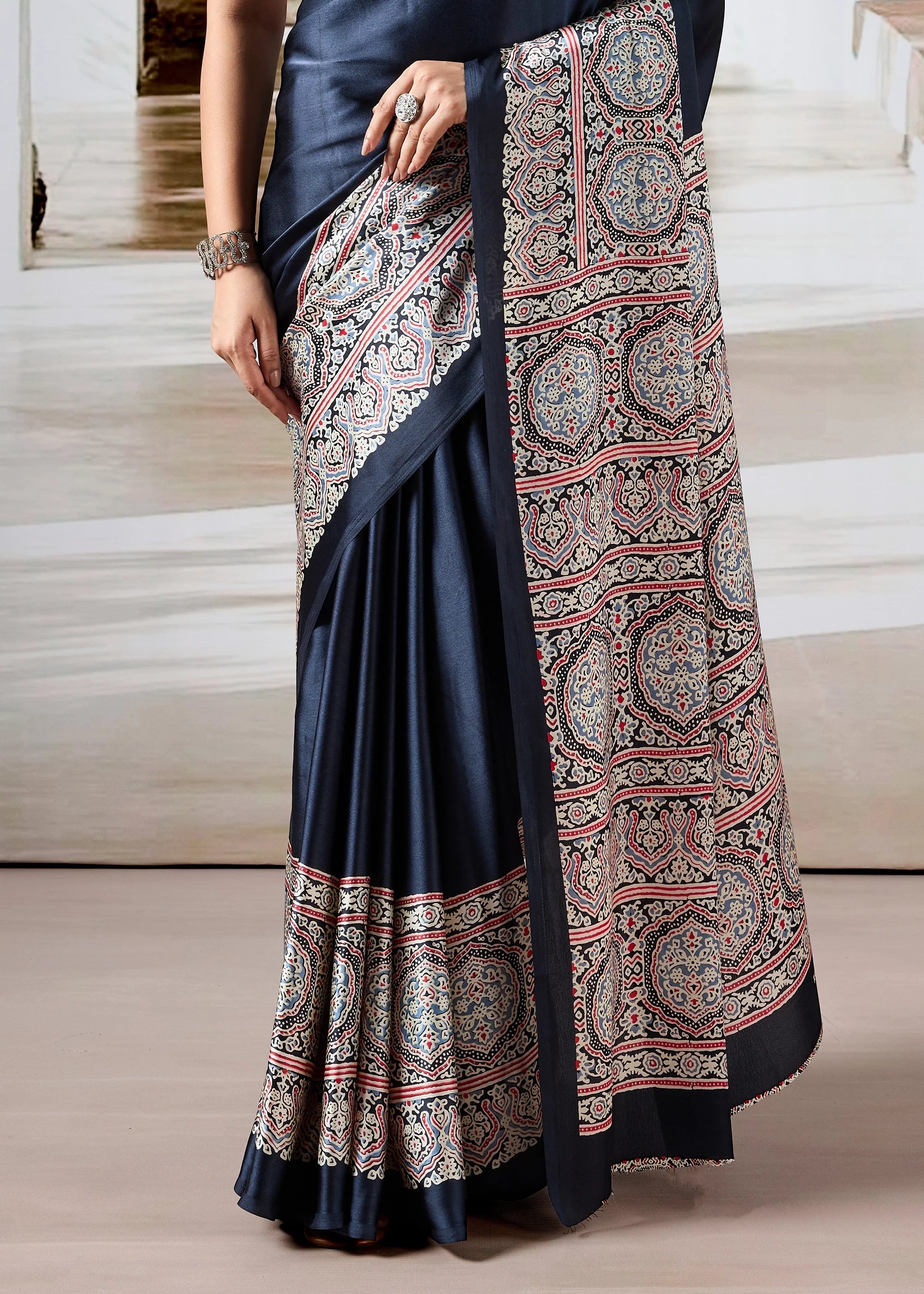 Medieval Blue Printed Satin Silk Saree