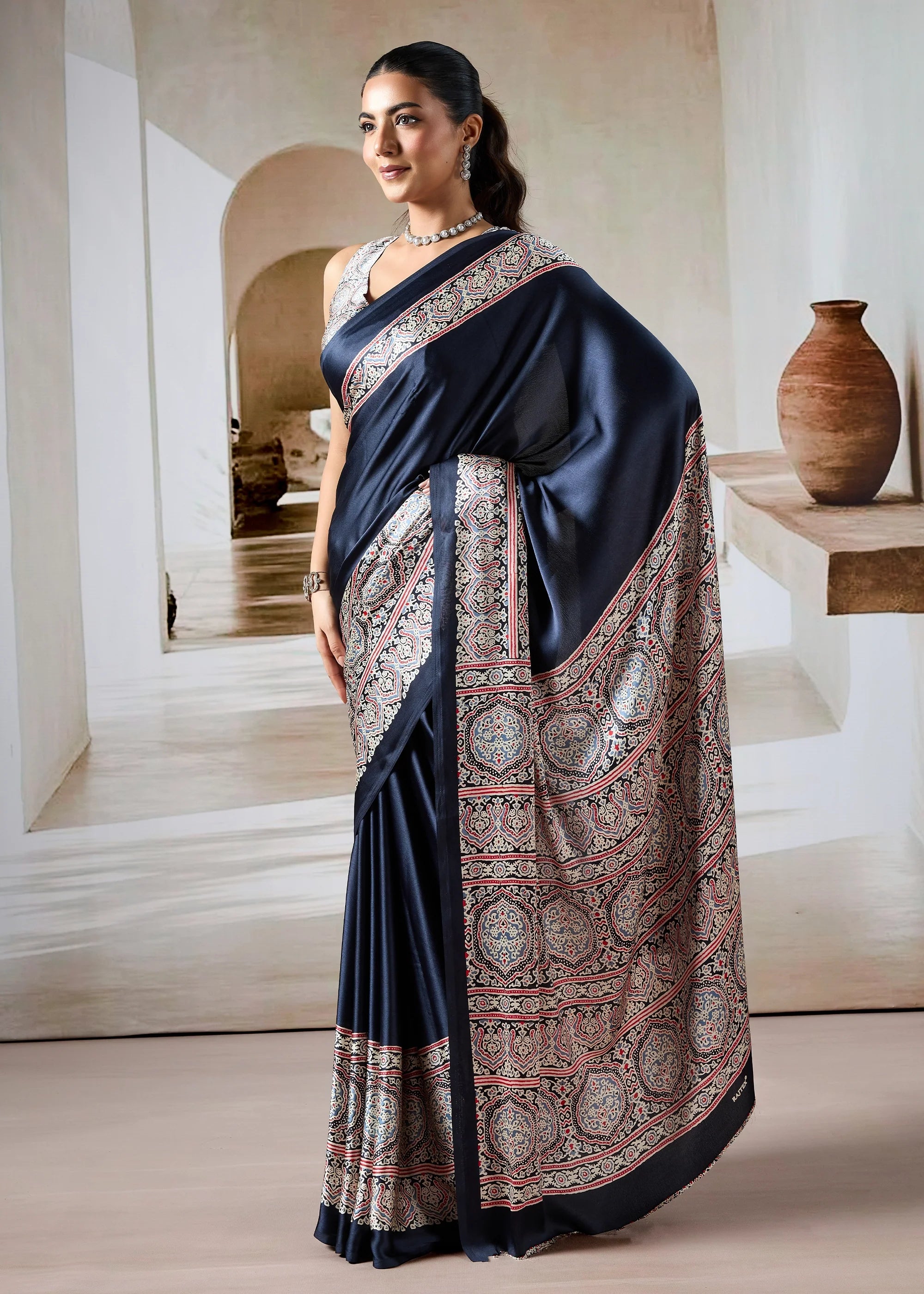 A classic new age addition to your wardrobe which will never go out of style. Presenting to you a stunning and chic printed satin crepe sarees that represents sheer elegance. These six yards of happiness is curated with supreme softness and comfort for you.
