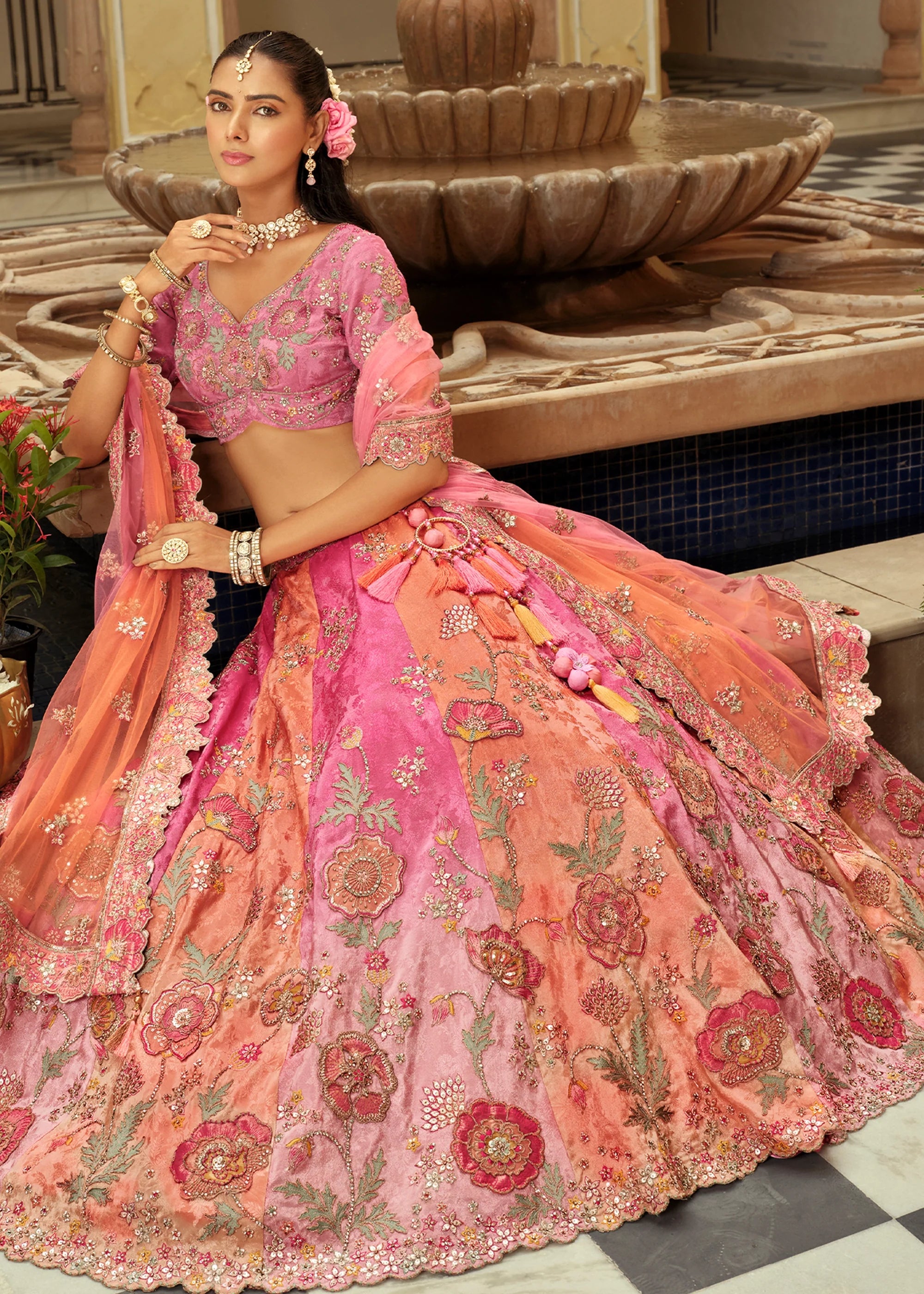 This elegant lehenga set with dupatta features intricate floral embroidery on silk fabric, blending tradition and modern style perfectly.  Lehenga...
