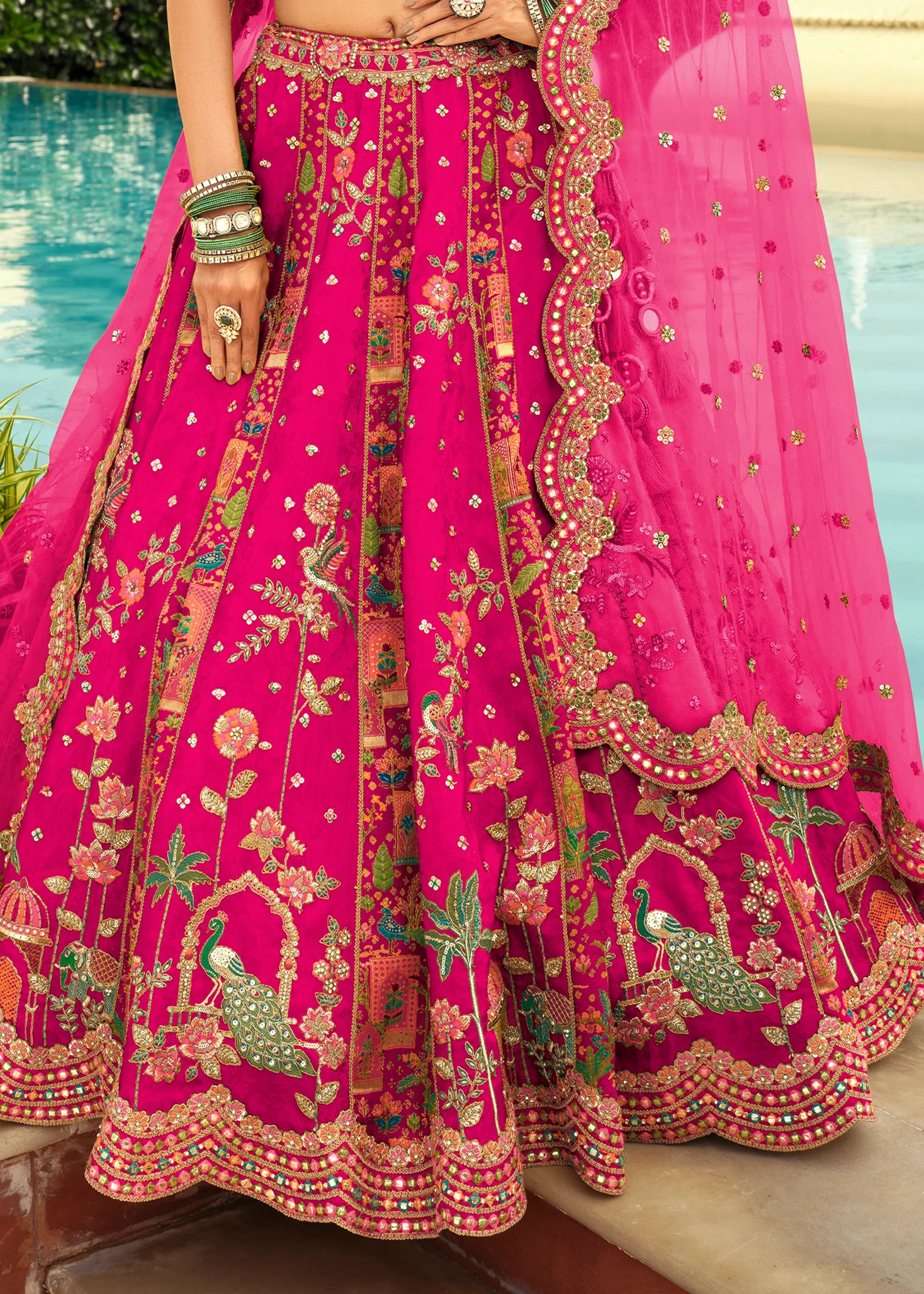 This elegant lehenga set with dupatta features intricate floral, Birds, and animal embroidery on silk fabric, blending tradition and modern style perfectly.