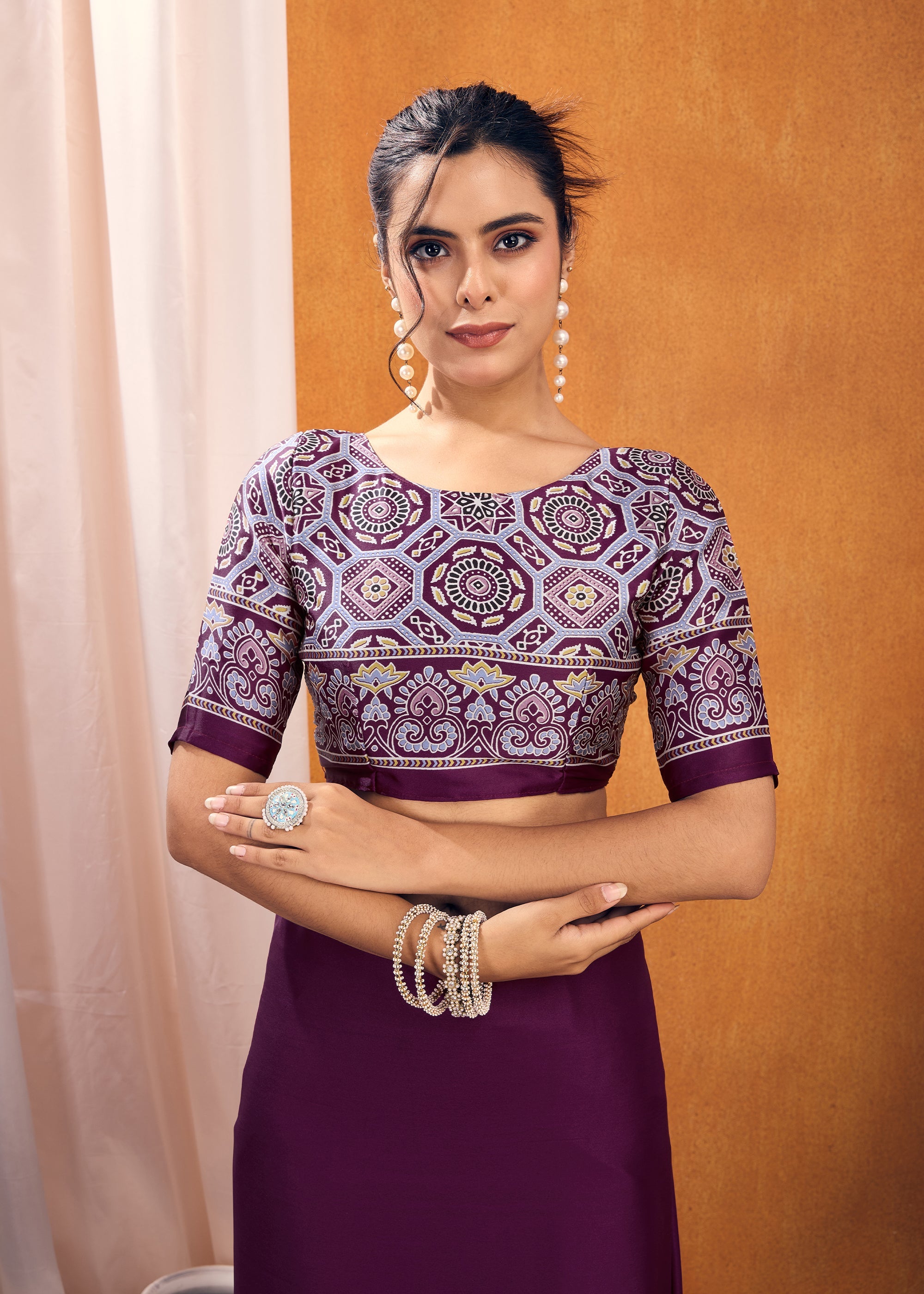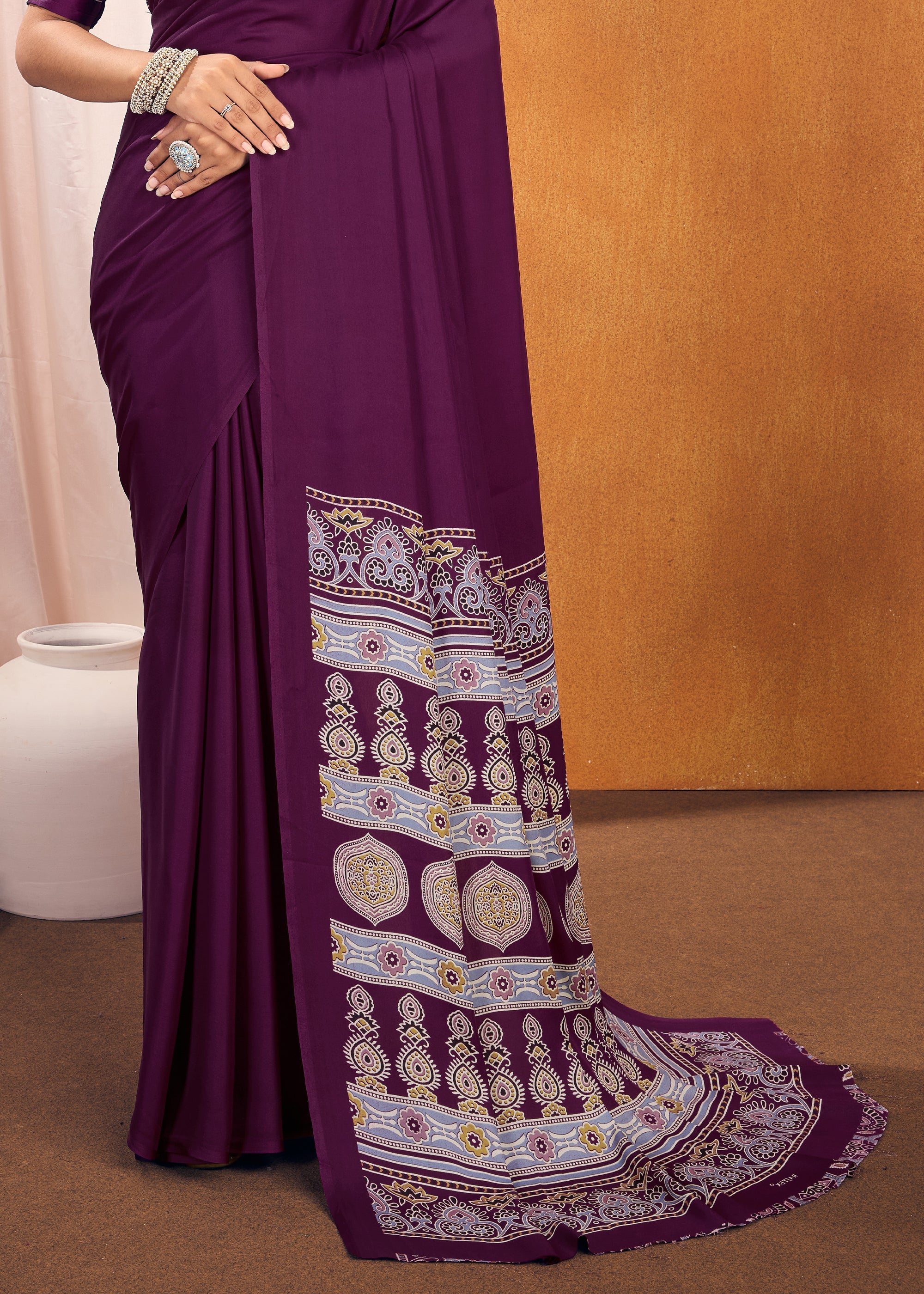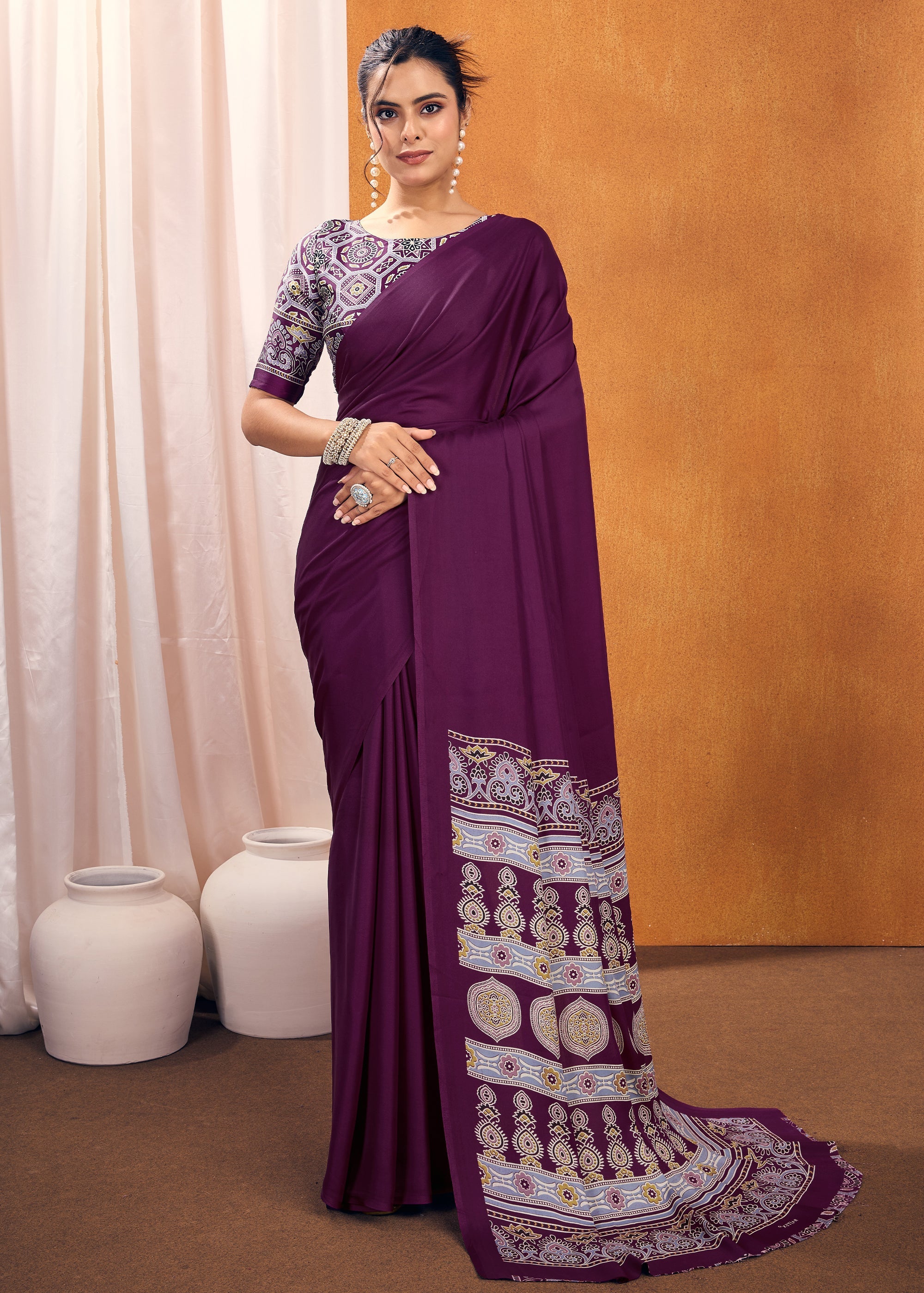 Passion Purple Satin Silk Saree with Ajrakh Printed Pallu and Blouse
