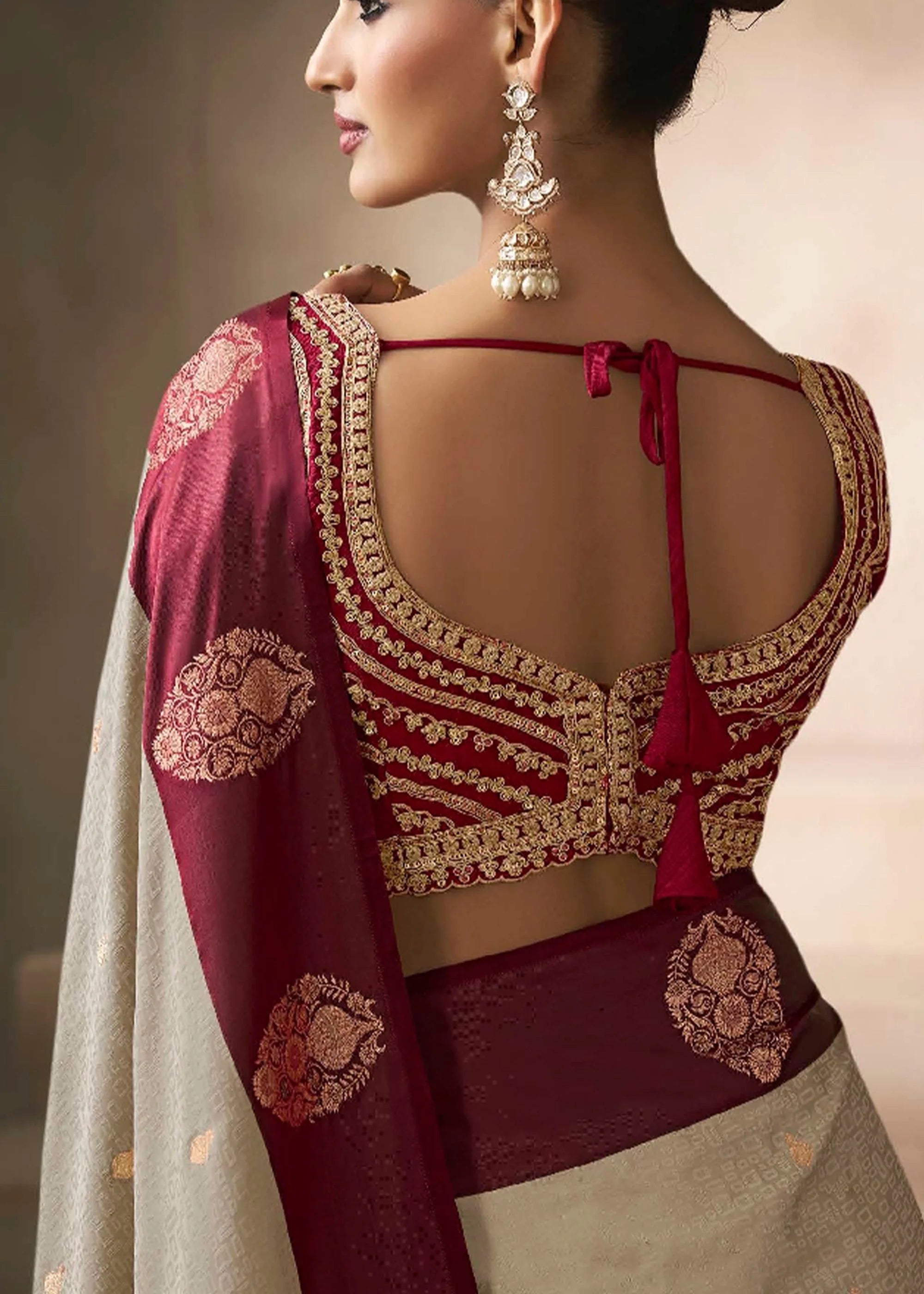 “Exclusive Offer” : Beige & Maroon Woven Banarasi Satin Silk Saree