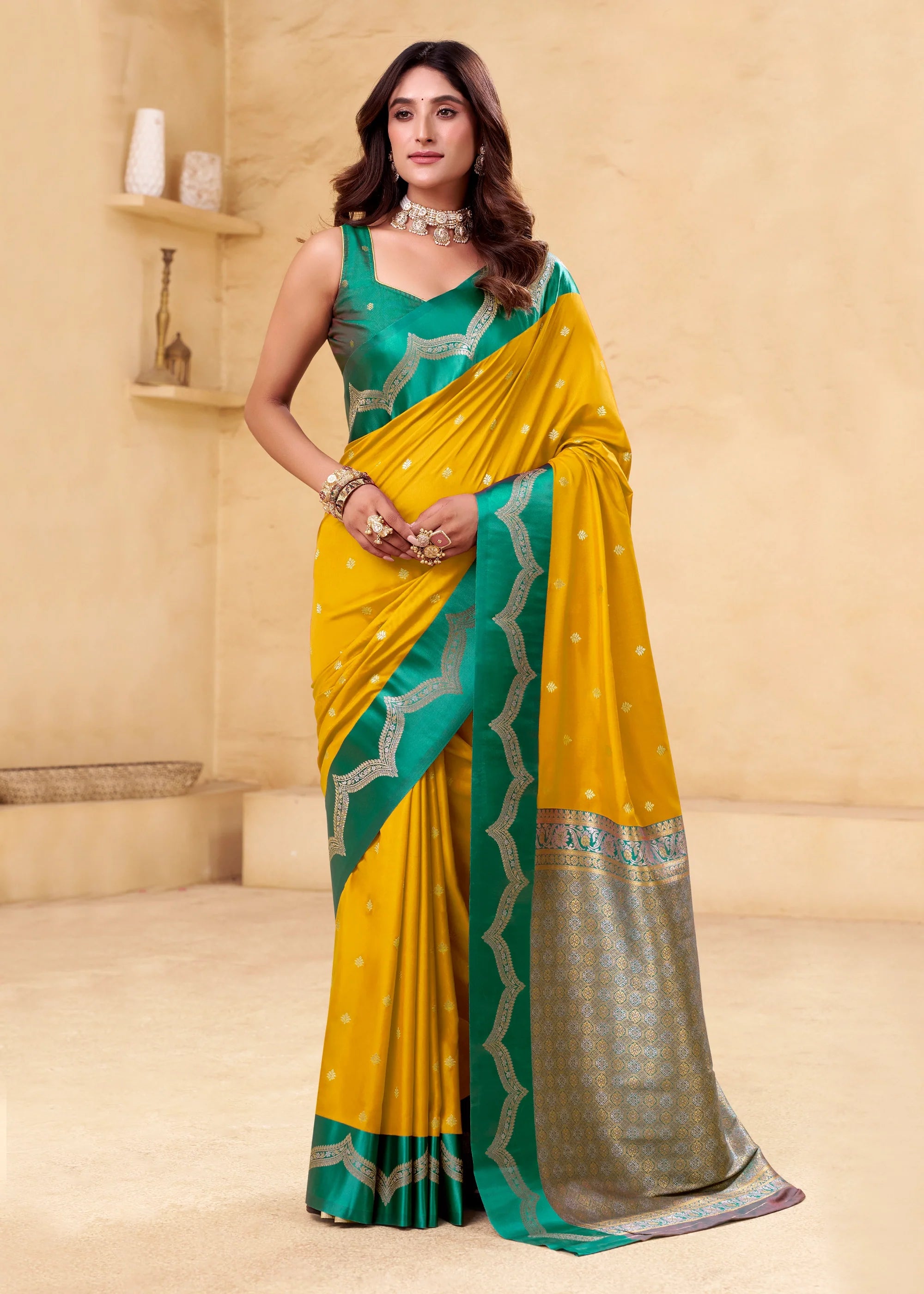 Radiate royal elegance with this luxurious Banarasi Satin Silk Saree, a perfect fusion of heritage and contemporary charm. Crafted from smooth, lustrous satin silk, it features intricate Banarasi zari weaving that reflects the timeless artistry of Varanasi’s master weavers.