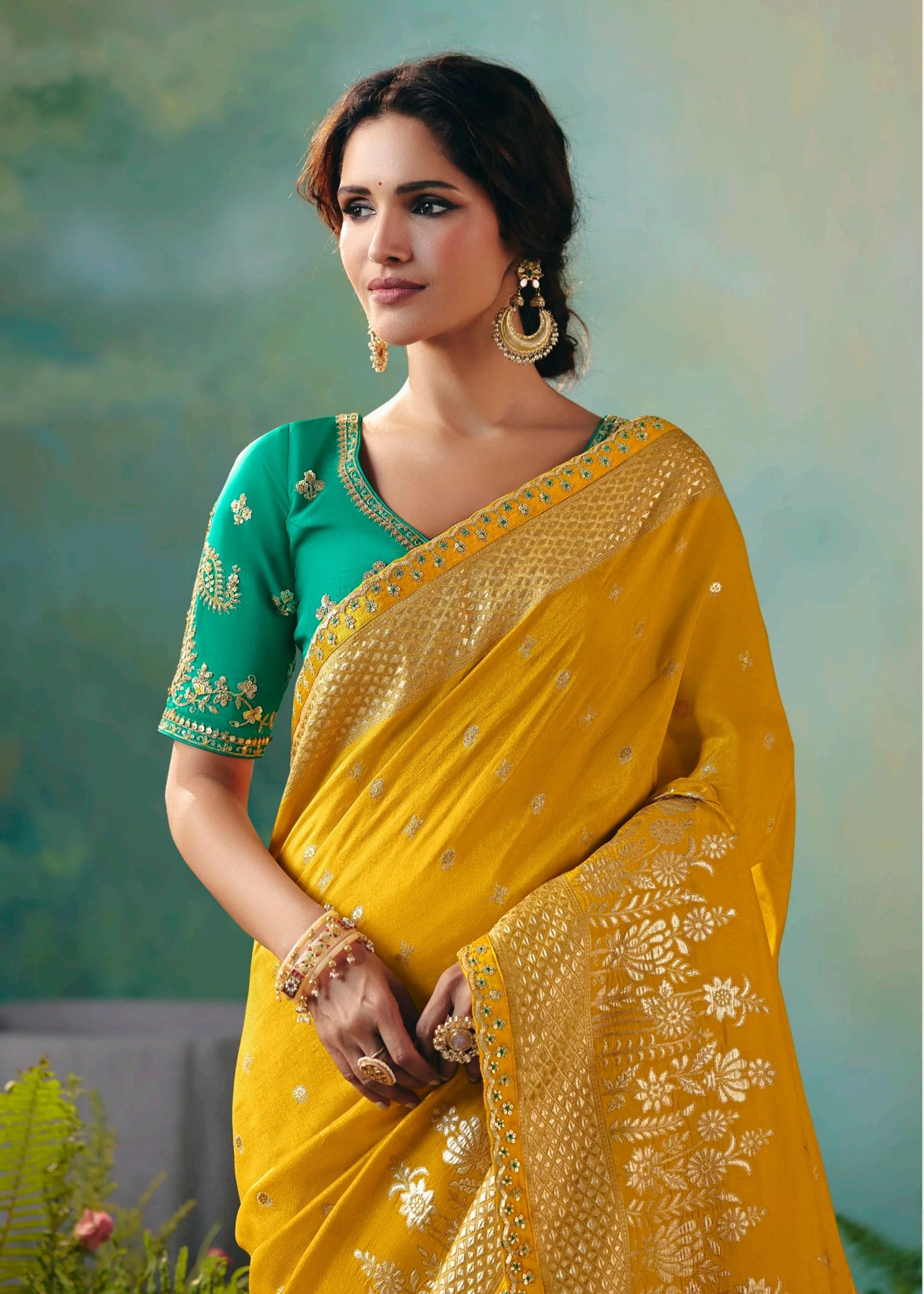 This stunning mustard yellow viscose dola silk saree offers a luxurious feel and elegant drape. Paired with a vibrant green blouse, it's ideal for weddings and festive events.
