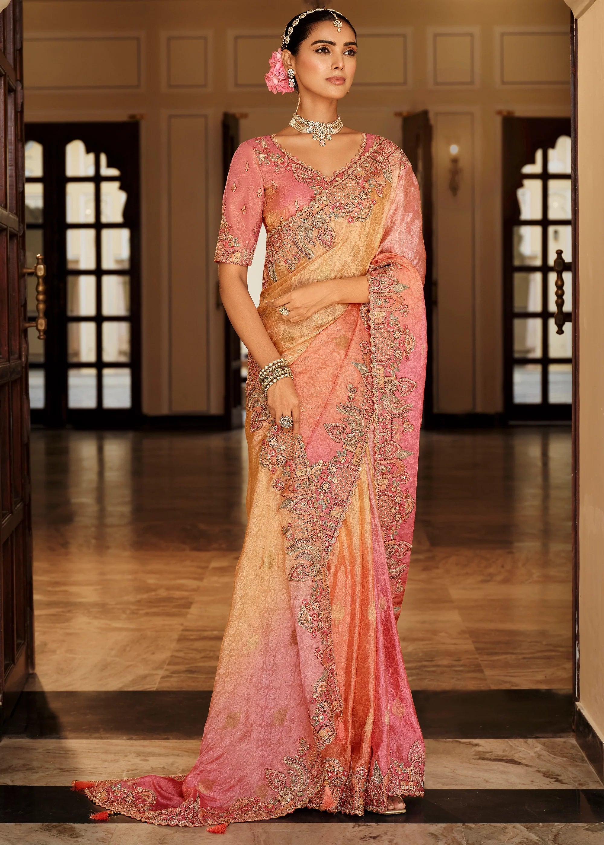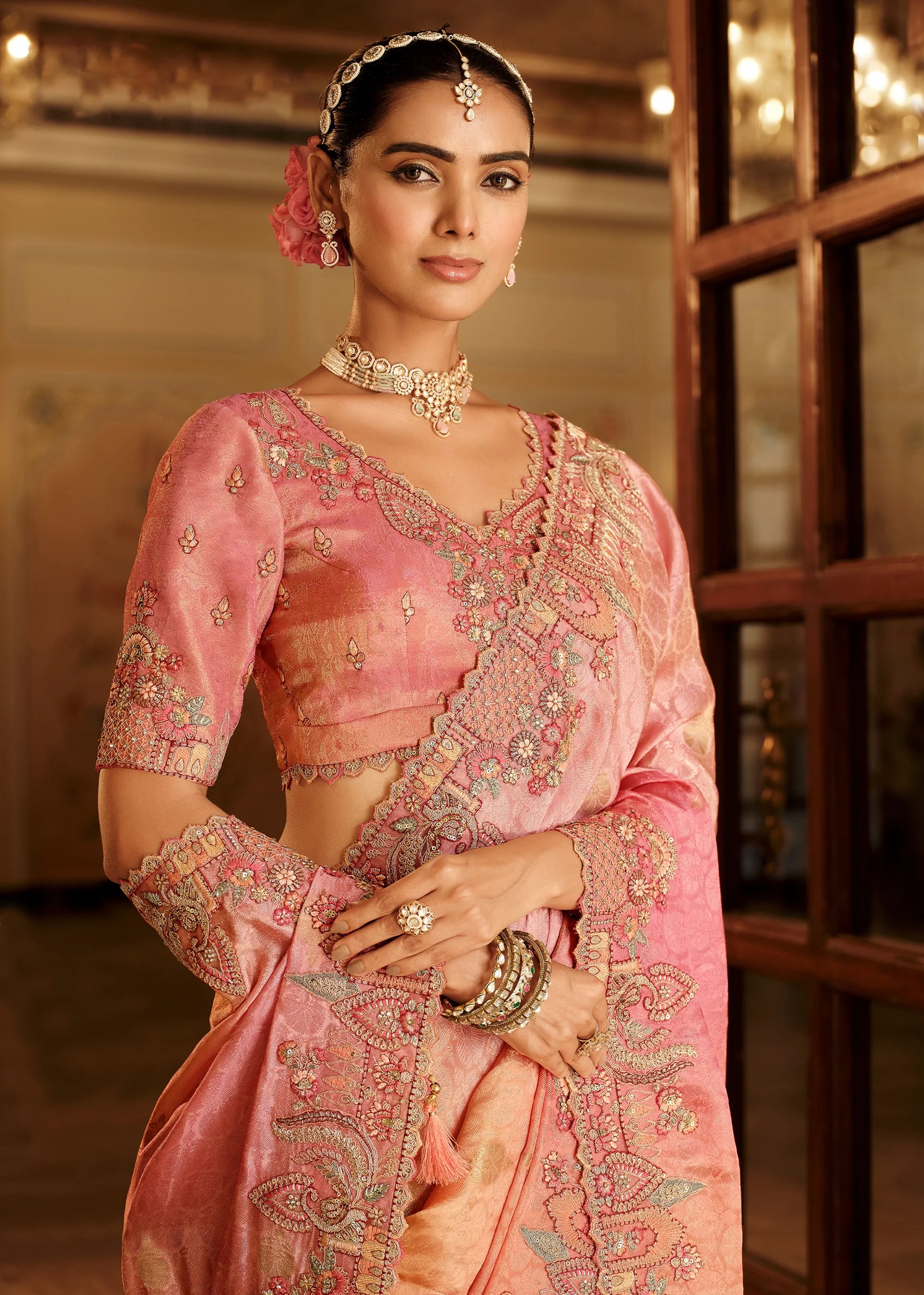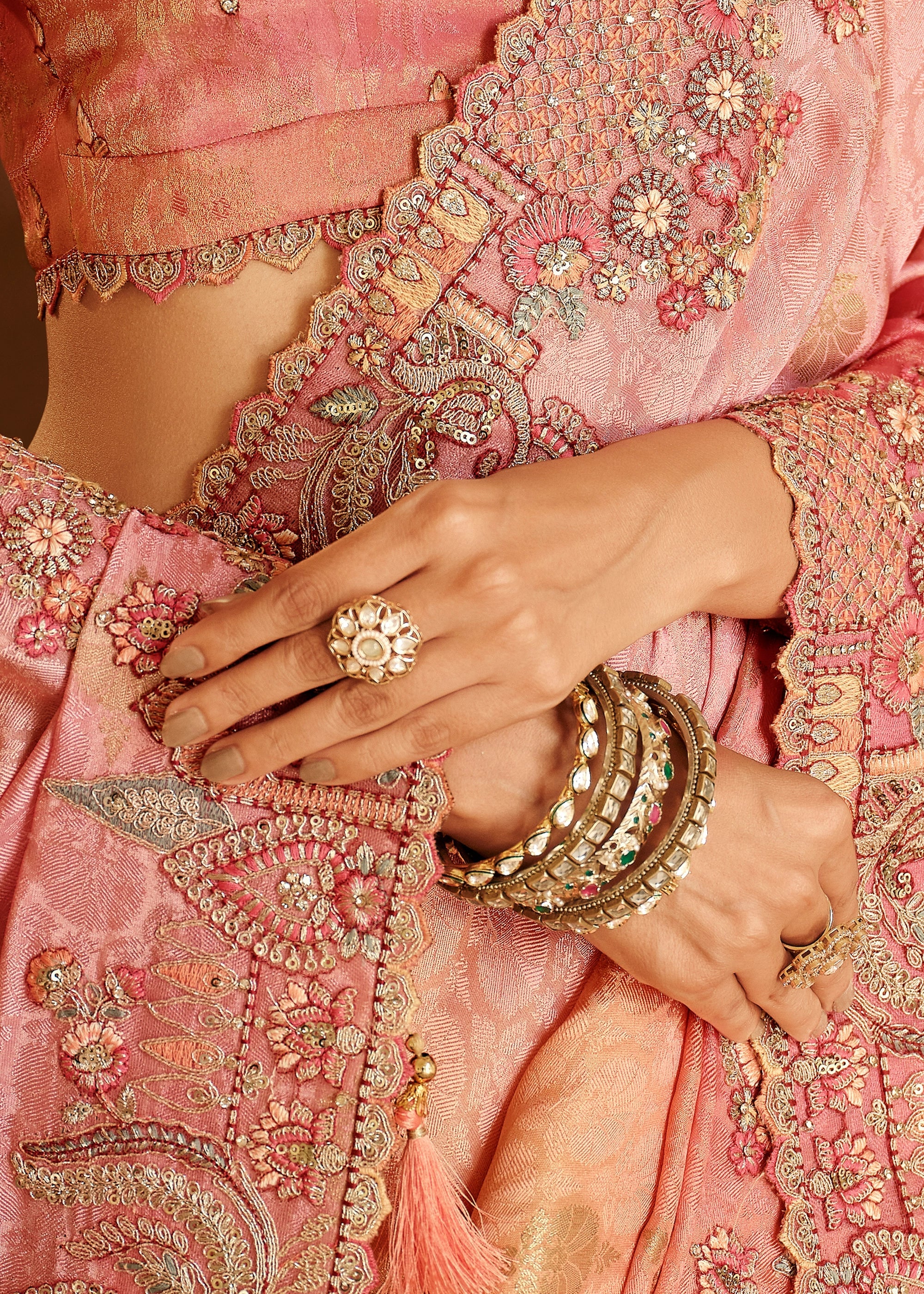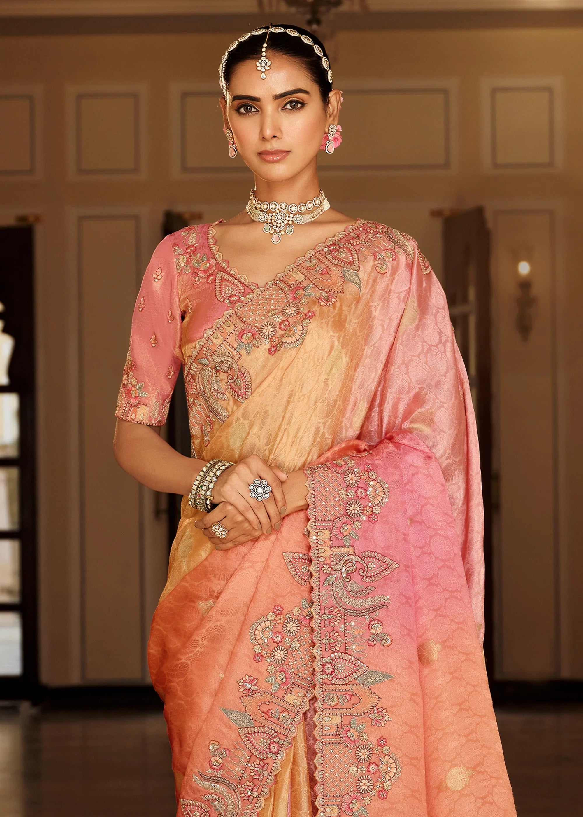 Luxuriate in this Soft Silk ensemble, showcasing beautiful Zari weaving, heavy embroidery, and intricate Khatli work. Complemented by a rich, heavily-worked silk blouse.