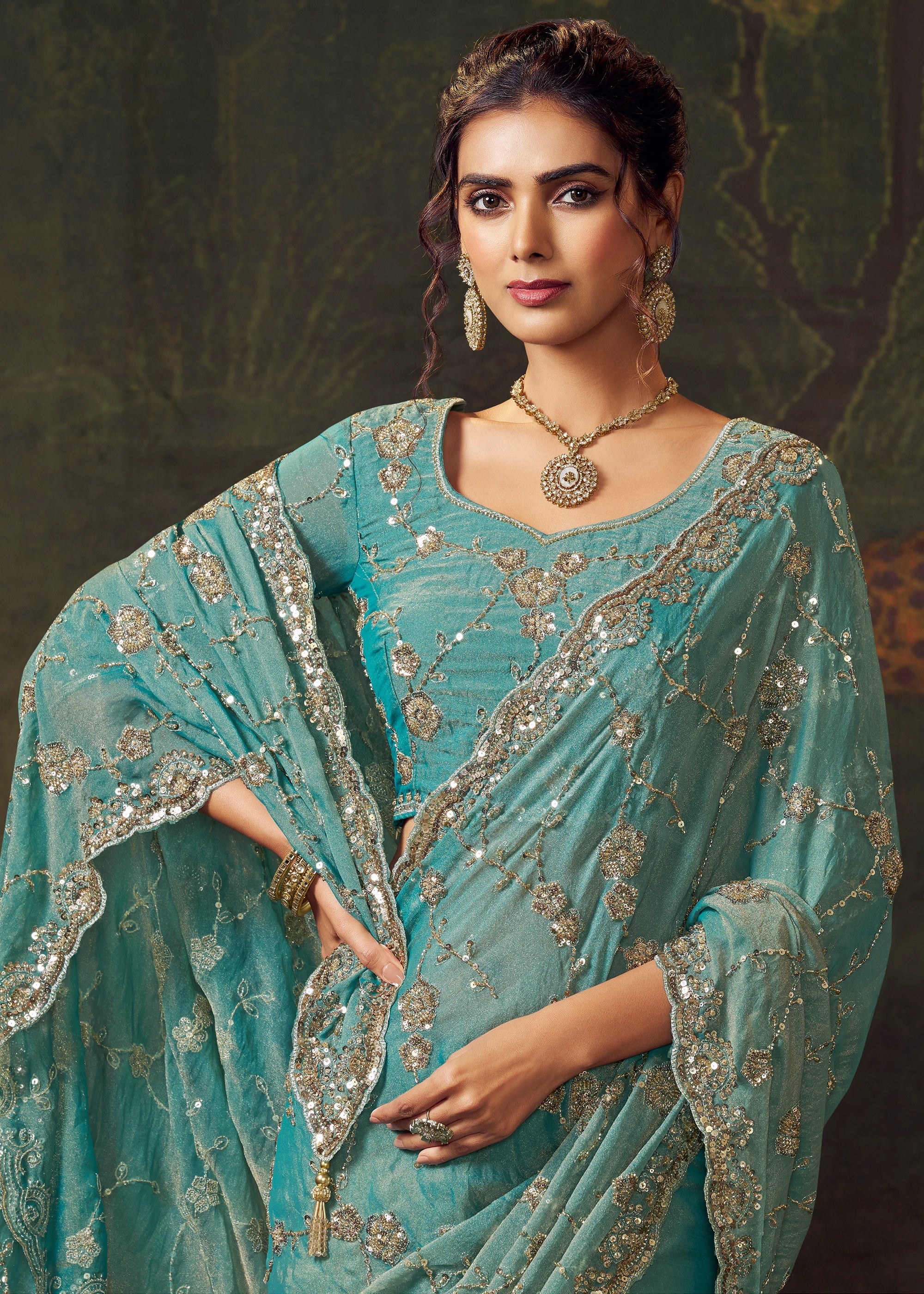 This stunning tissue silk saree features delicate resham and sequin work, exuding warmth and festive radiance. A truly graceful choice for weddings or celebrations, it embodies a timeless and elegant style.