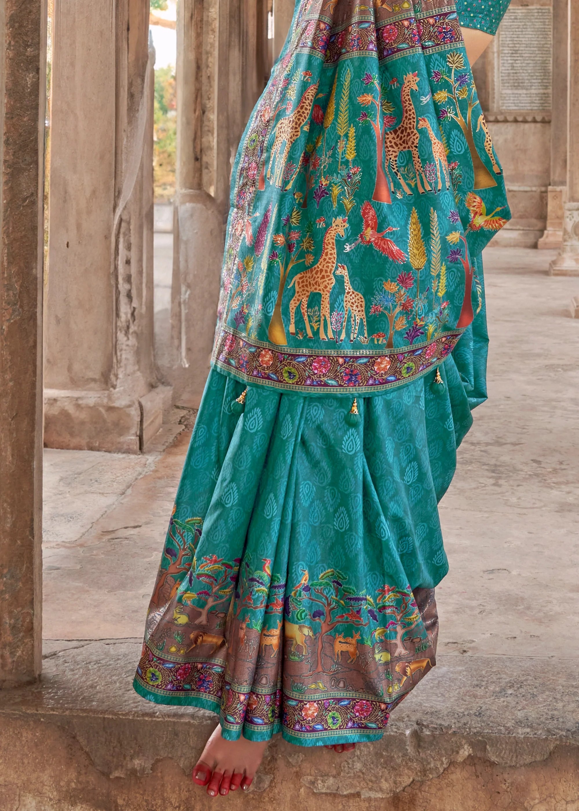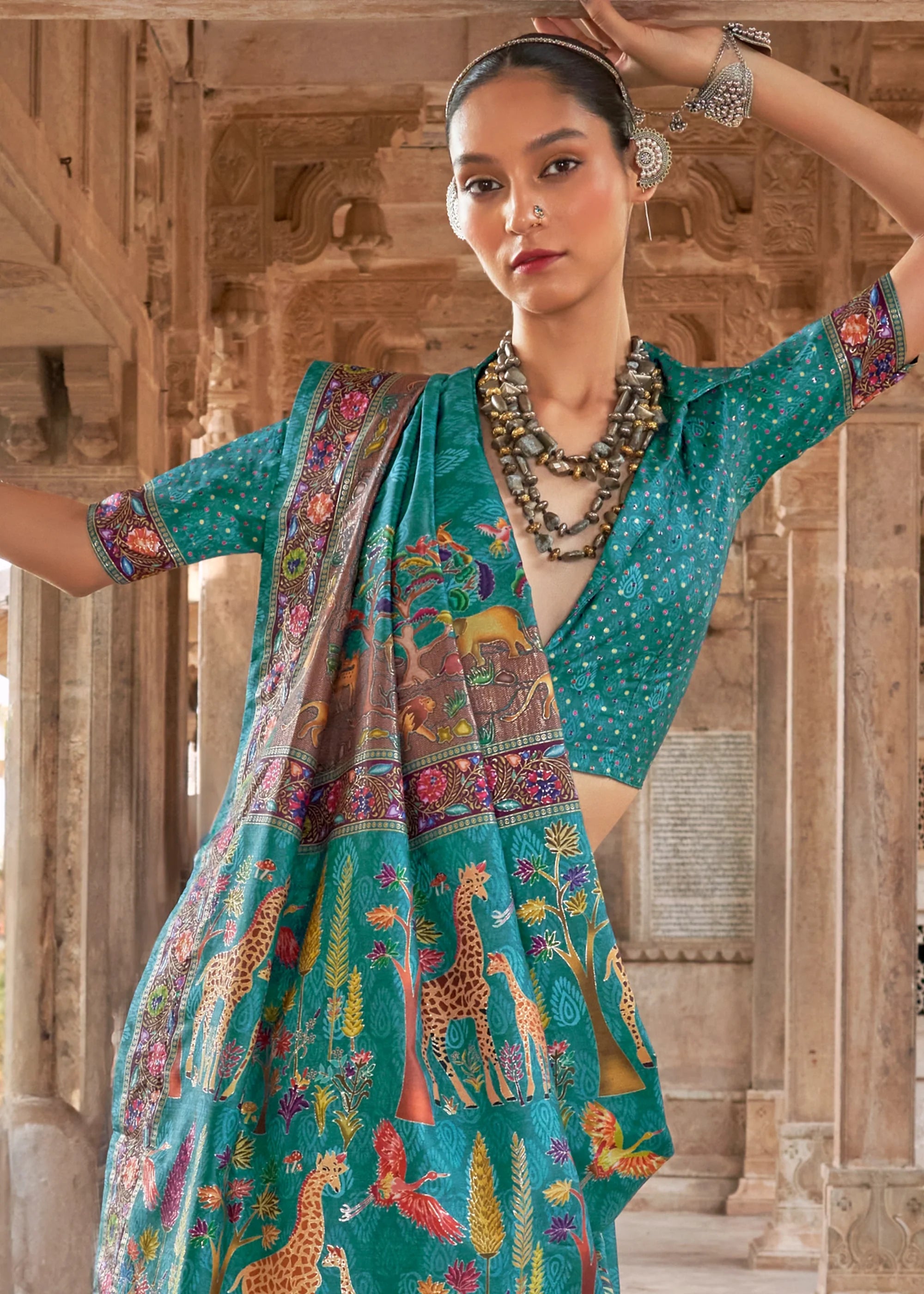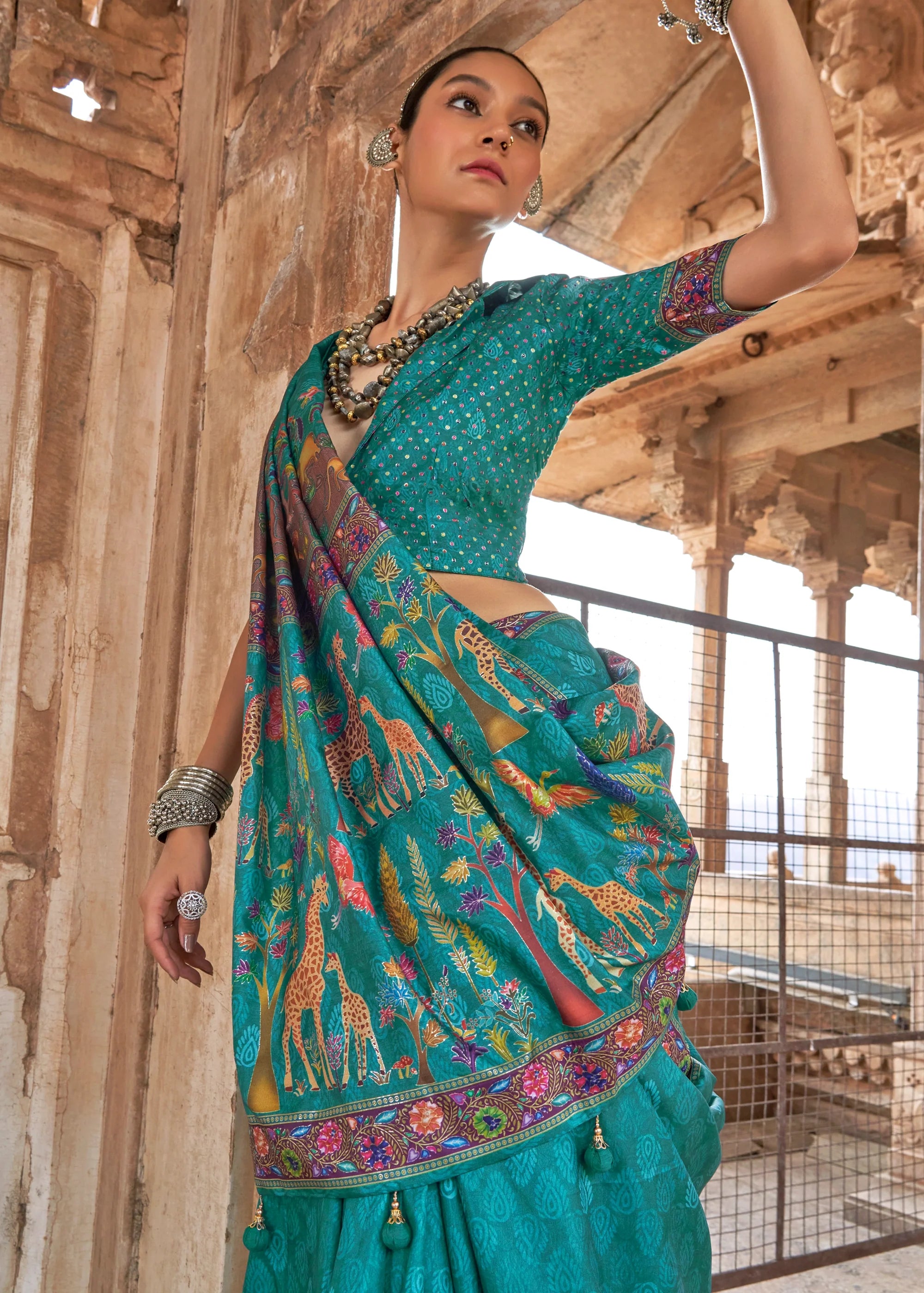 This elegant art silk saree drapes with effortless grace. Enhanced with a vibrant digital print border and dangles, it is paired with a unstitched blouse piece, making it perfect for festive gatherings and traditional occasions.
