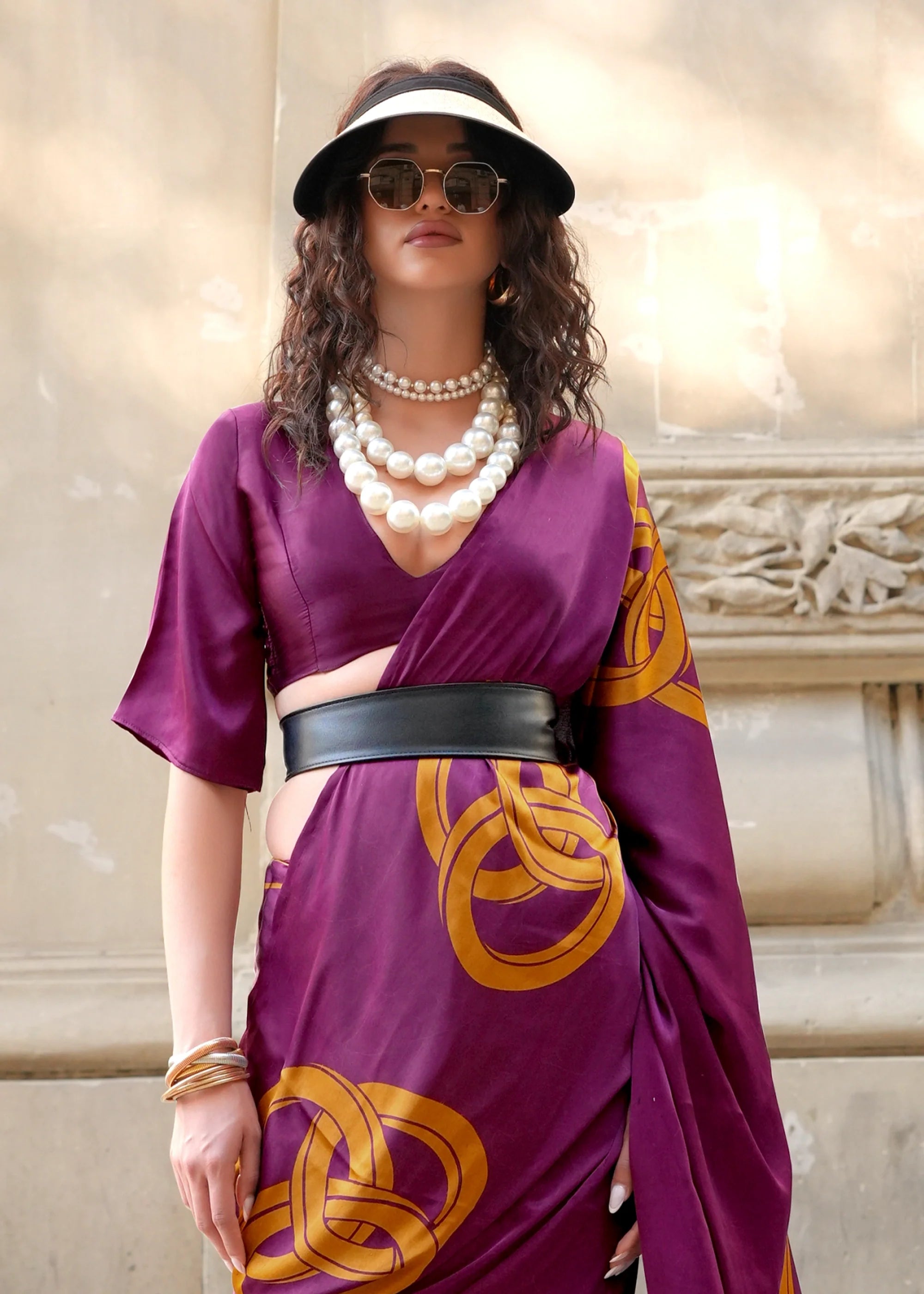 Sparkling Purple Printed Satin Silk Saree