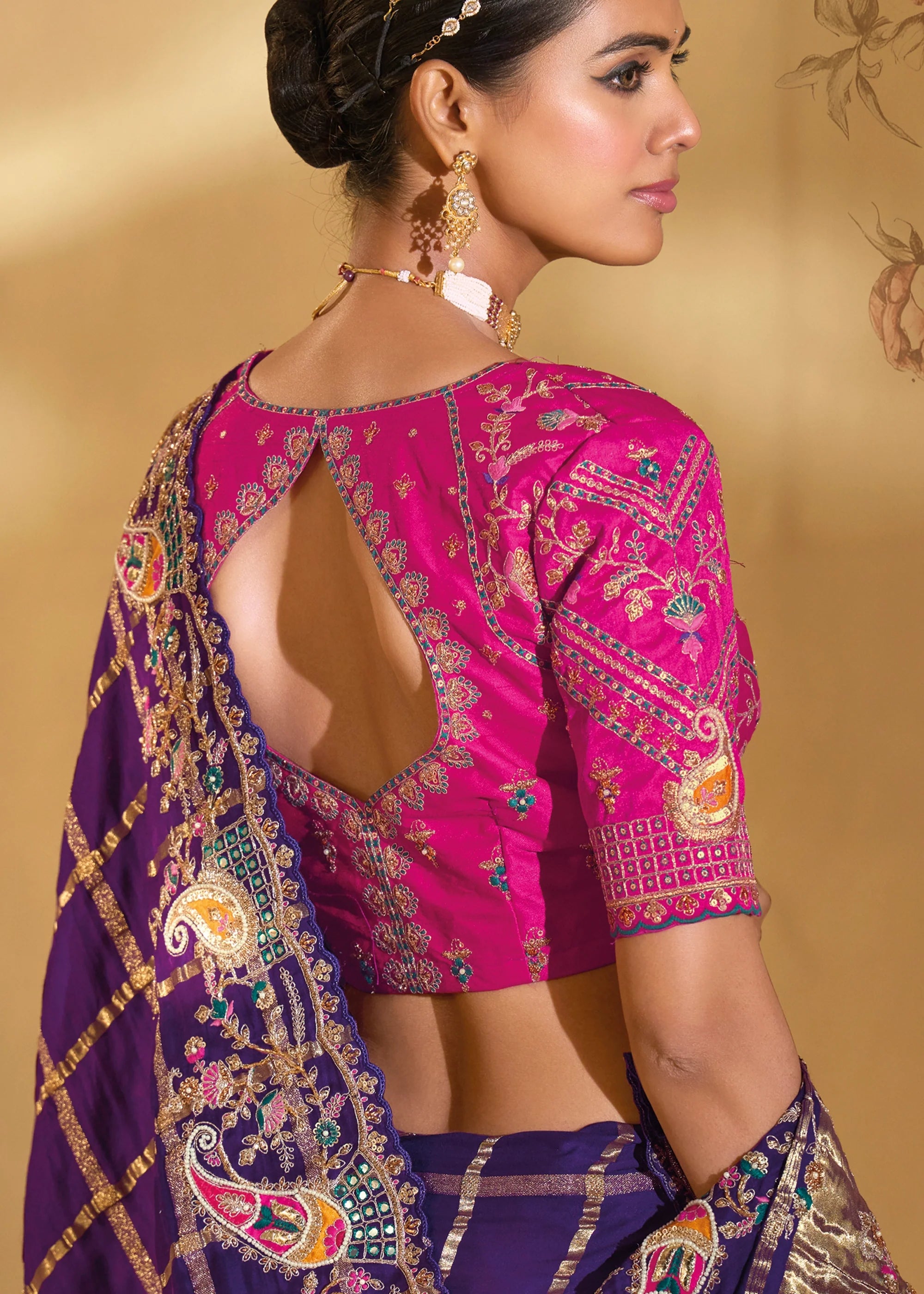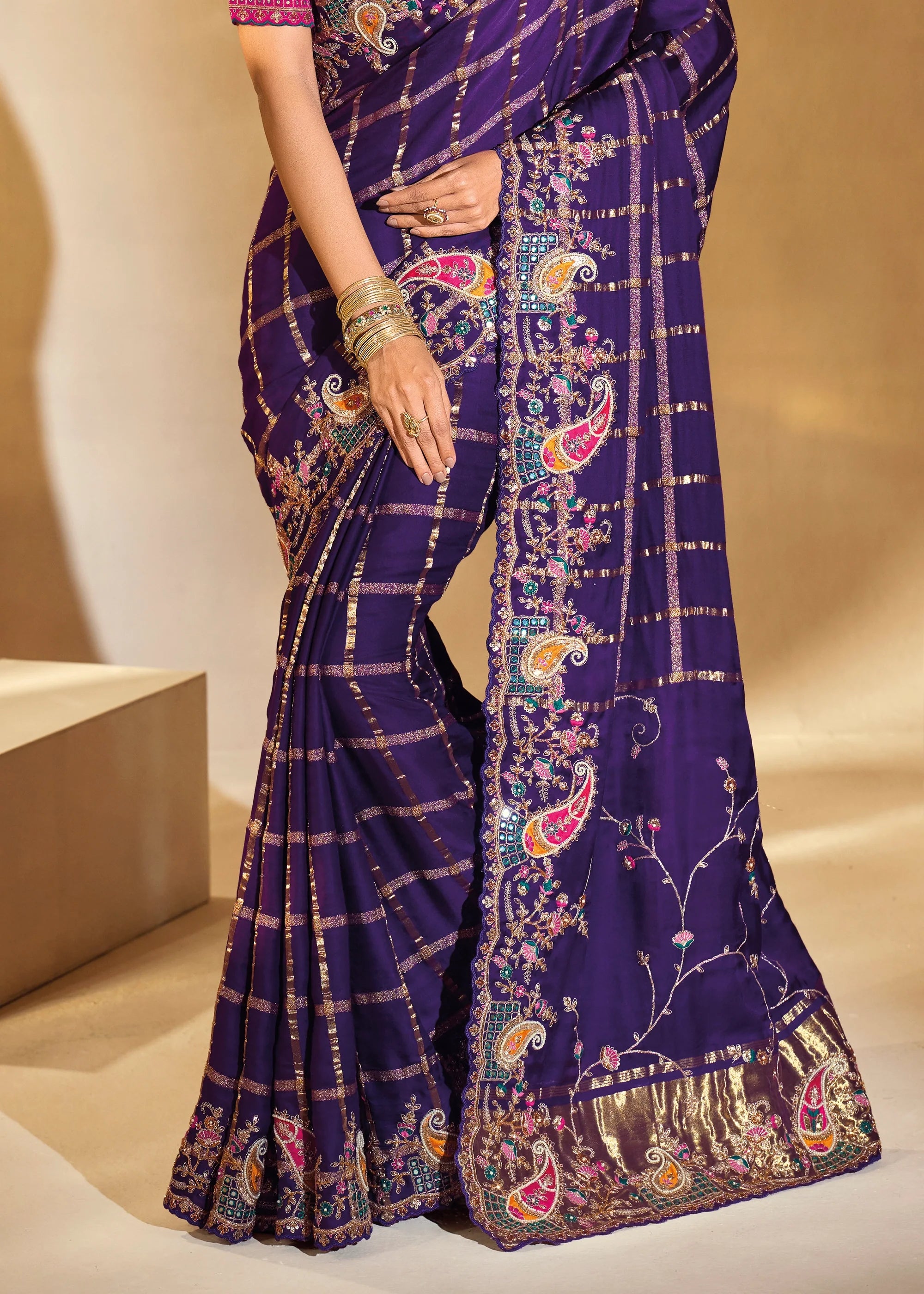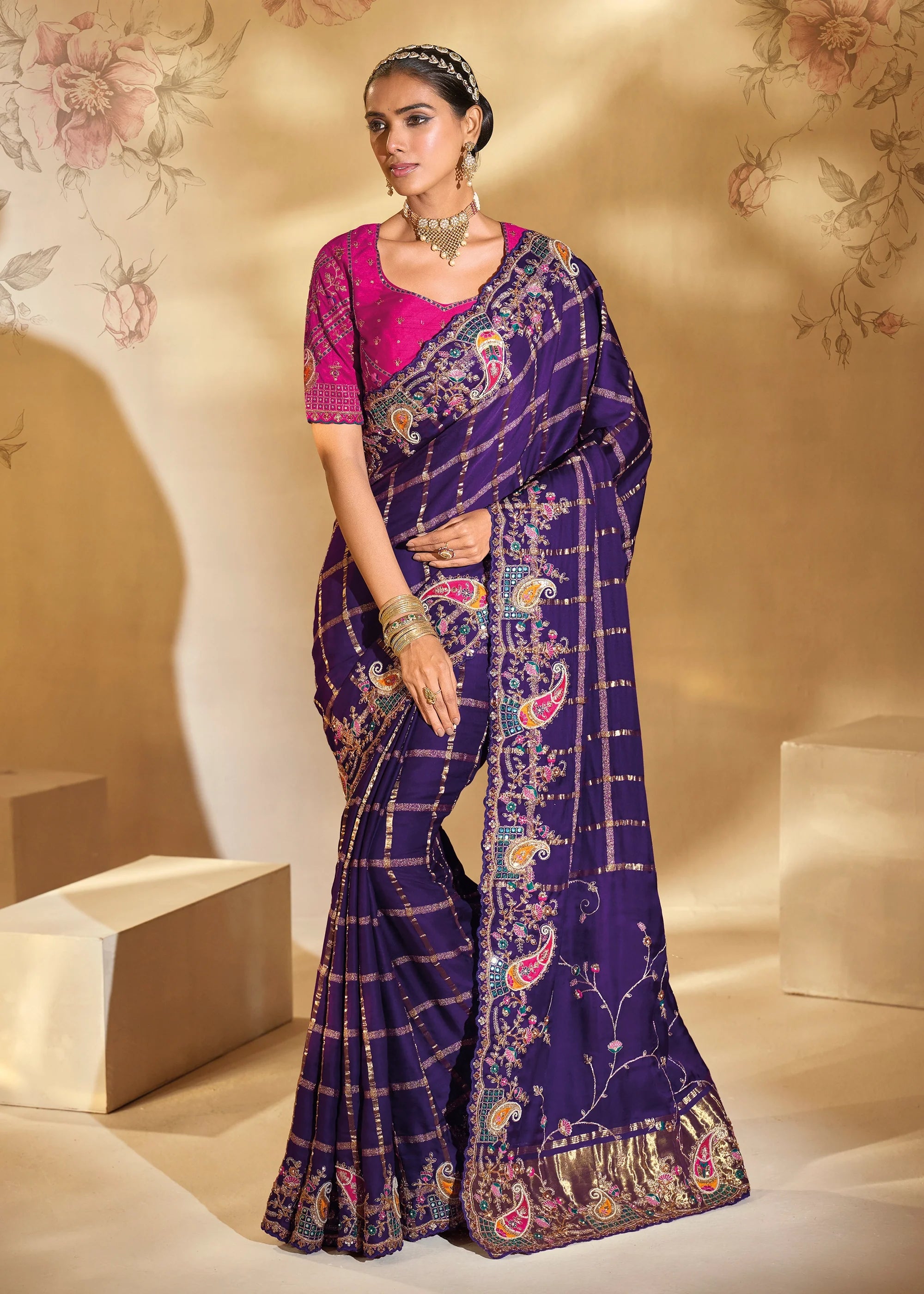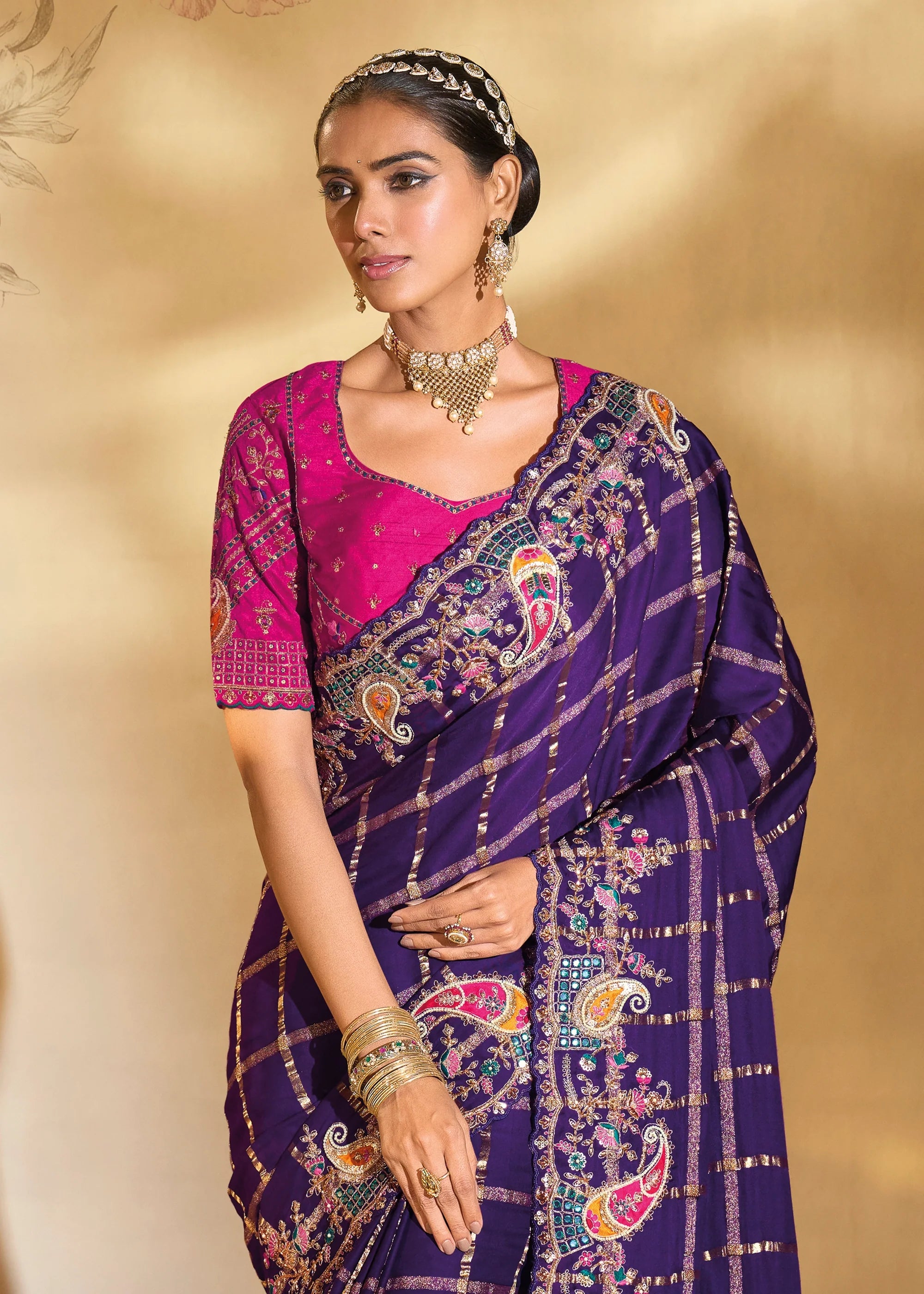 This majestic Purple Gajji Silk Saree offers a kaleidoscope of work. It is richly embellished with Zari, thread, Moti (beads), Cut-Dana, and reflective mirror work, creating a truly heavy and opulent statement piece.