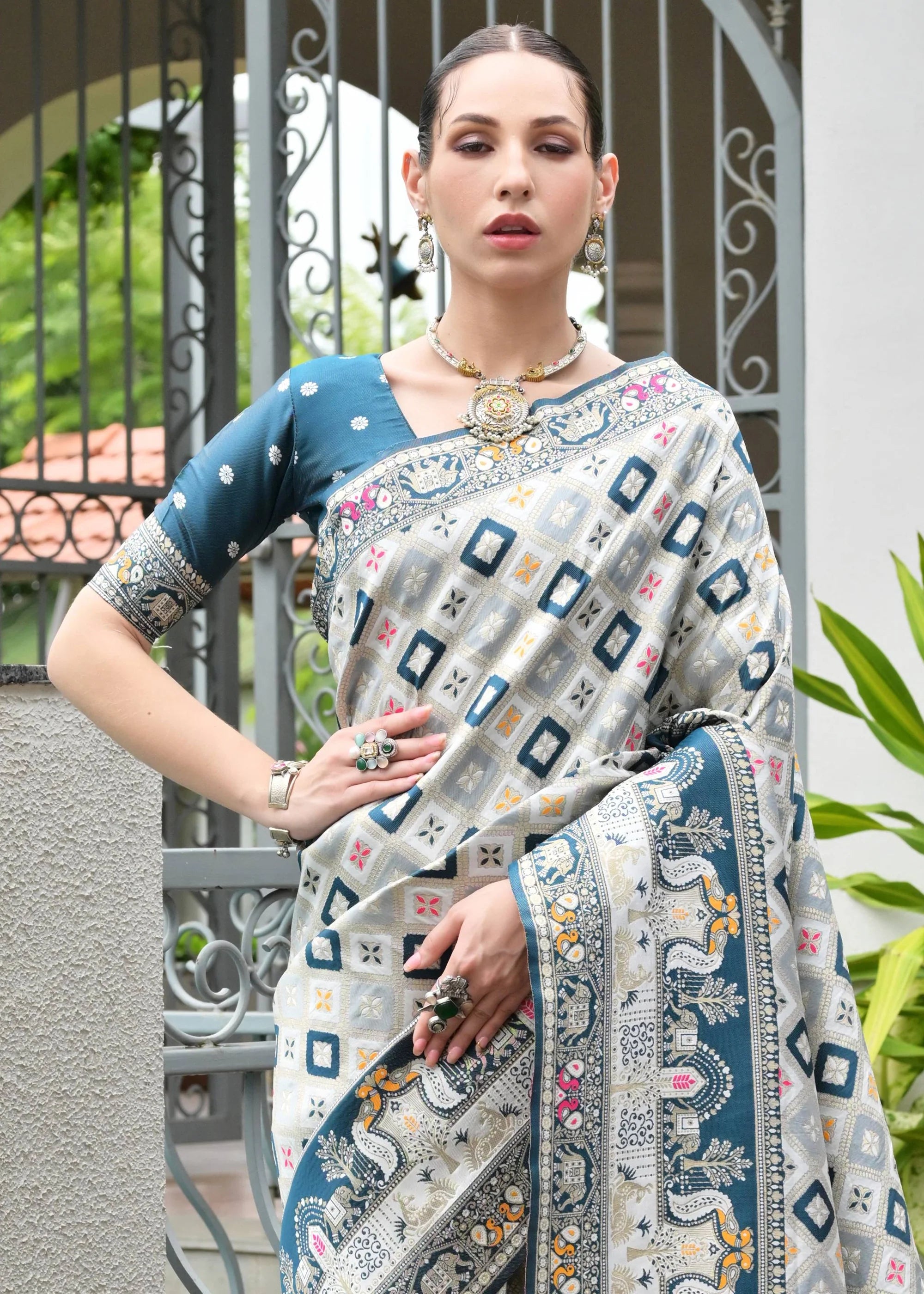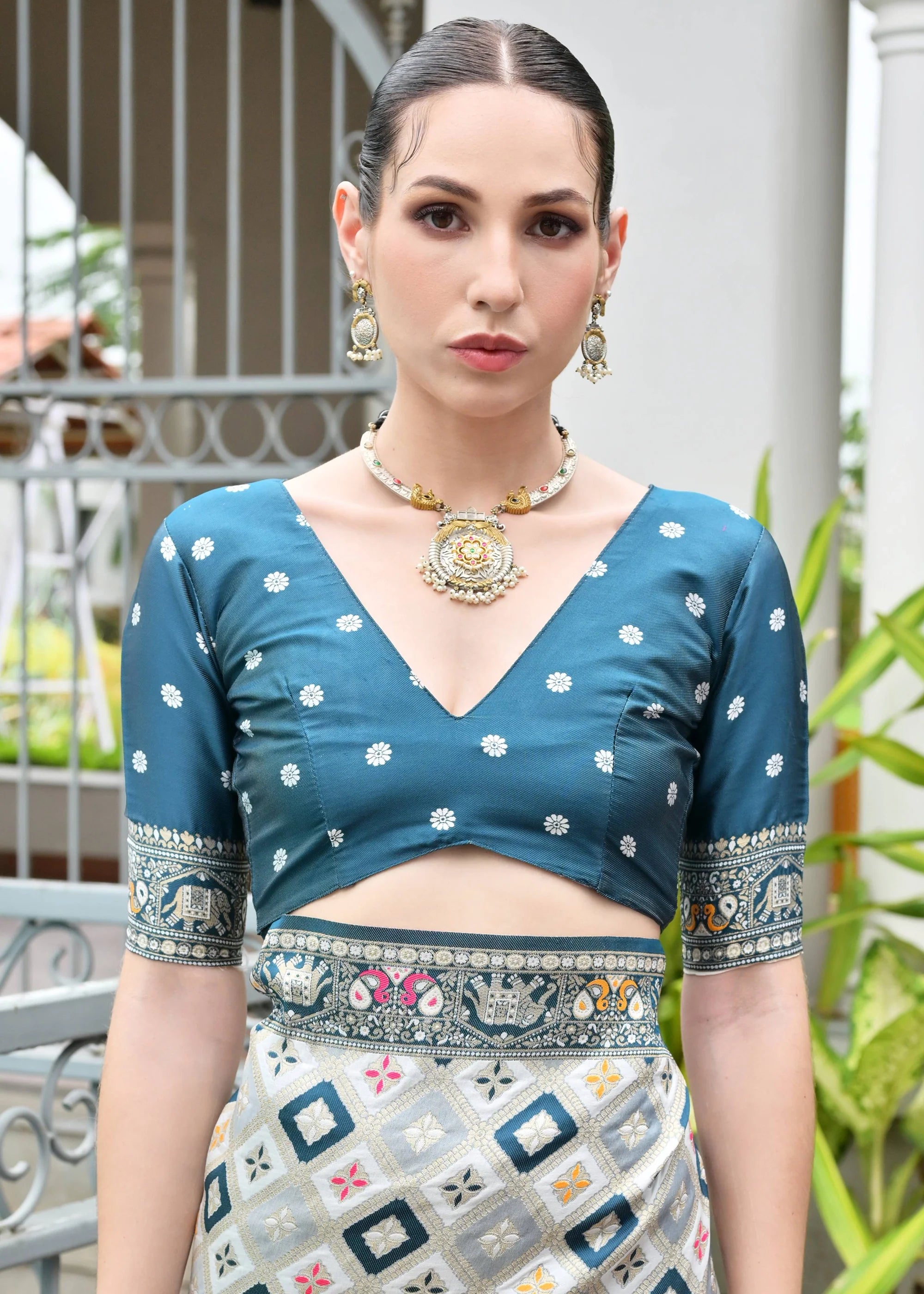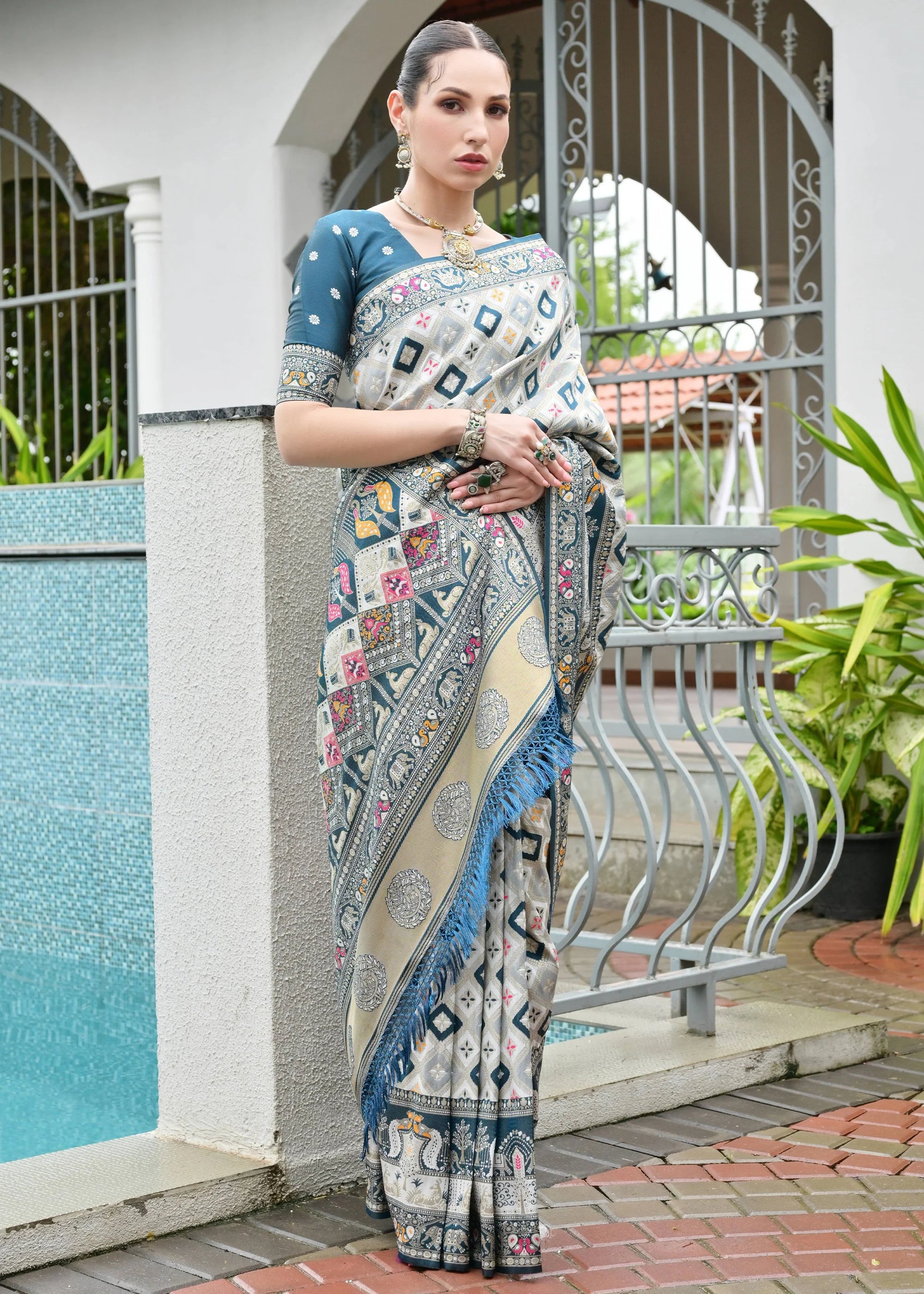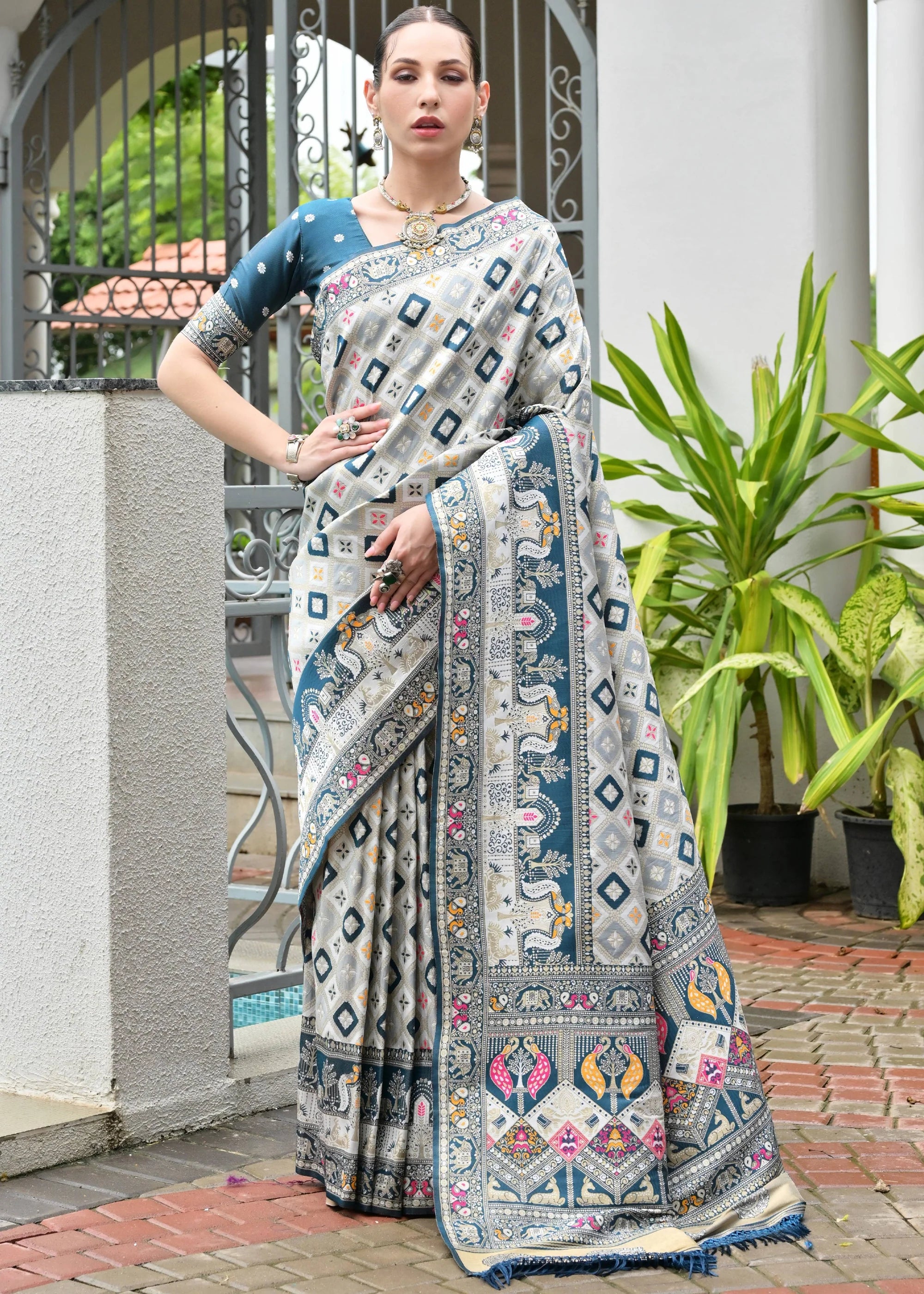 White & Rama Blue Woven Banarasi Patola Silk Saree