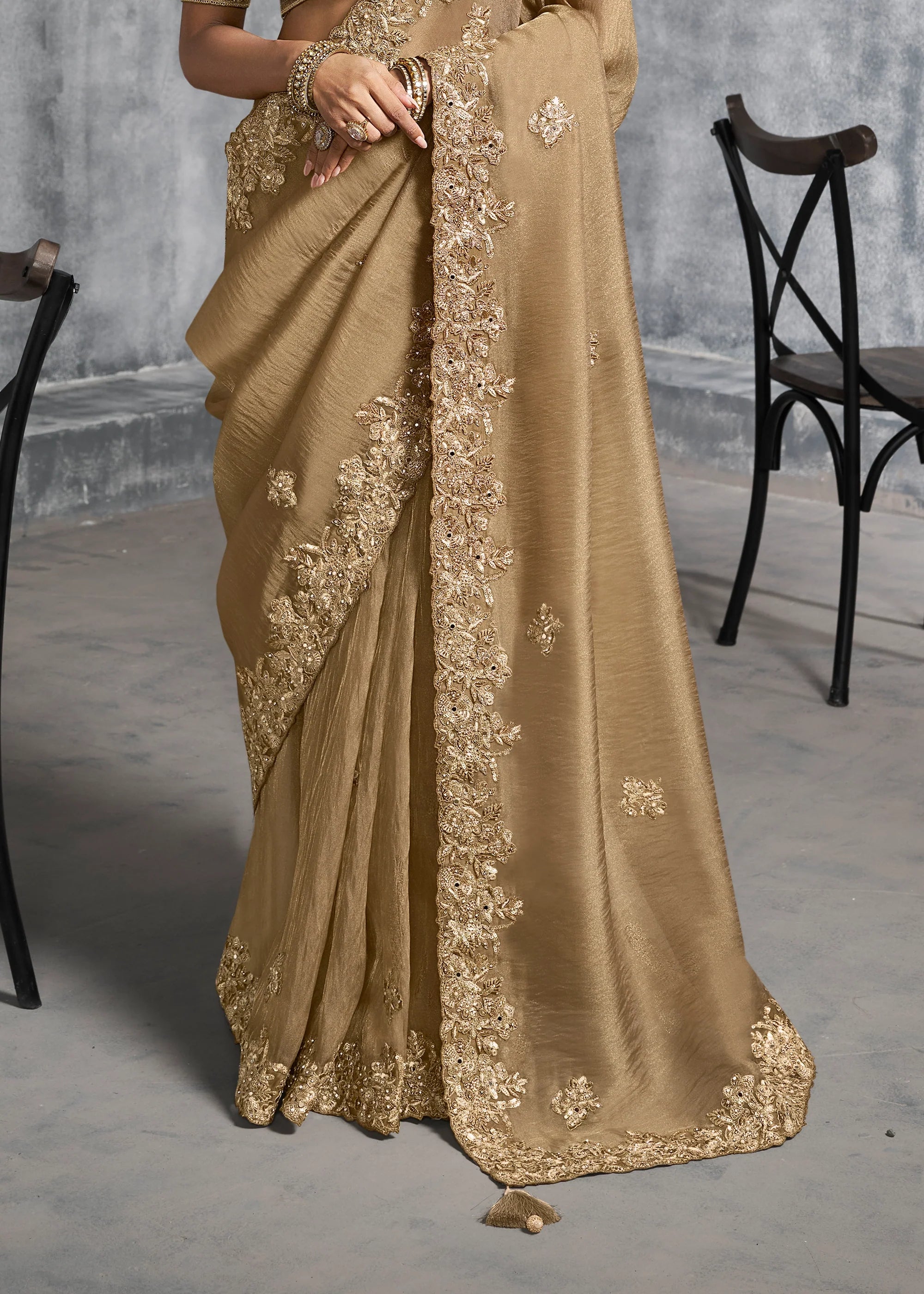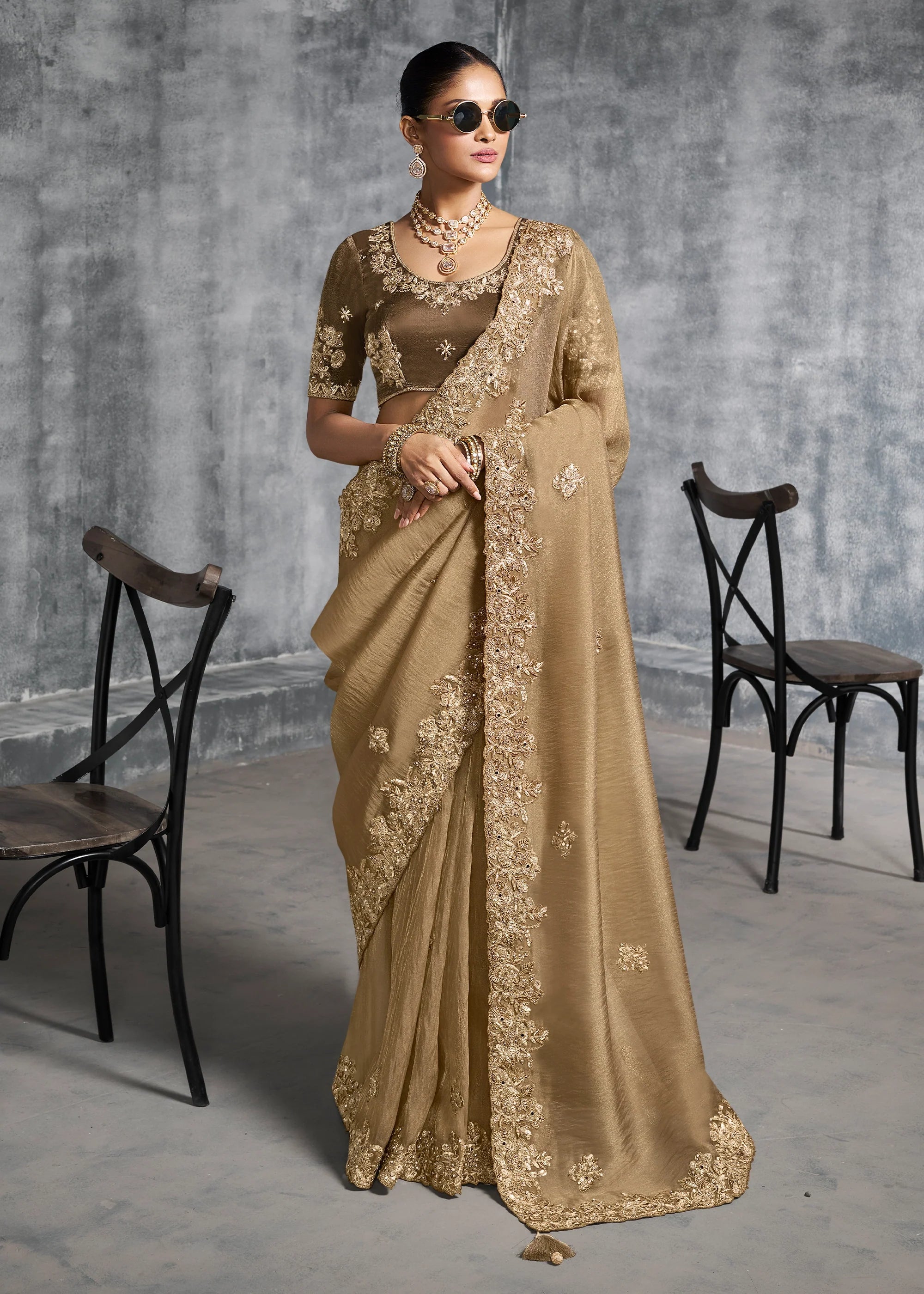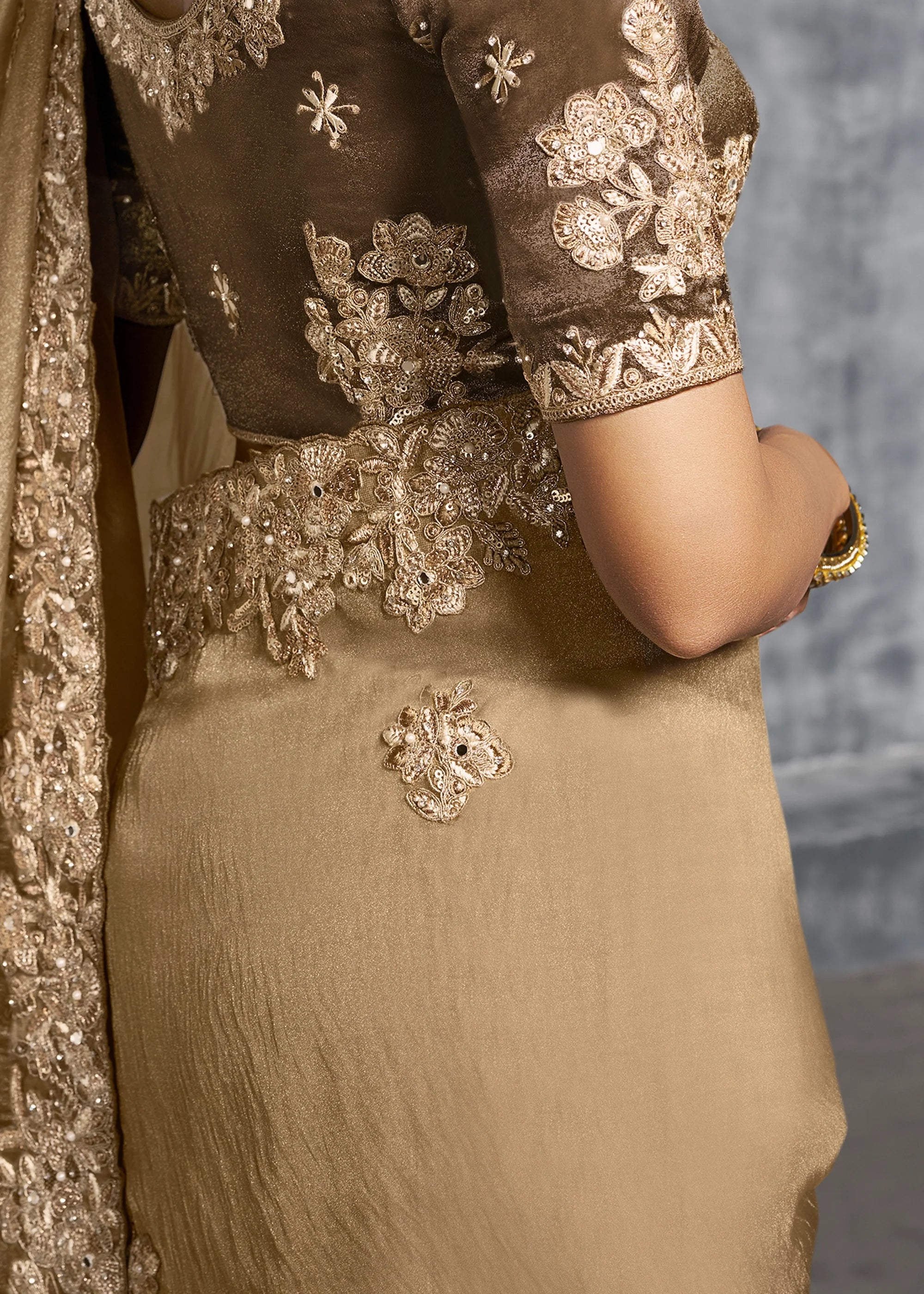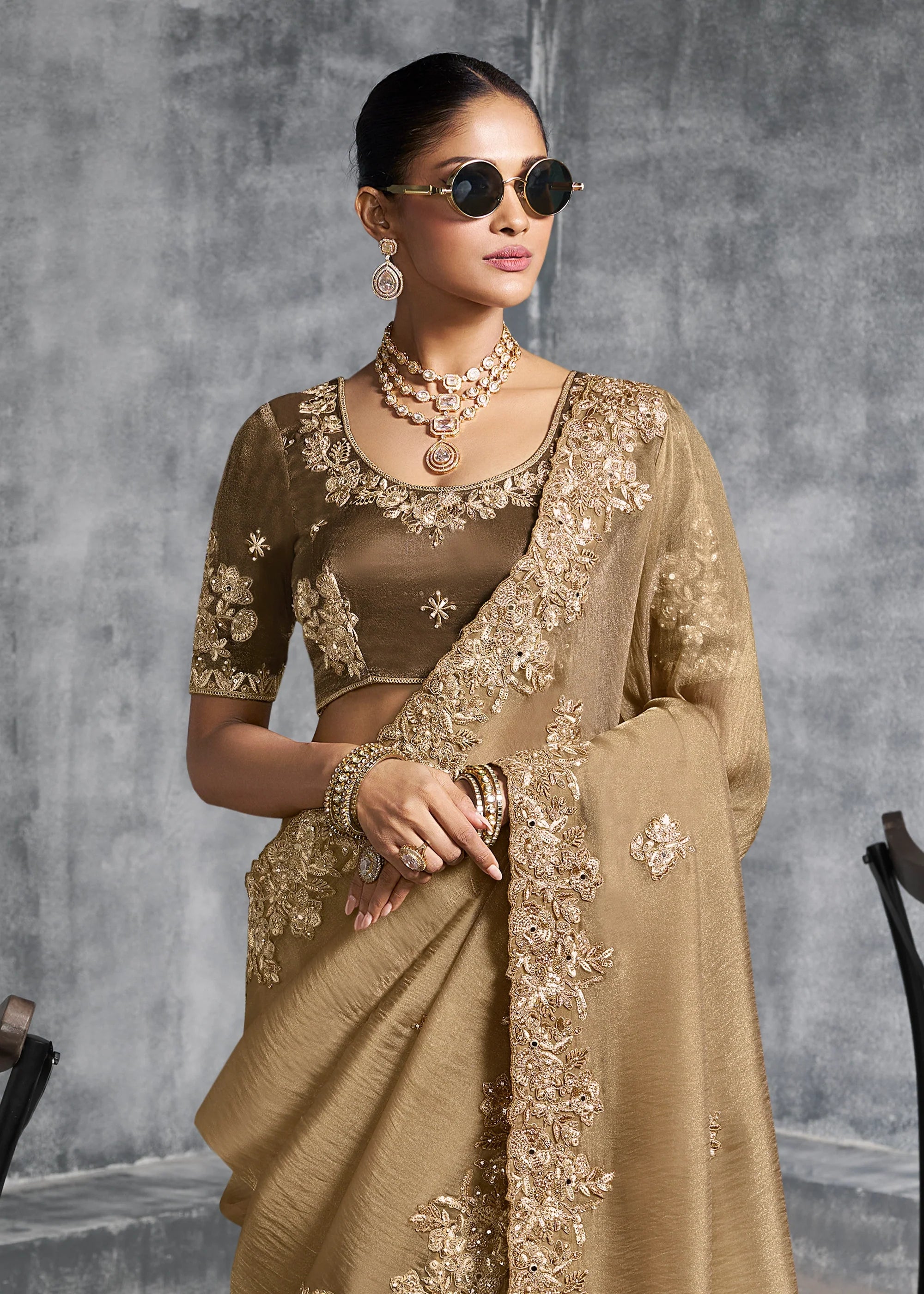This luxurious Tissue Zari saree features intricate resham thread embroidery with floral motifs. It is heavily embellished with sequins, pearls, mirror work, and stonework, complemented by a heavy-work silk blouse.