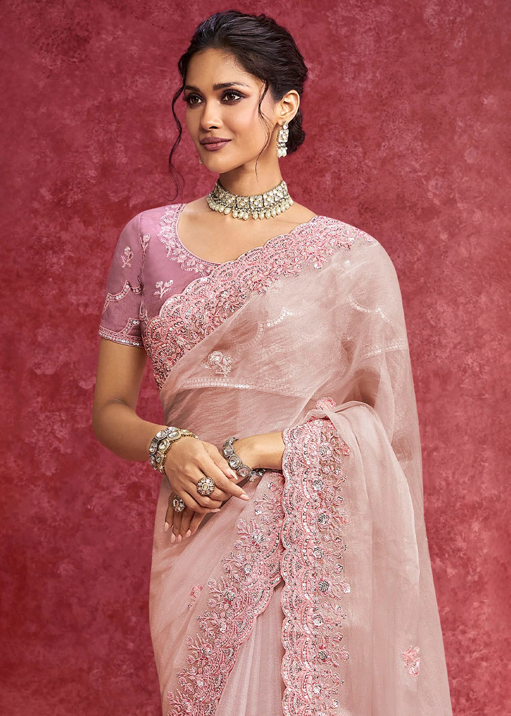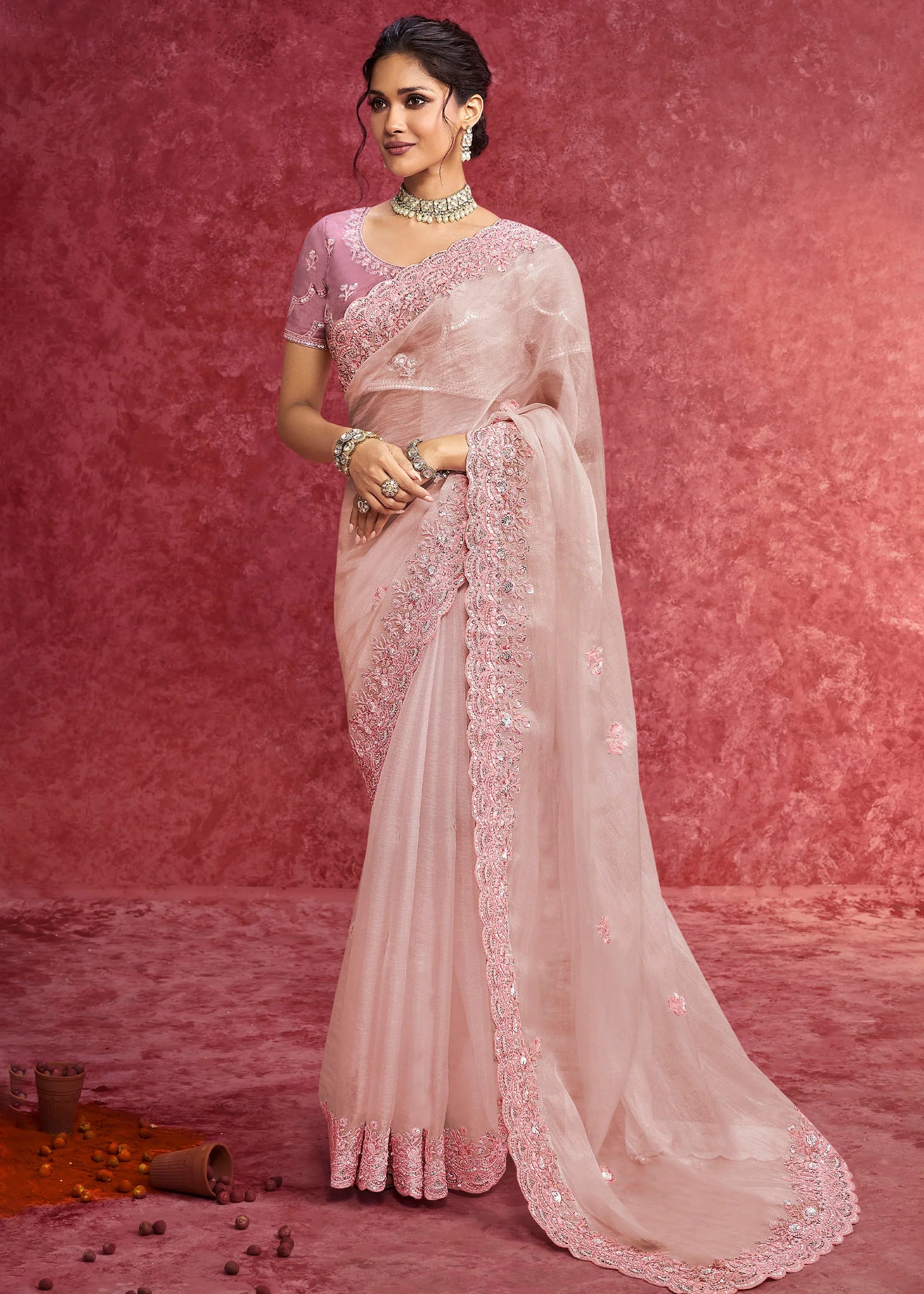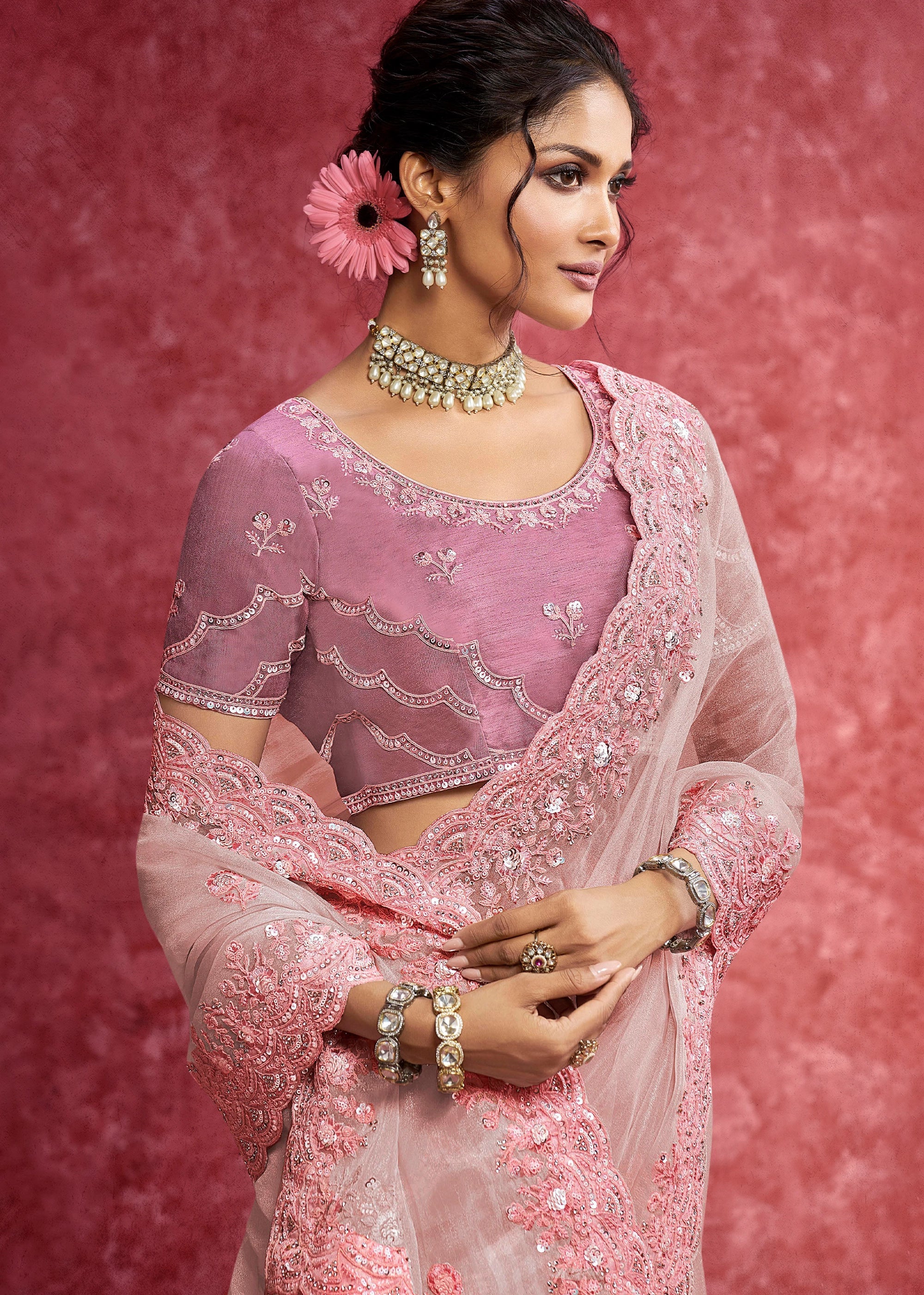 This elegant designer saree is crafted from premium fabric, featuring intricate heavy zari, resham, and sequin embroidery. The delicate stonework and lace border make it a perfect choice for weddings and special occasions.