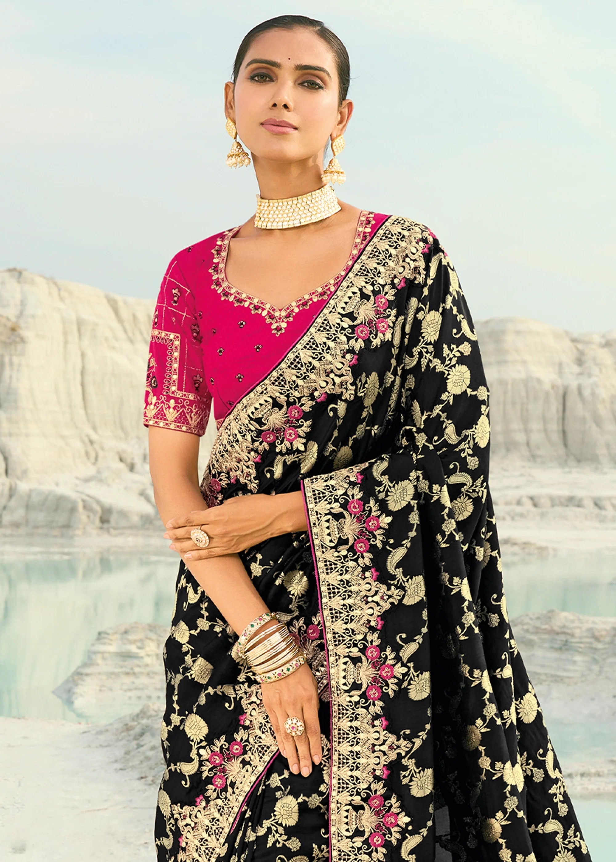This stunning black dola viscose saree showcases timeless elegance with rich zari floral embroidery, sequins, and moti work, perfect for weddings and festive wear.