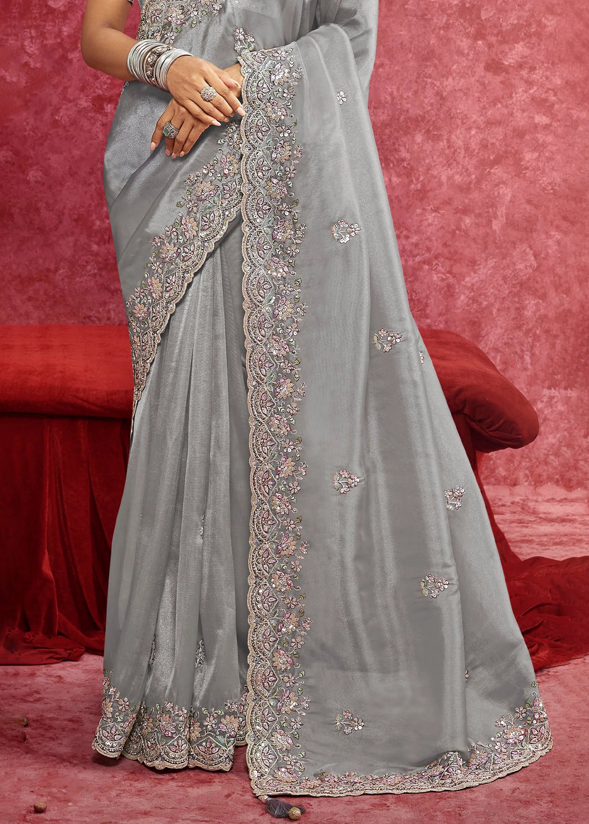 This elegant designer saree is crafted from premium fabric, featuring intricate heavy zari, resham, and sequin embroidery. The delicate stonework and lace border make it a perfect choice for weddings and special occasions.