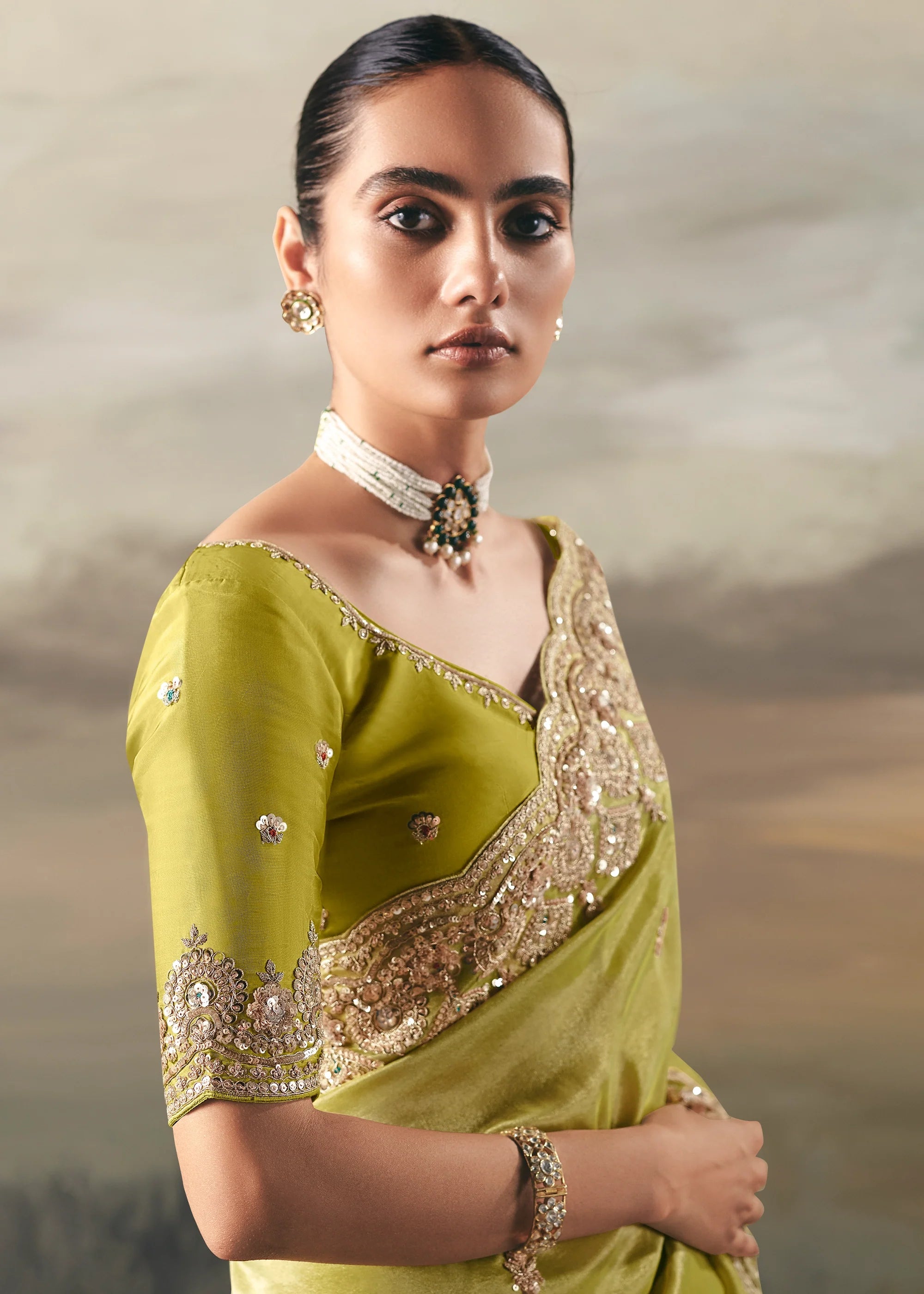 Lime Green Tissue Embroidered Wedding Wear Saree