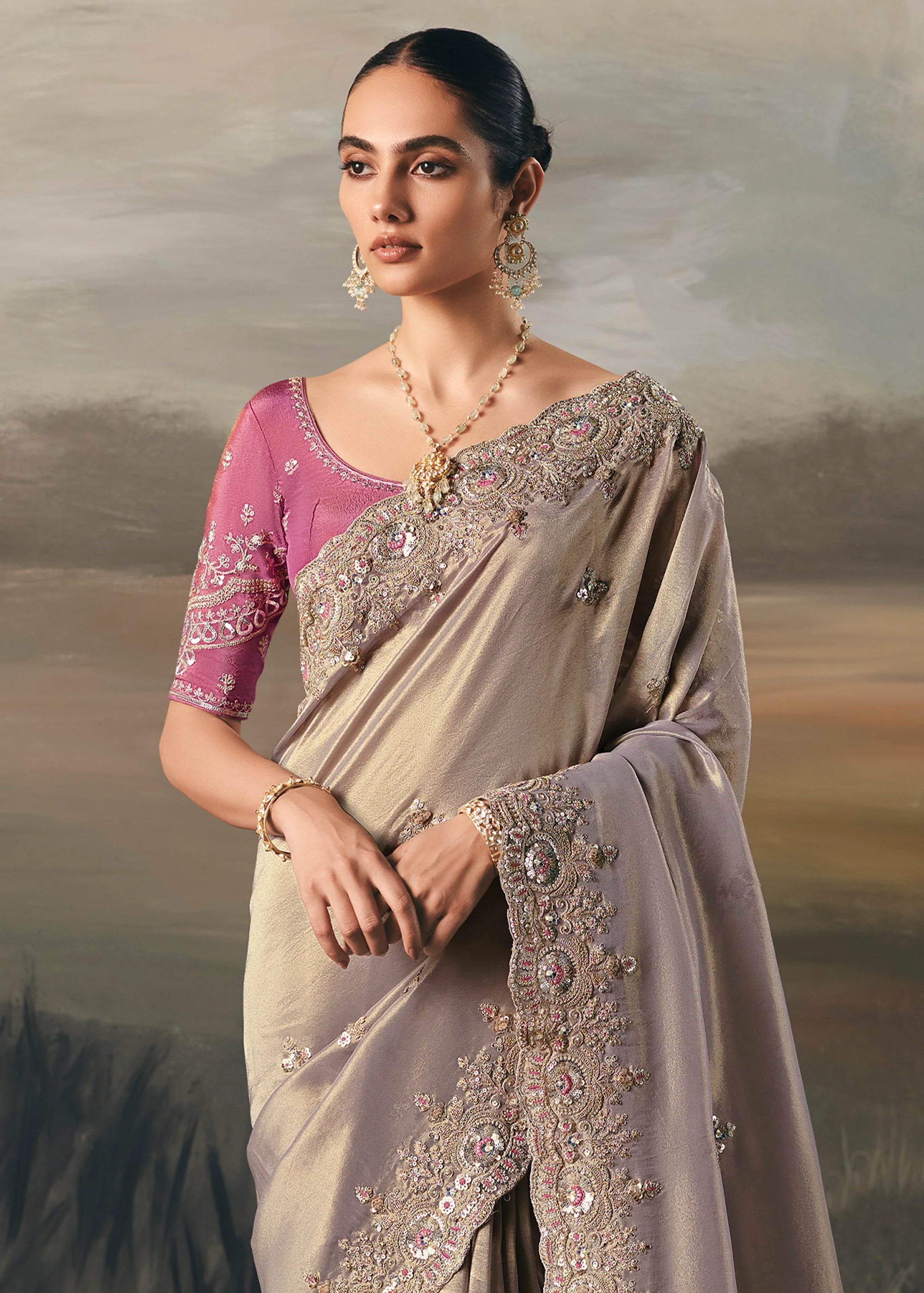 Experience unmatched opulence in this Tissue Zari Saree. Featuring detailed Resham embroidery, floral motifs, and a rich medley of pearls, sequins,...