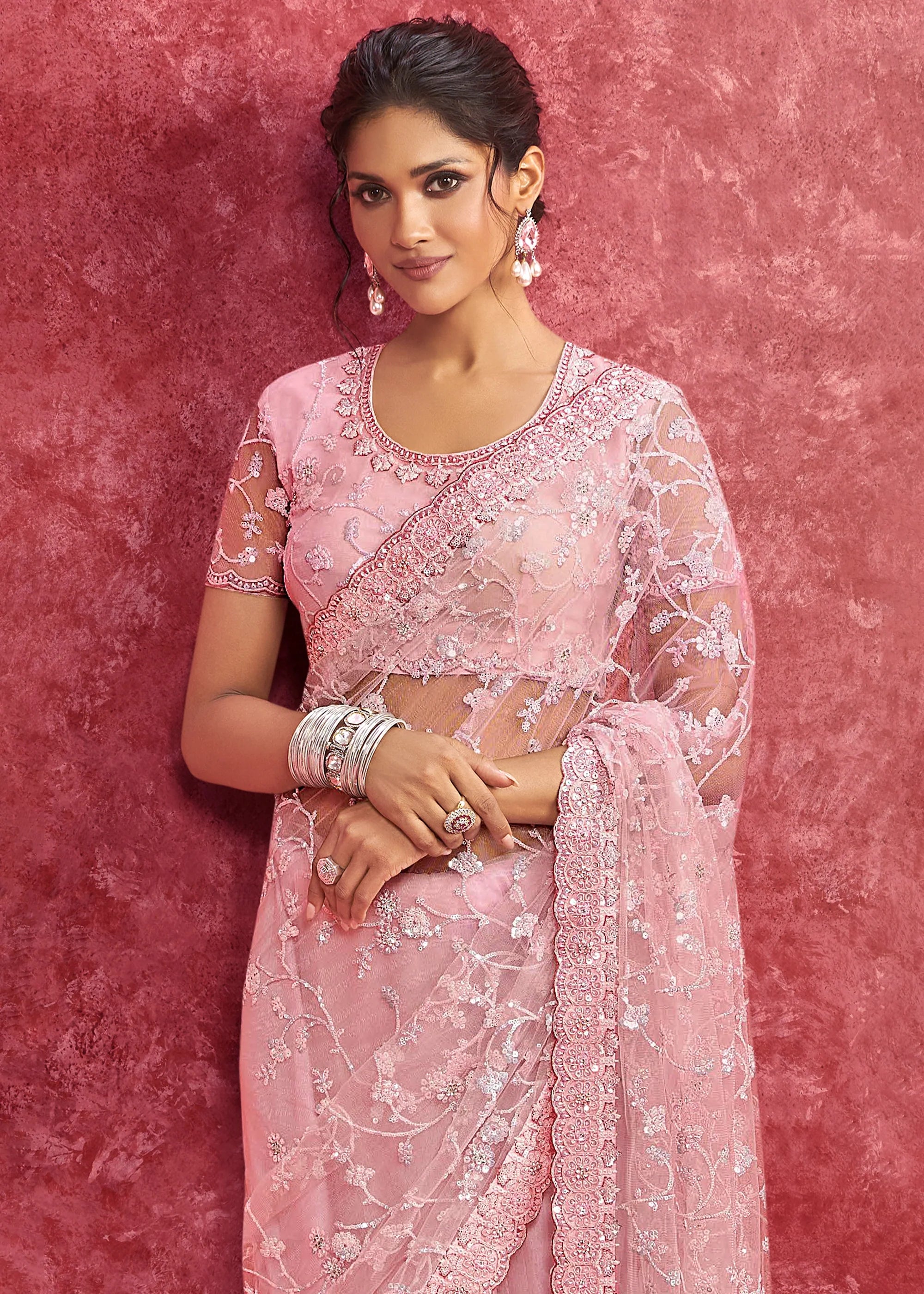 This elegant designer saree is crafted from premium fabric, featuring intricate heavy zari, resham, and sequin embroidery. The delicate stonework and lace border make it a perfect choice for weddings and special occasions.