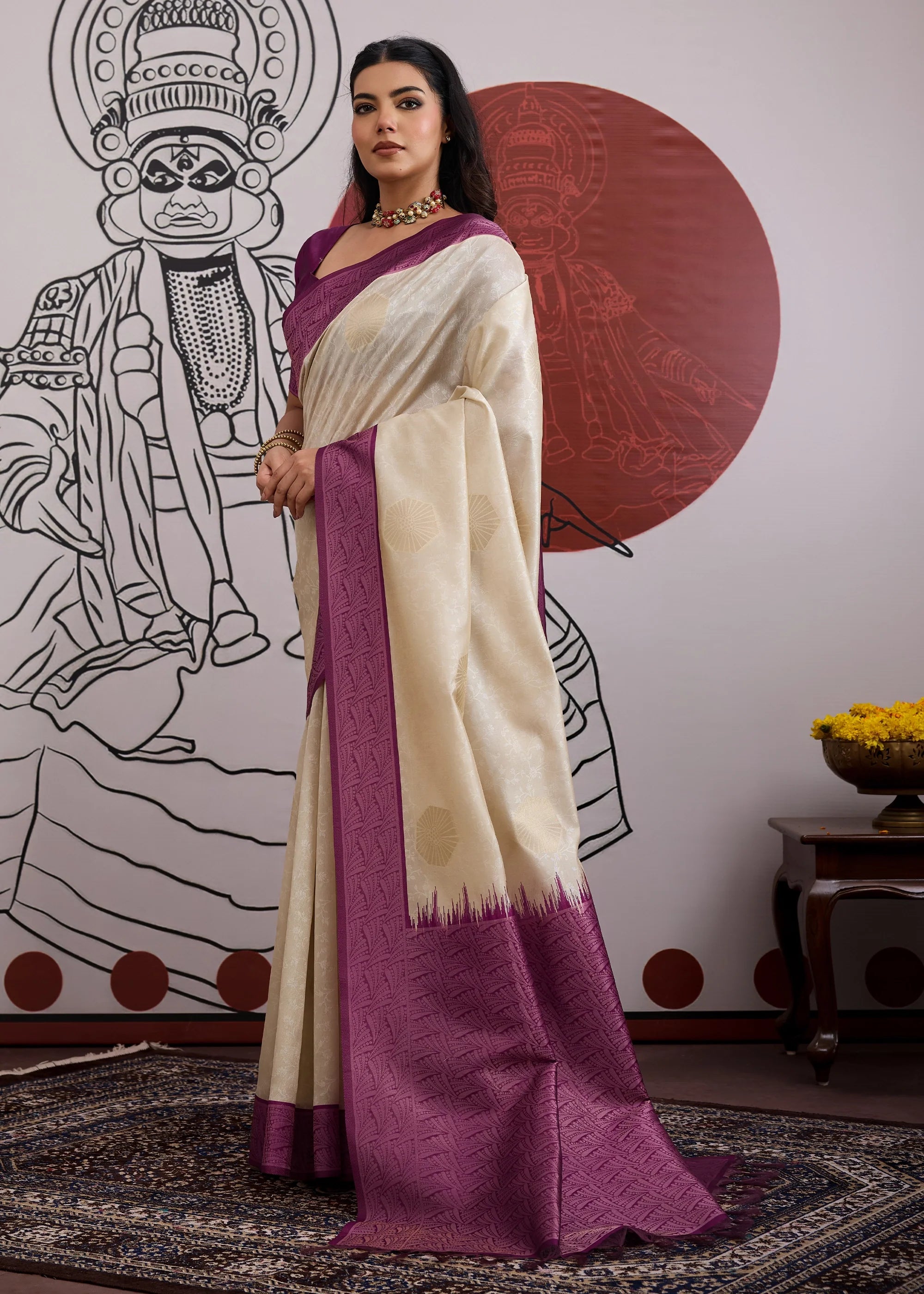 Radiate sheer sophistication in this soft silk saree, featuring a luminous dual-tone texture. Its weightless drape and golden Zari borders create a modern masterpiece for the discerning woman.