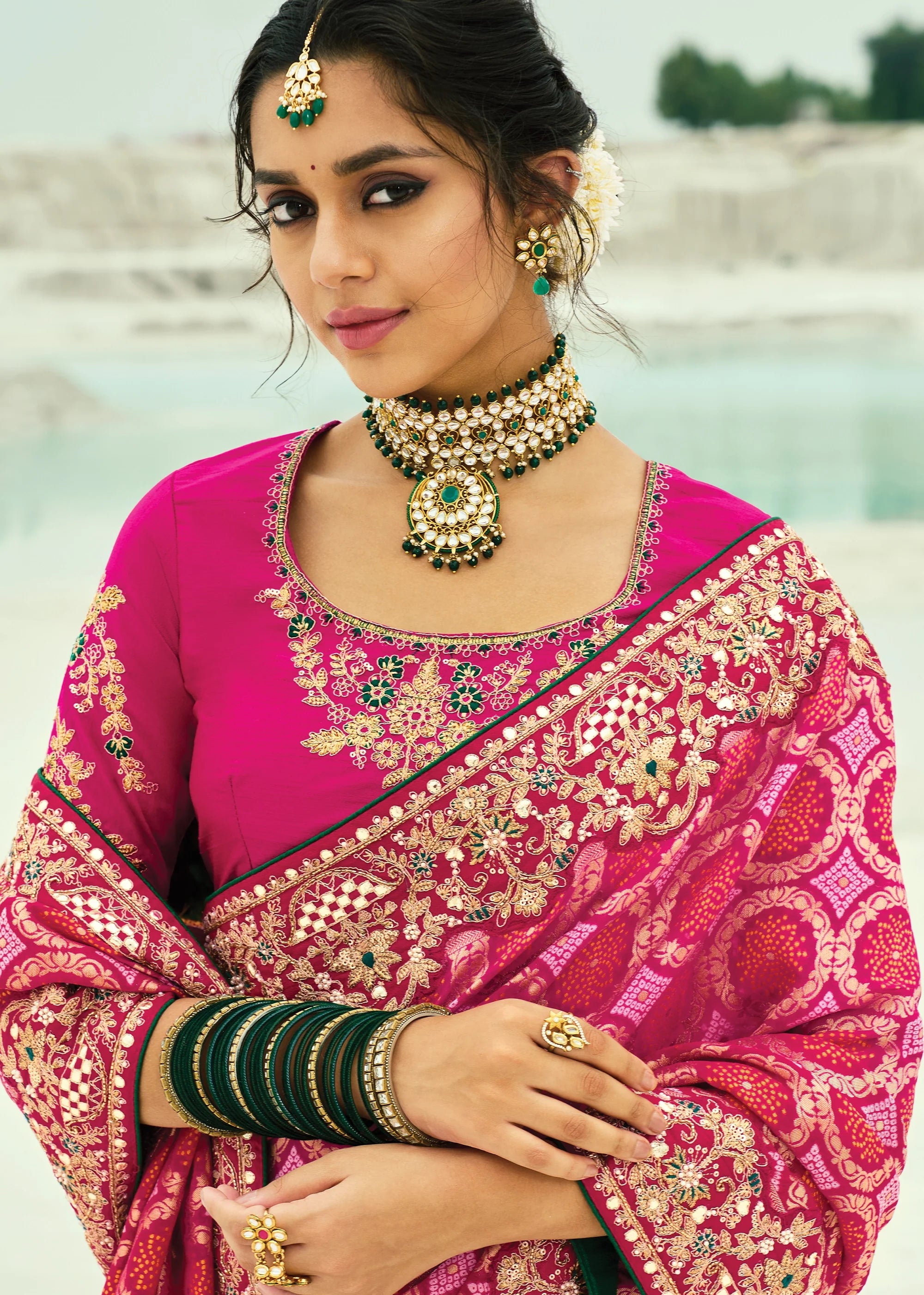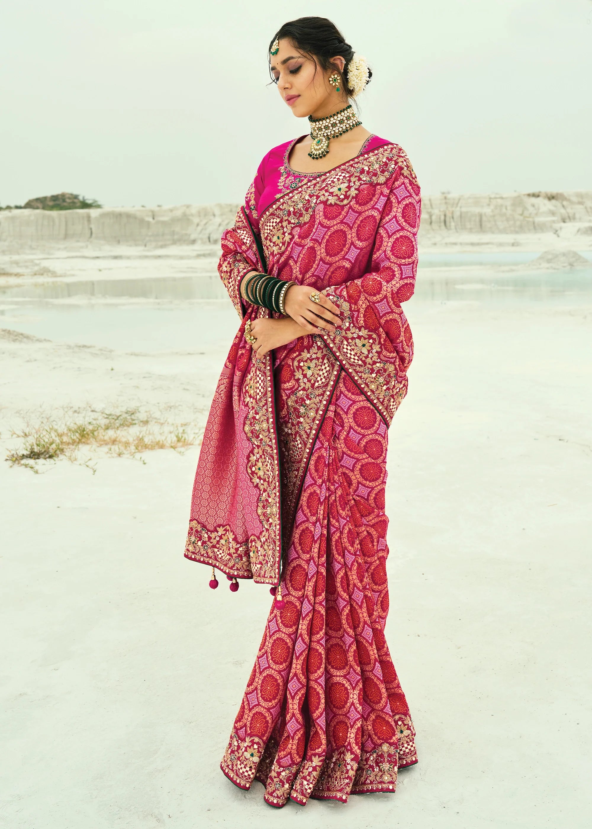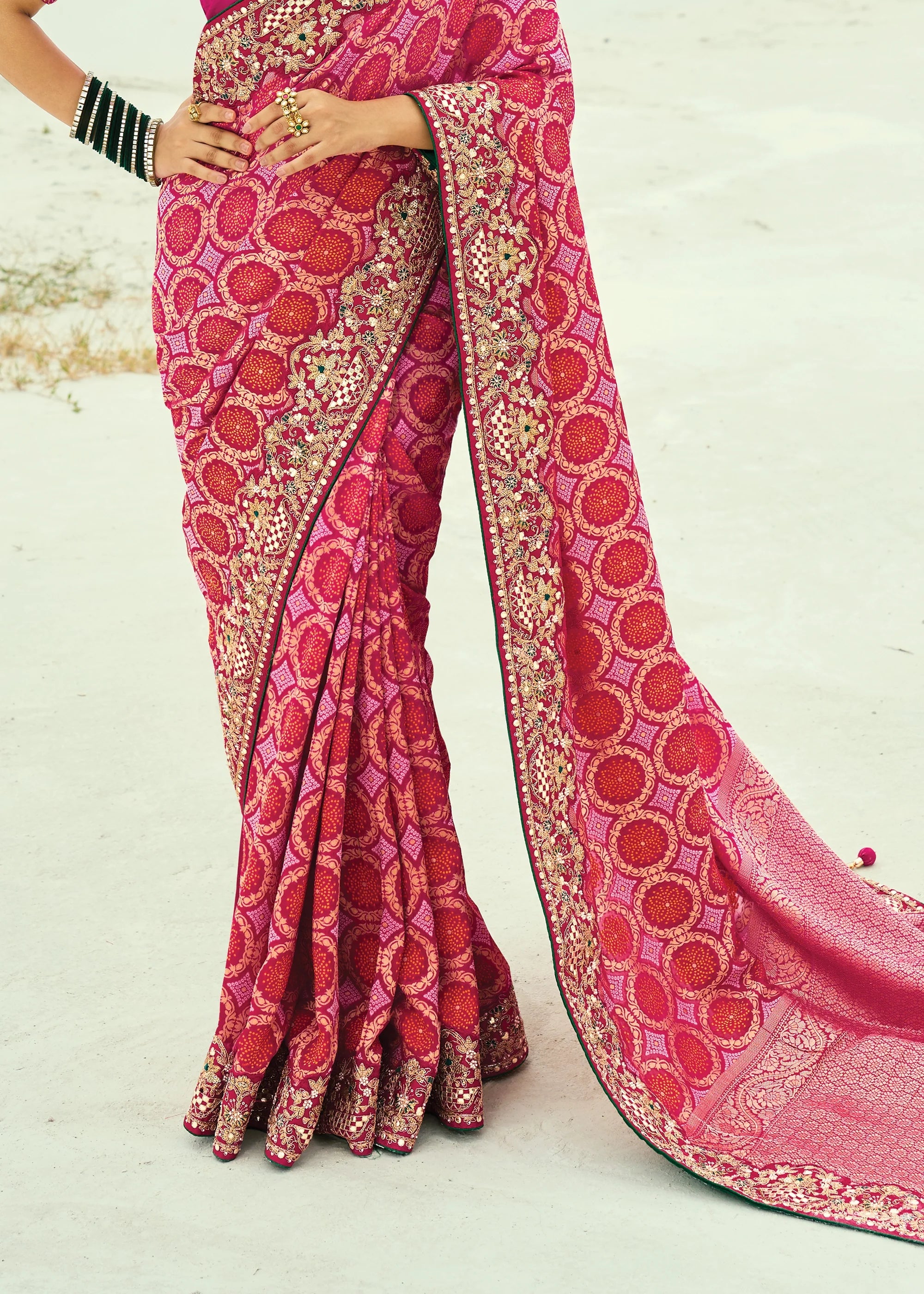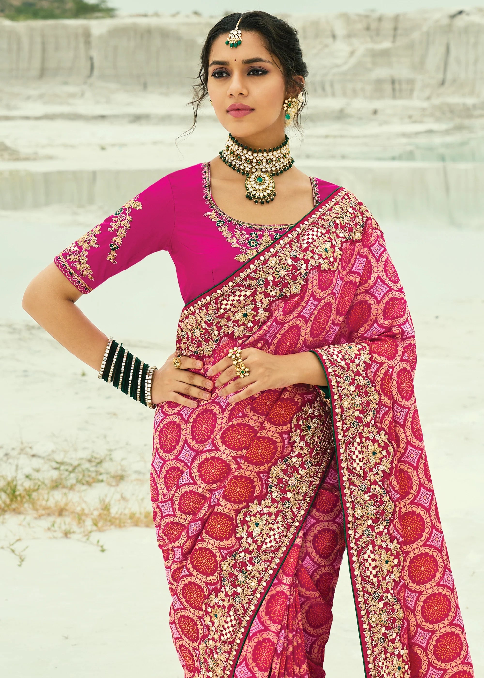This stunning rani pink georgette saree features traditional bandhej print and heavy borders. It is beautifully embellished with intricate resham, sequins, pearls, zari, and cutdana work, perfect for weddings or functions.