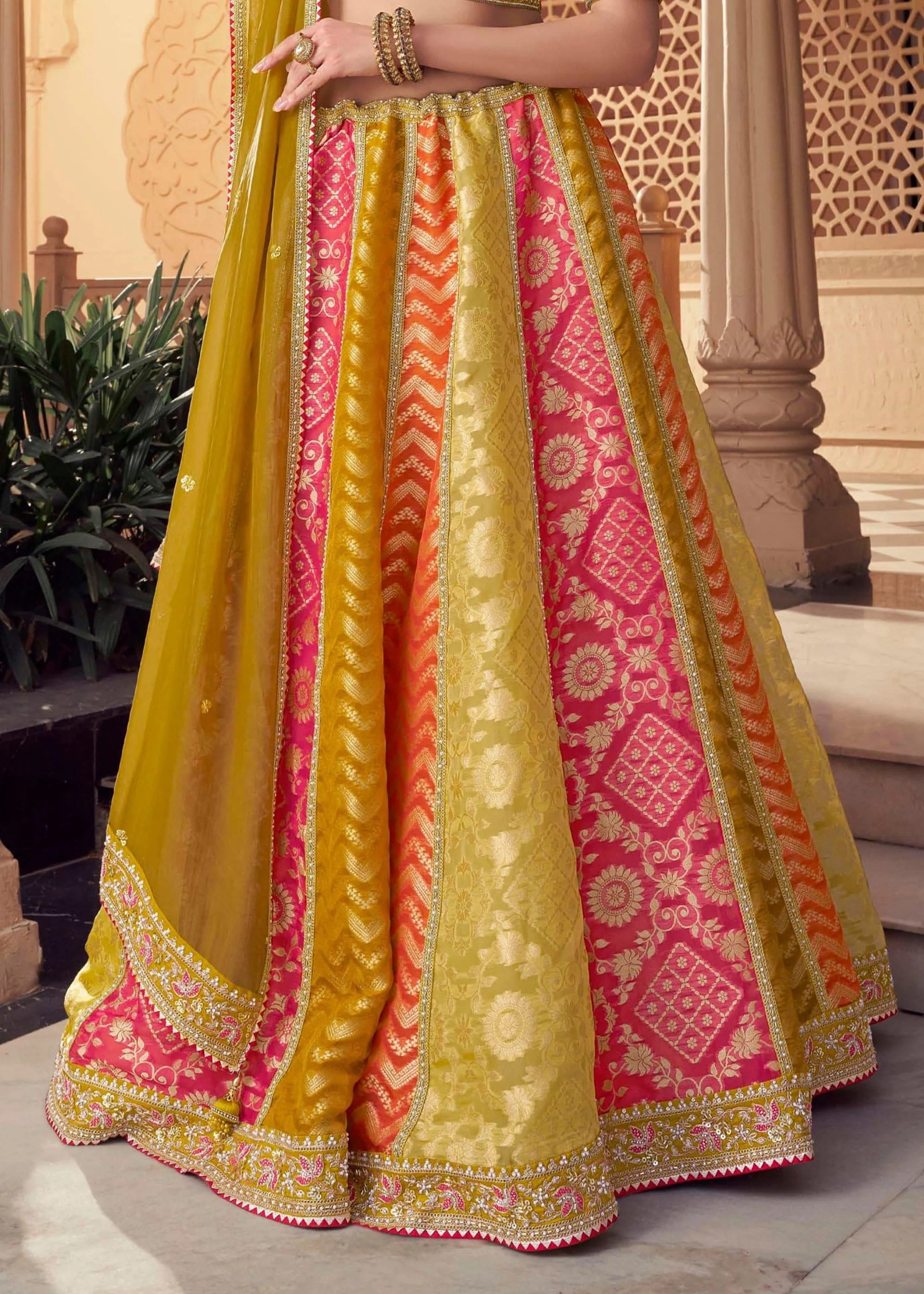 This stunning embroidered lehenga features intricate floral motifs and delicate beadwork, creating a mesmerizing visual spectacle. The flowing skirt and intricately designed blouse make it perfect for weddings and special occasions.