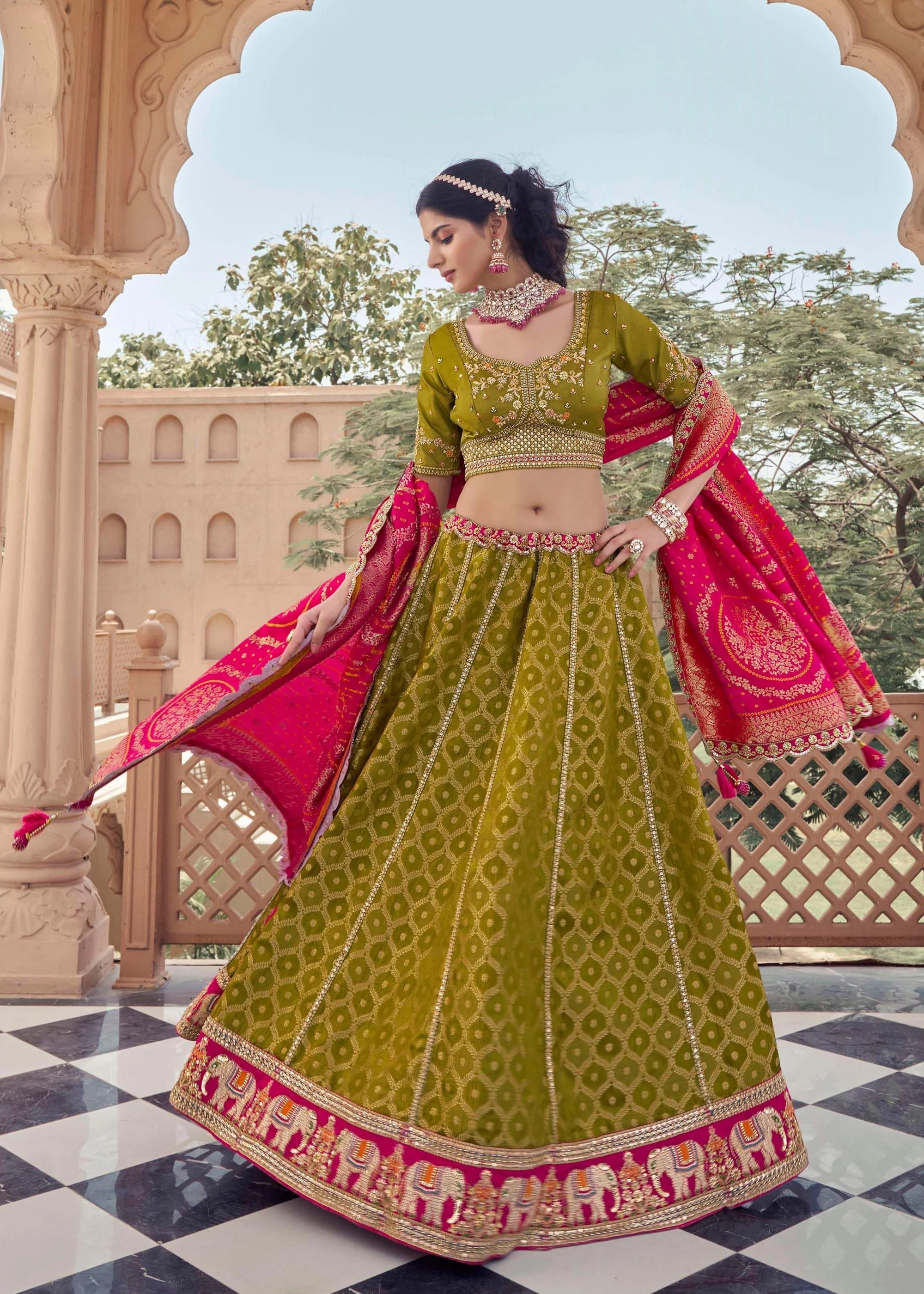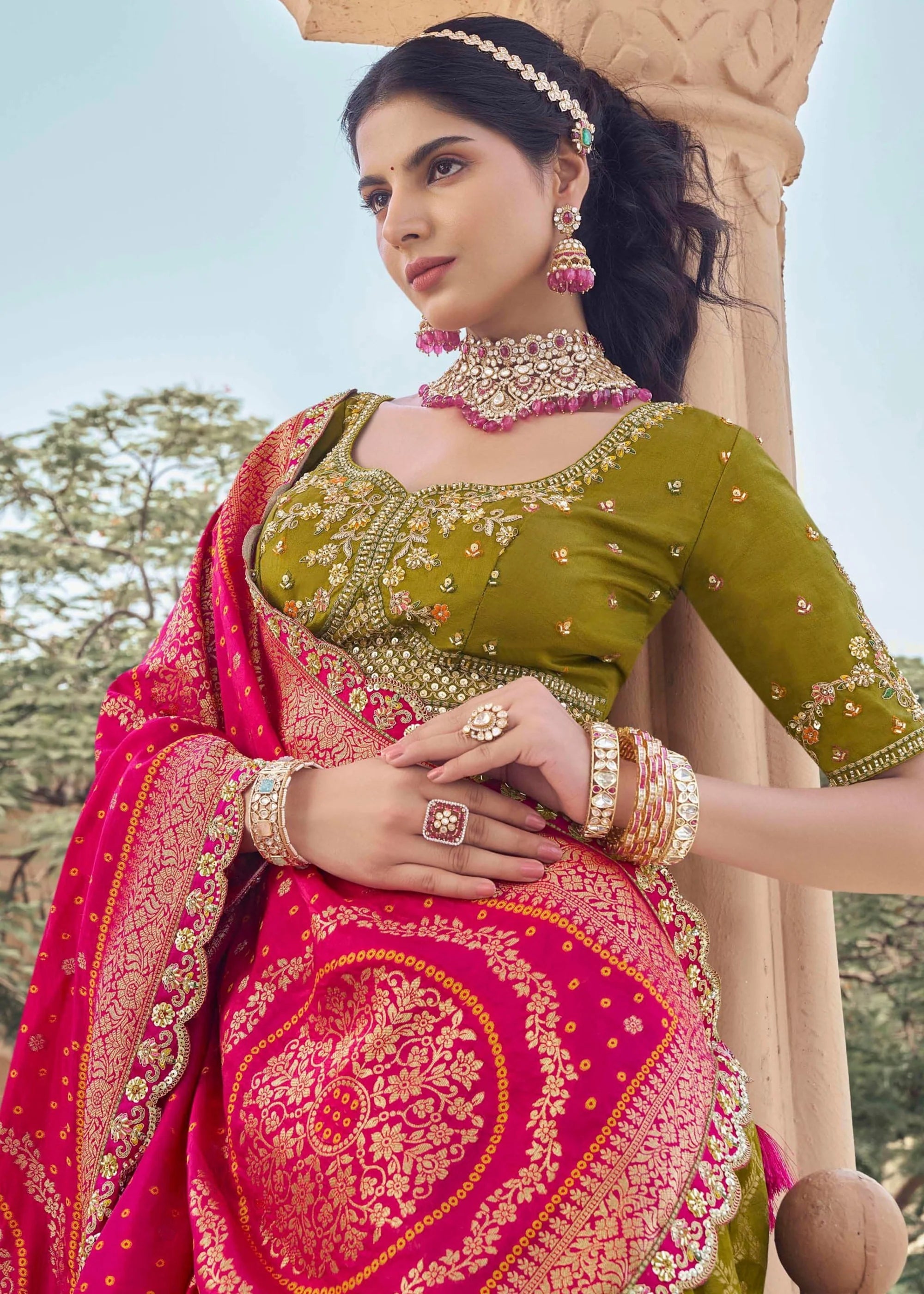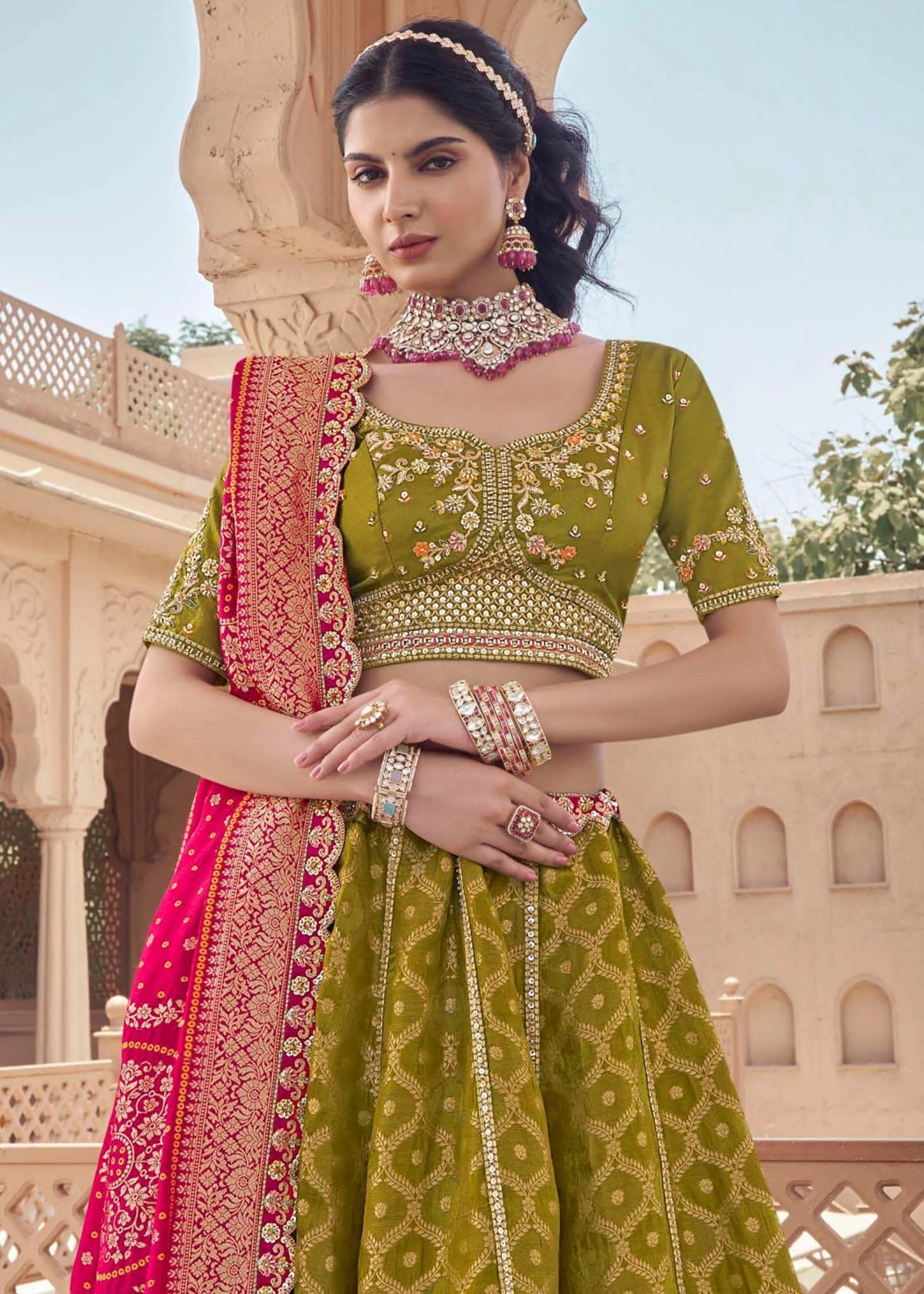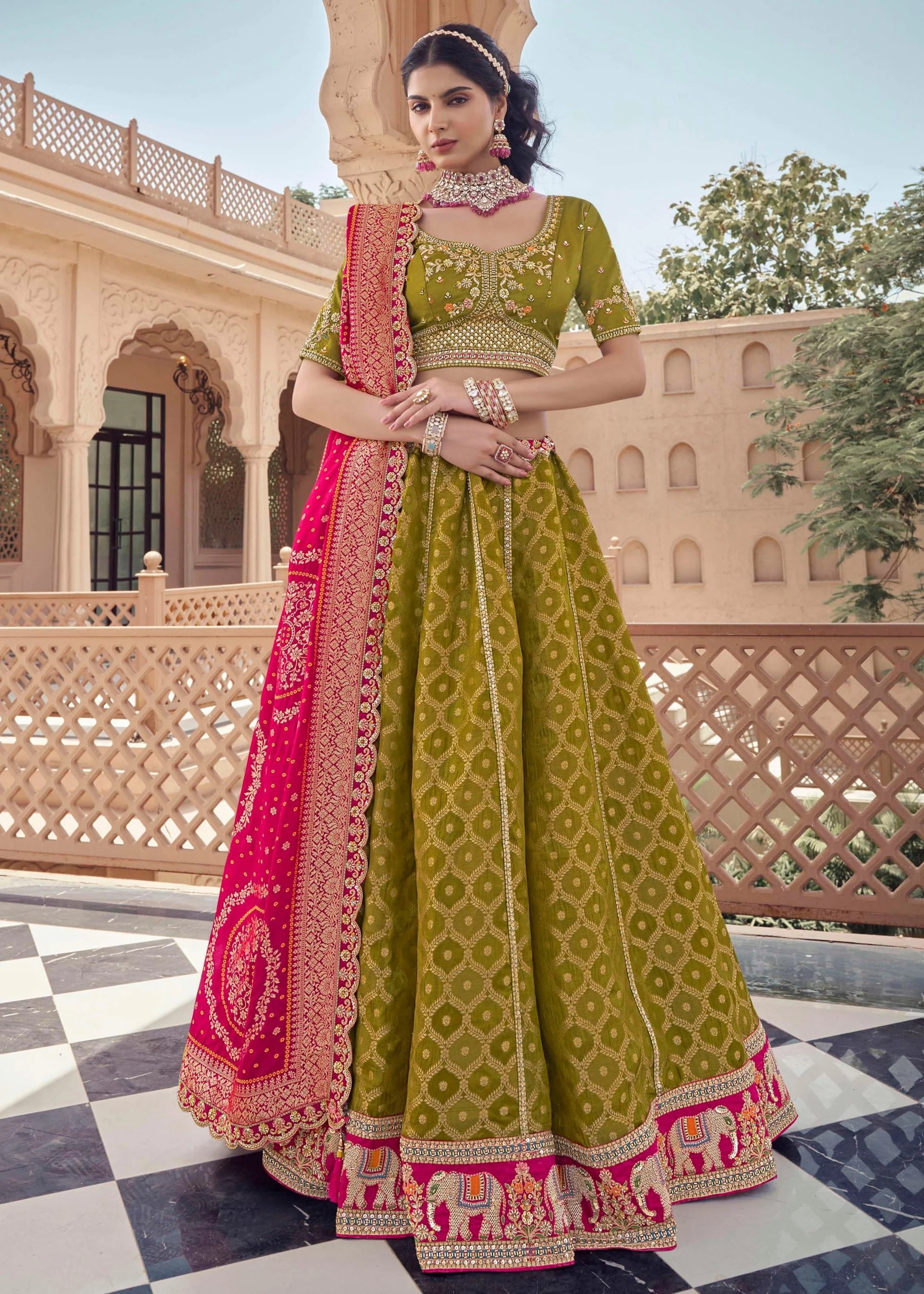 This stunning embroidered lehenga features intricate floral motifs and delicate beadwork, creating a mesmerizing visual spectacle. The flowing skirt and intricately designed blouse make it perfect for weddings and special occasions.