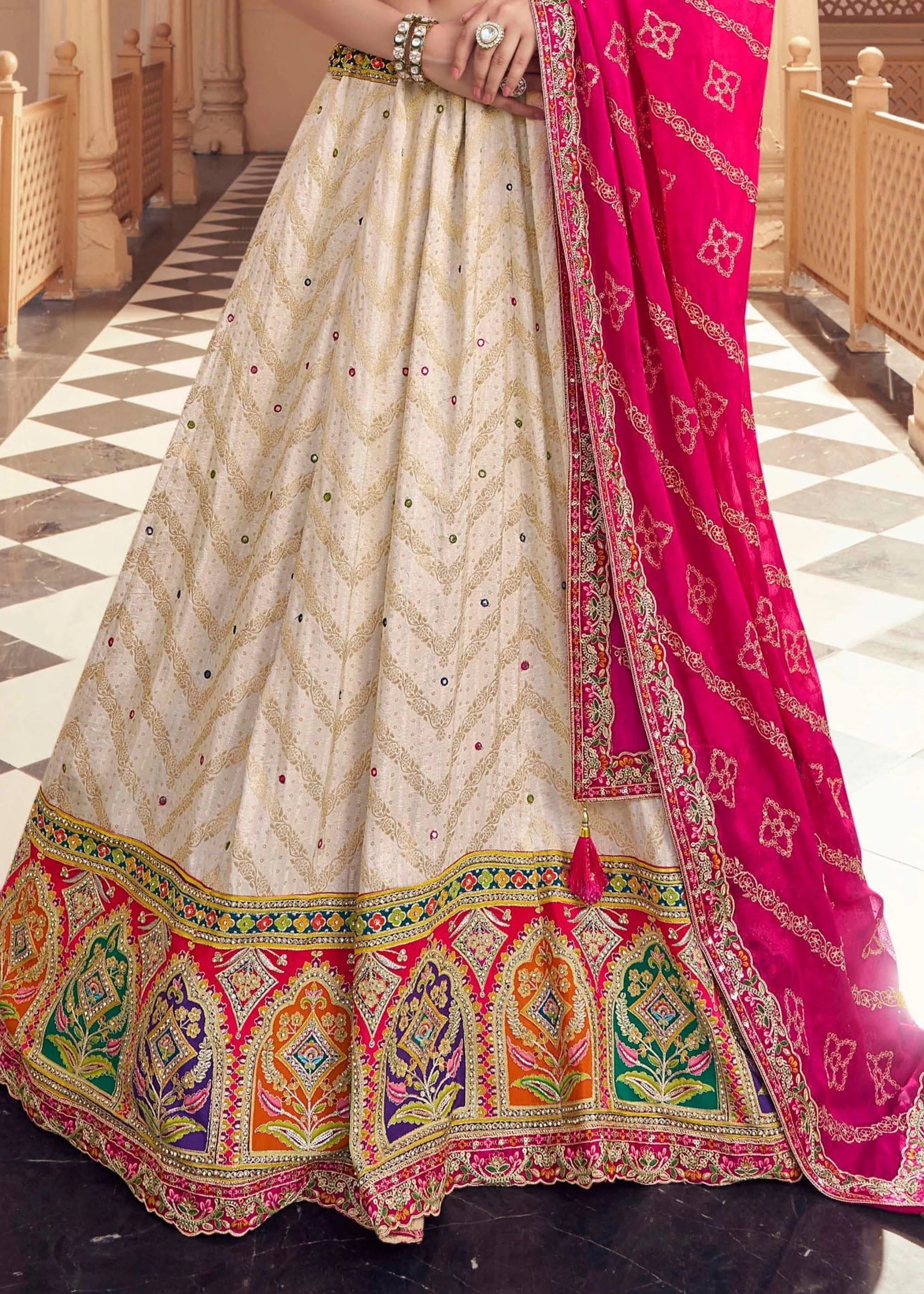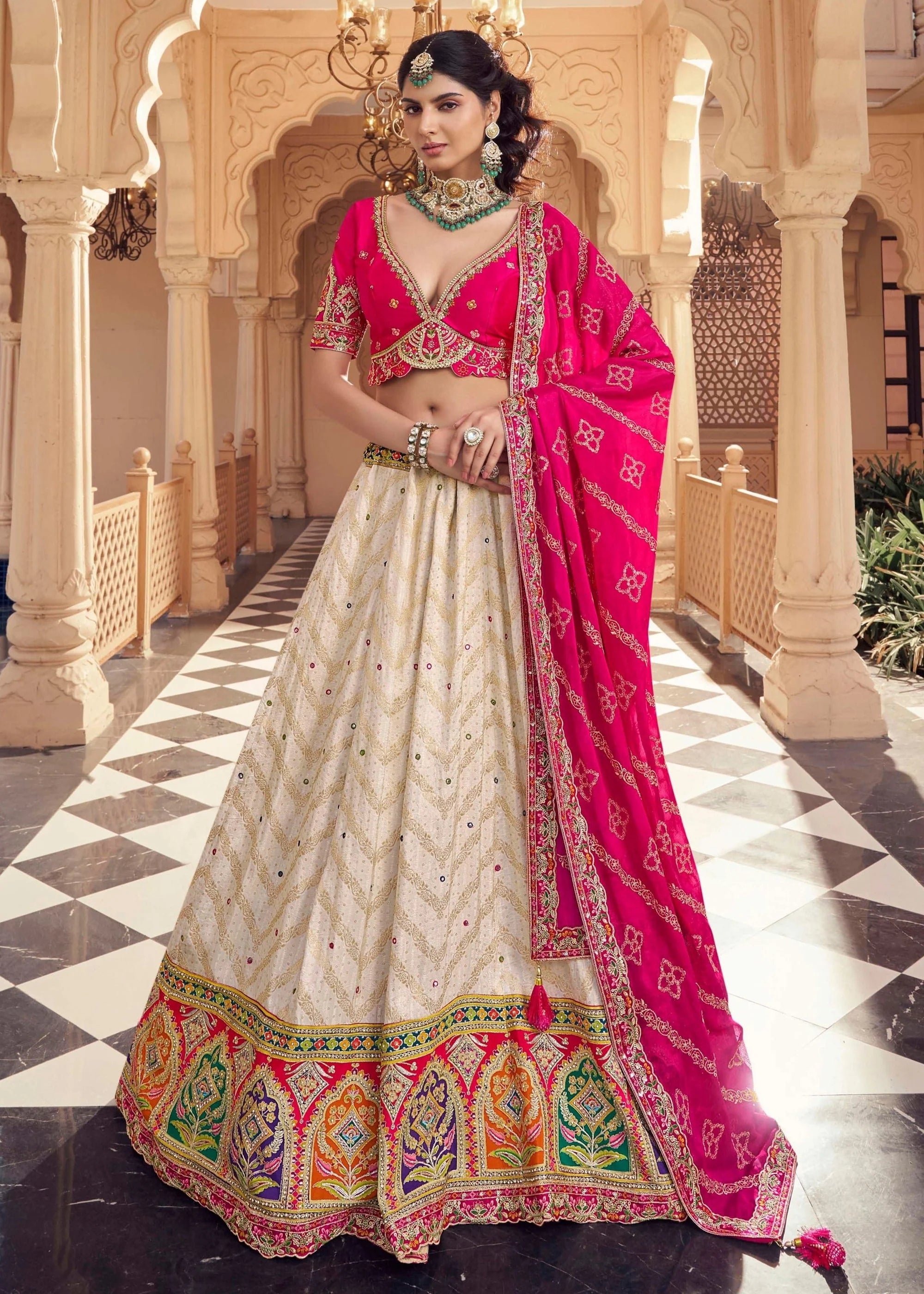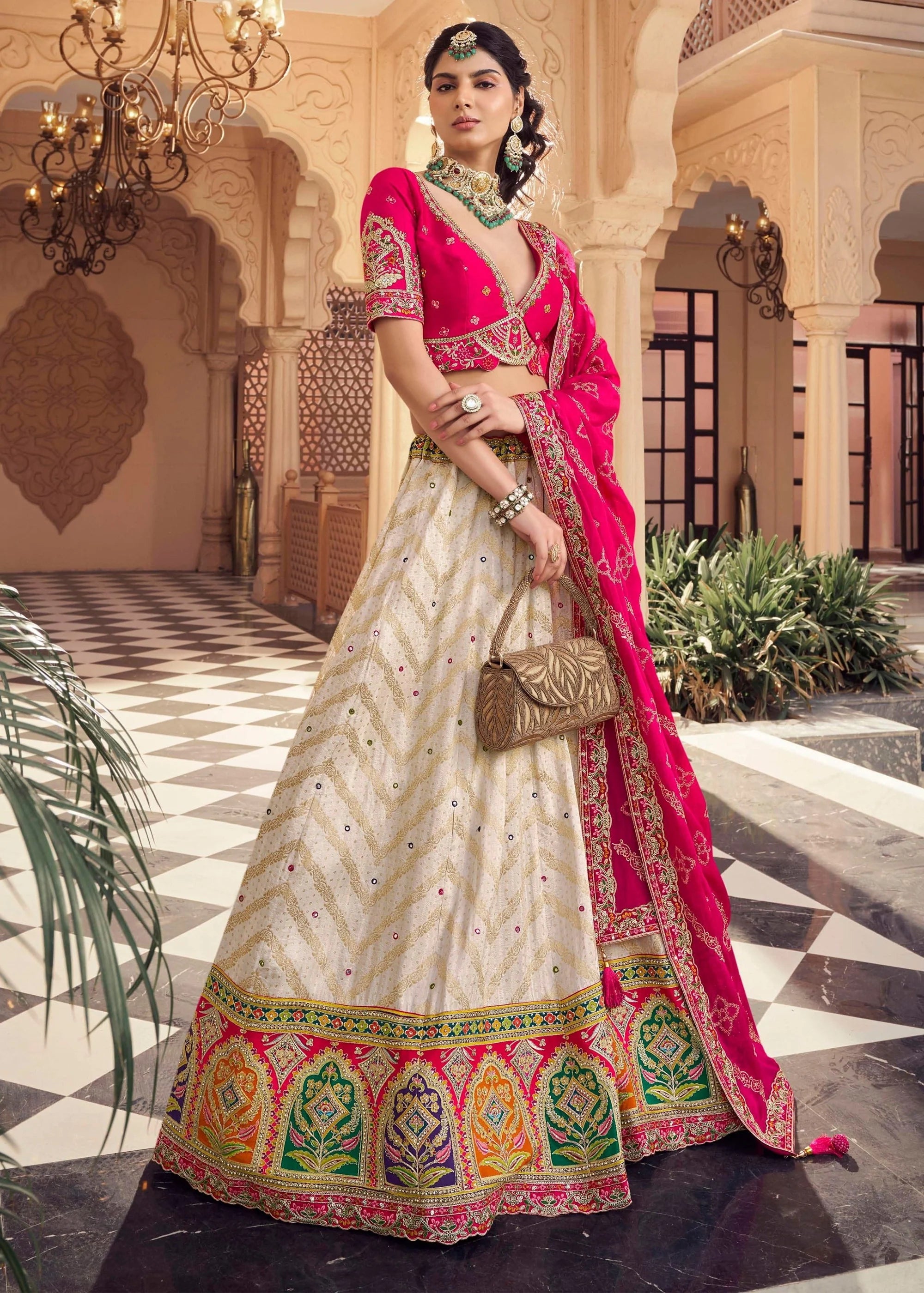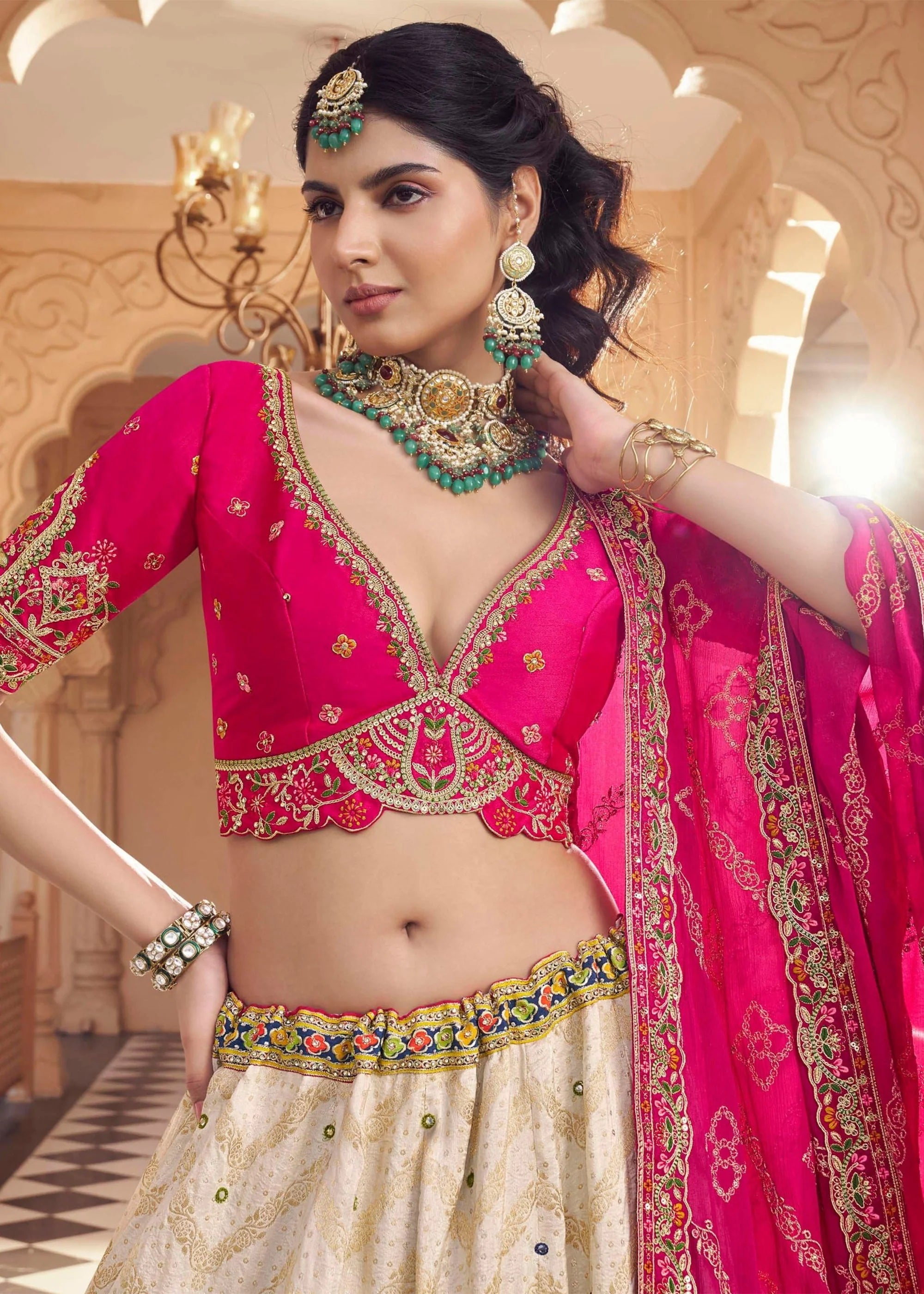 This stunning embroidered lehenga features intricate floral motifs and delicate beadwork, creating a mesmerizing visual spectacle. The flowing skirt and intricately designed blouse make it perfect for weddings and special occasions.