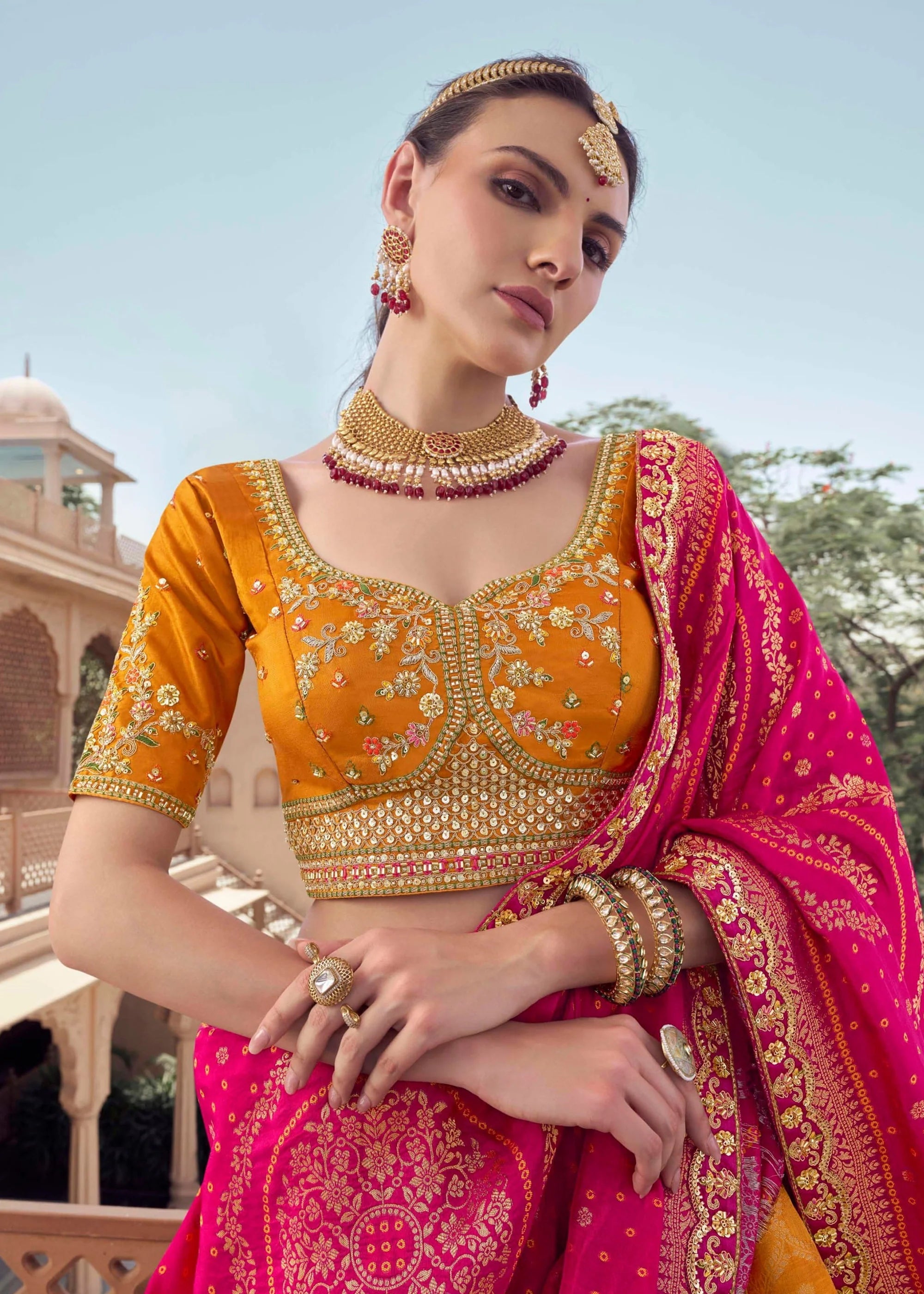 This stunning embroidered lehenga features intricate floral motifs and delicate beadwork, creating a mesmerizing visual spectacle. The flowing skirt and intricately designed blouse make it perfect for weddings and special occasions.
