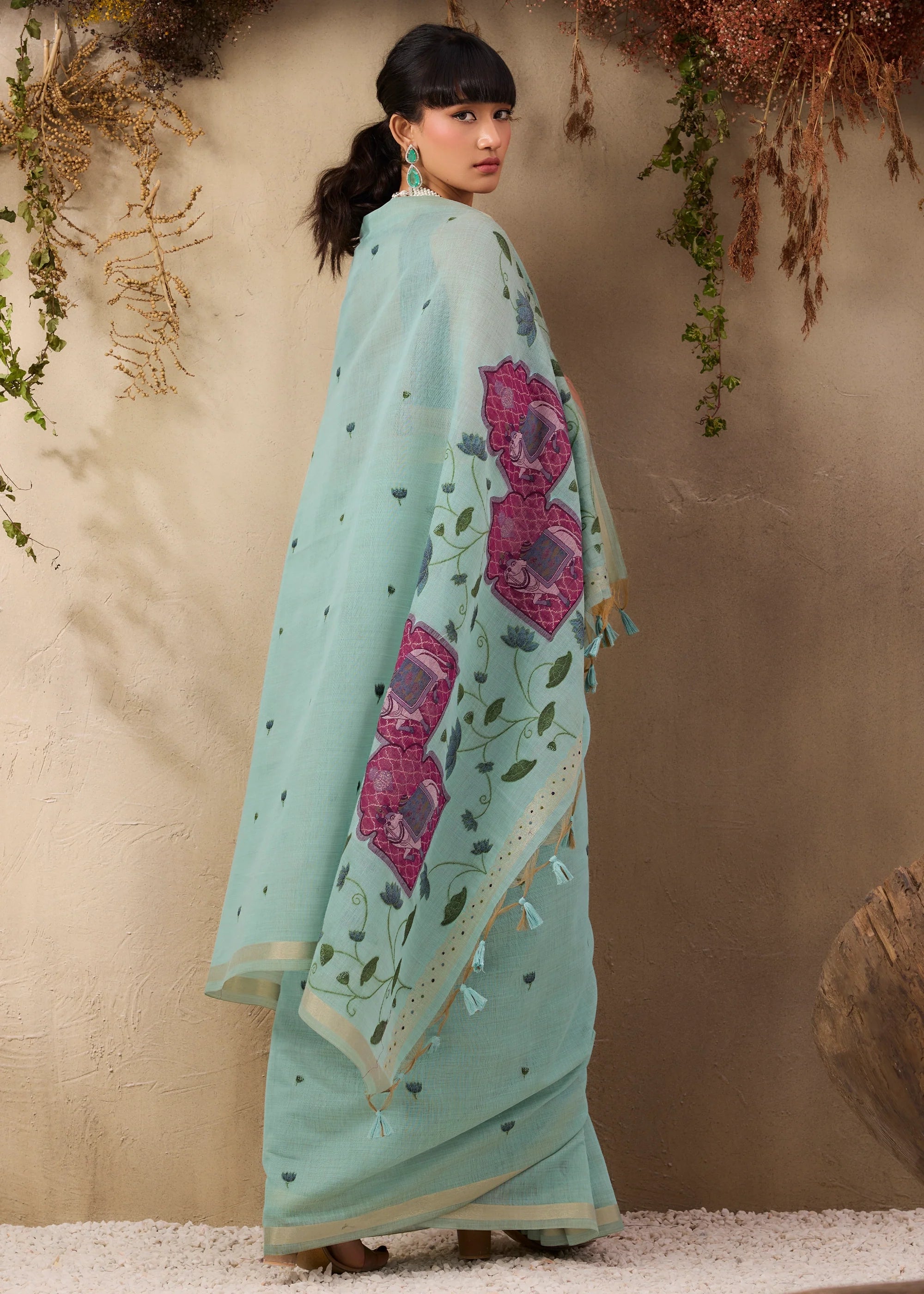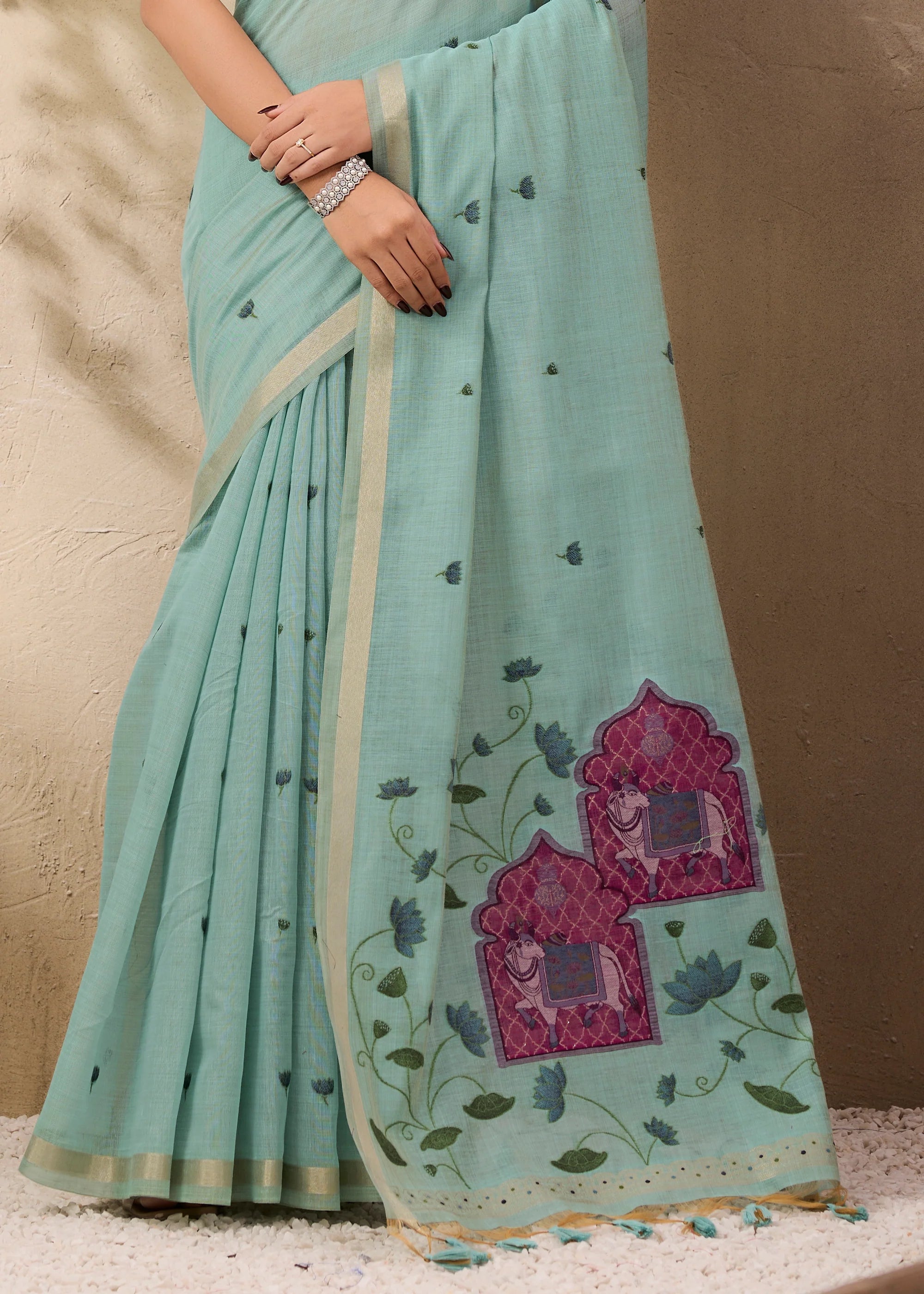 This exquisite saree features a beautiful blend of cotton and silk threads, expertly woven together to create a fabric that is both soft and lustrous. The cotton provides a comfortable drape, while the silk adds a subtle sheen and texture, giving the saree a regal and sophisticated appearance.