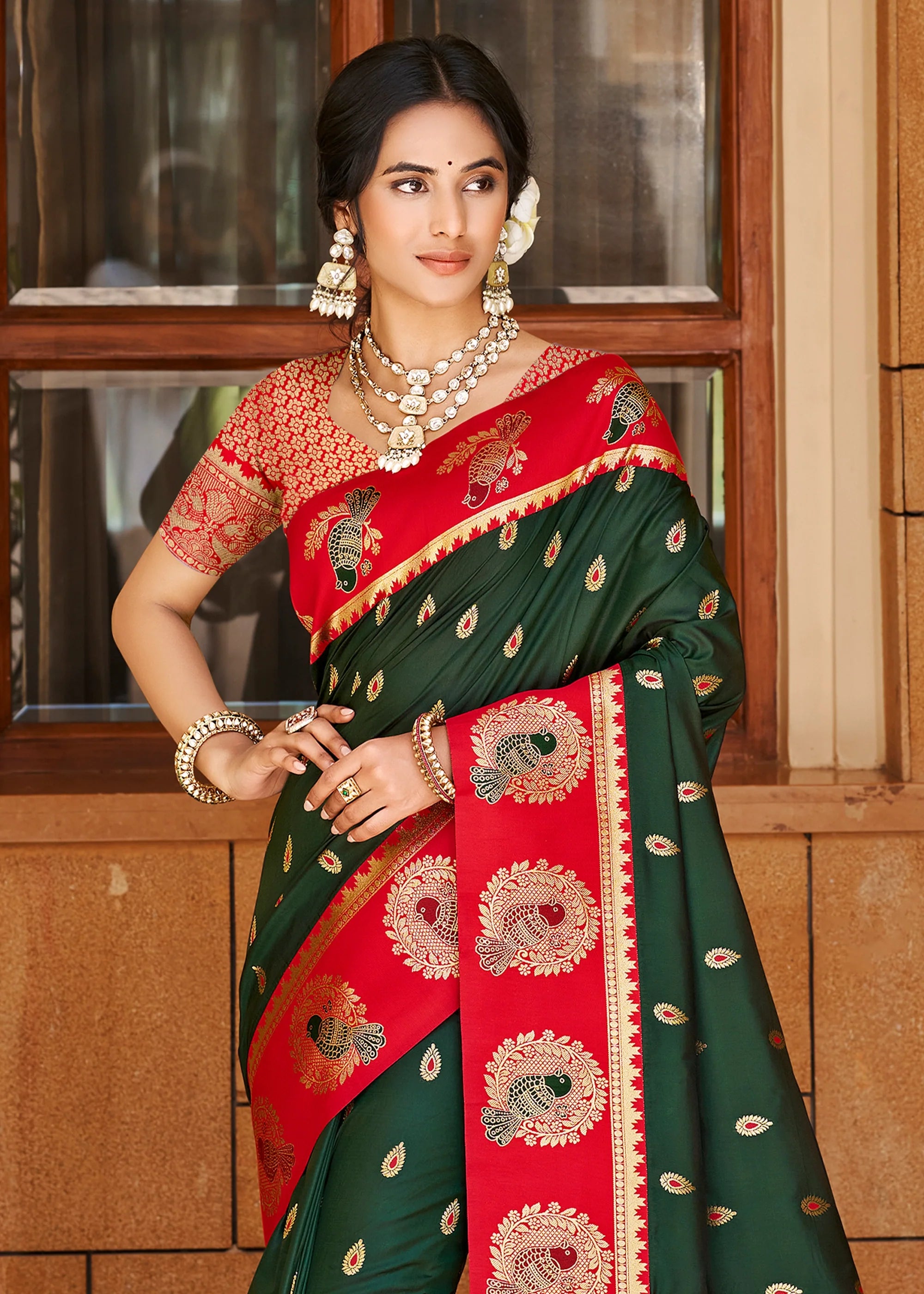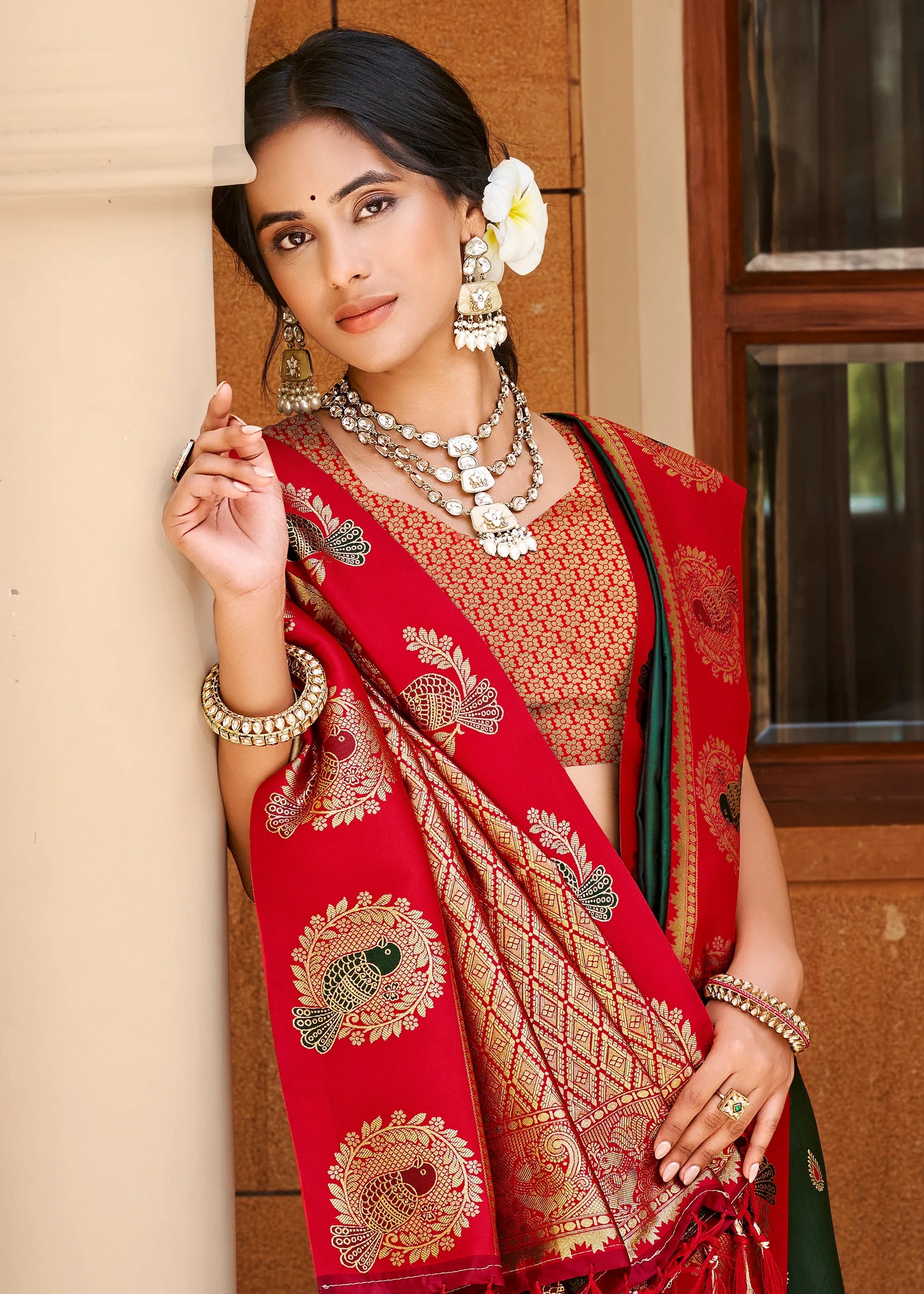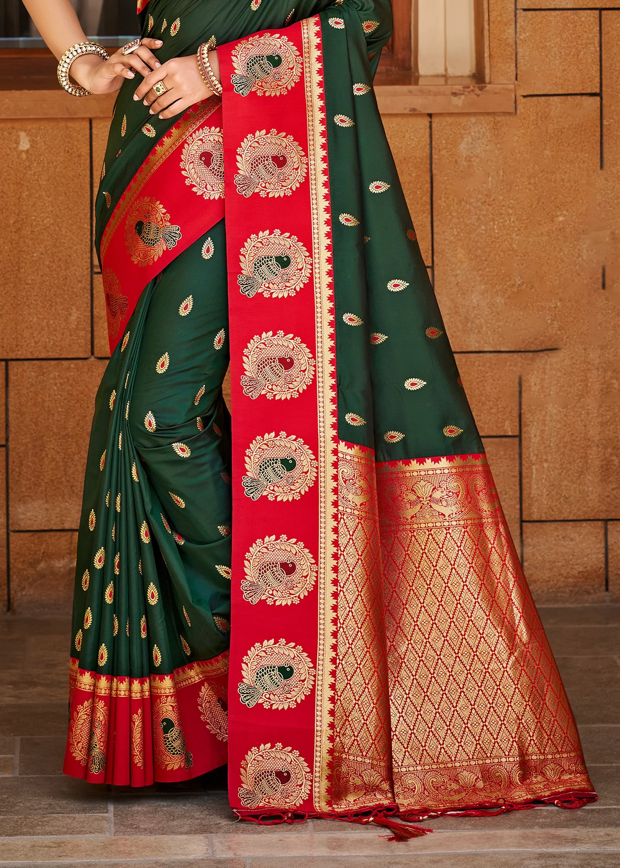 Green & Red Woven Banarasi SIlk Saree