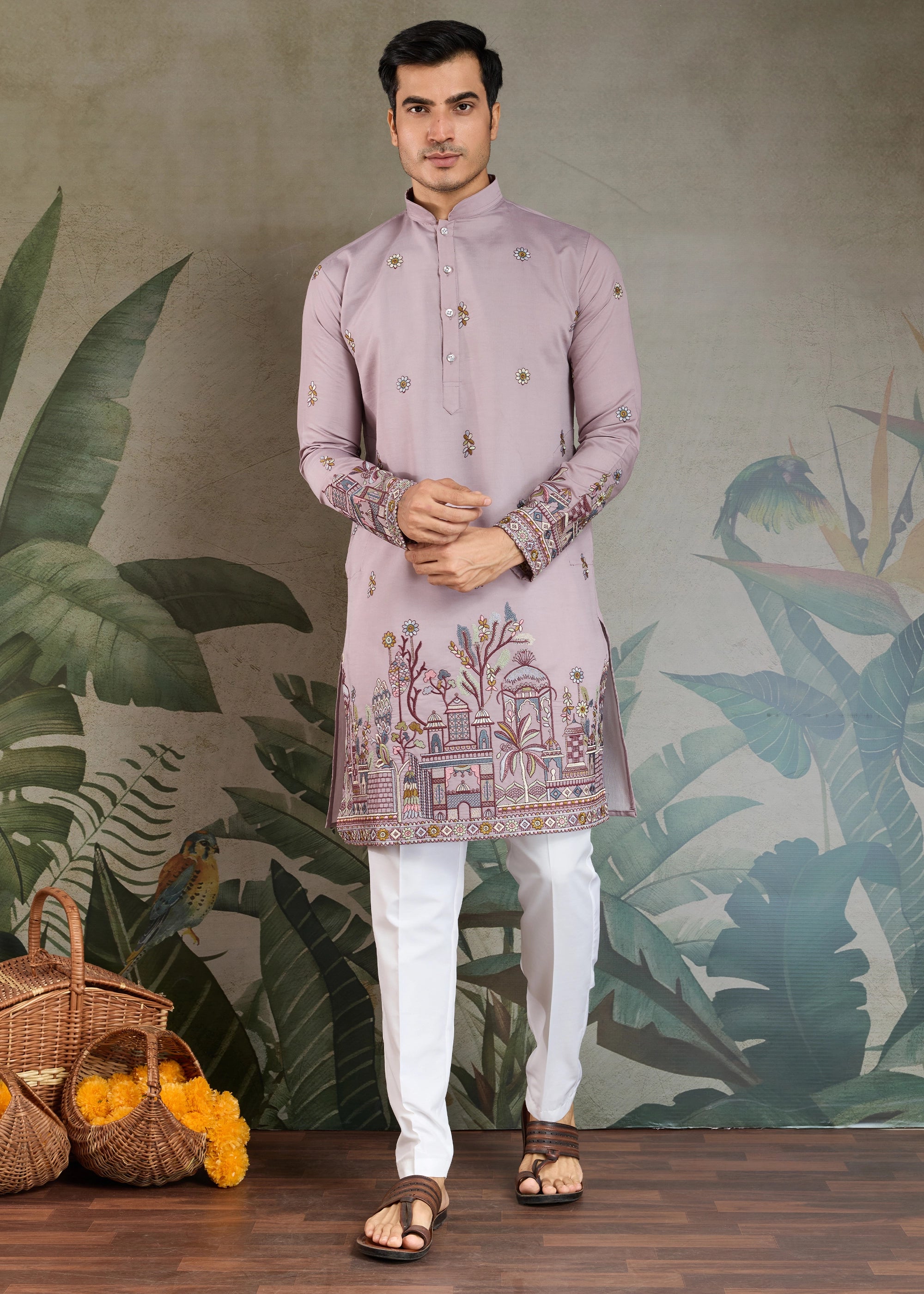This is a stylish and contemporary men's kurta in a light,  The fabric appears to be a lightweight cotton or a similar blend, making it comfortable and breathable.The upper part of the kurta has small, scattered embroidery.The most prominent feature is a detailed, multi-colored border running horizontally along the hemline.The sleeves are adorned with a similar detailed pattern at the cuffs.