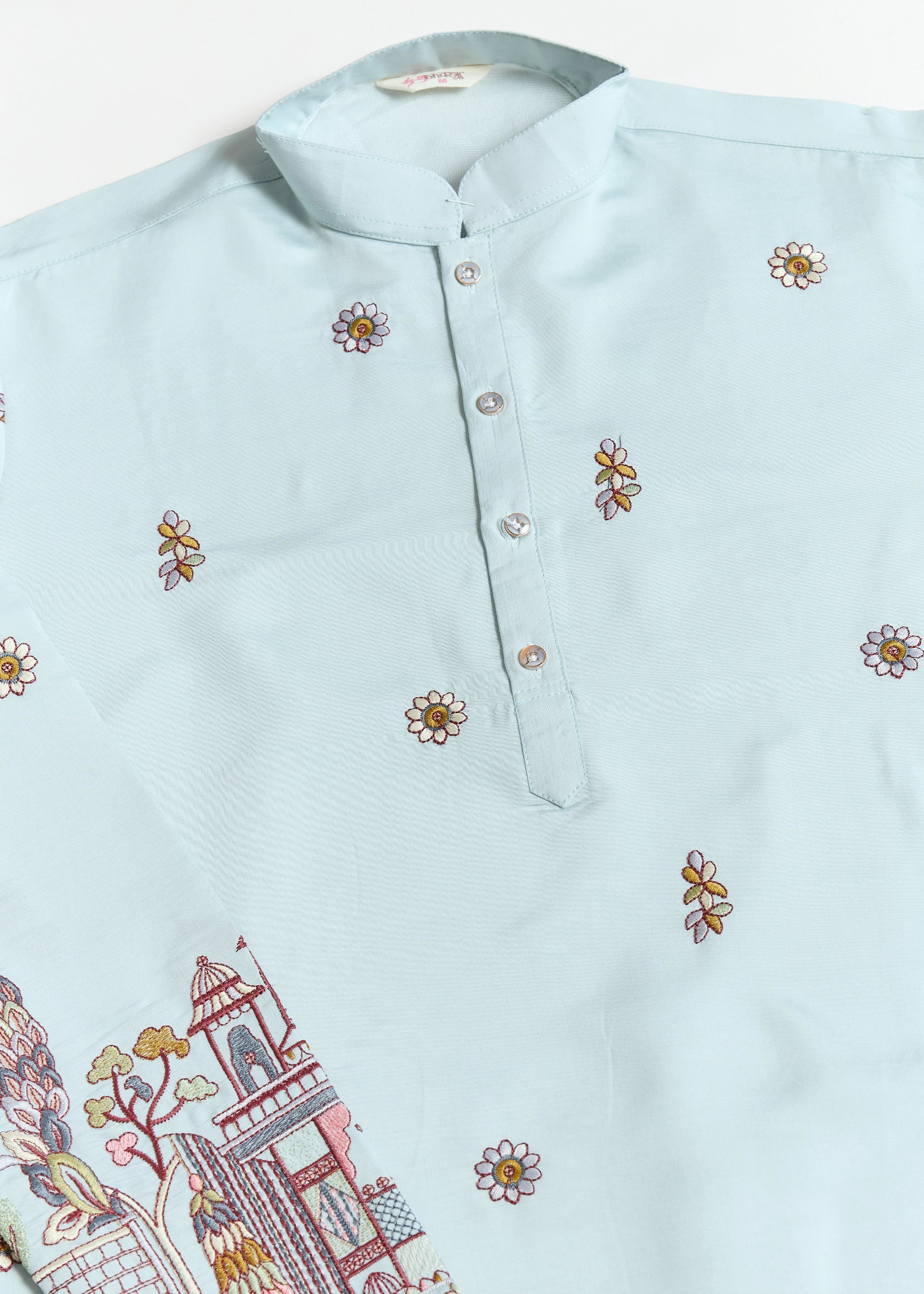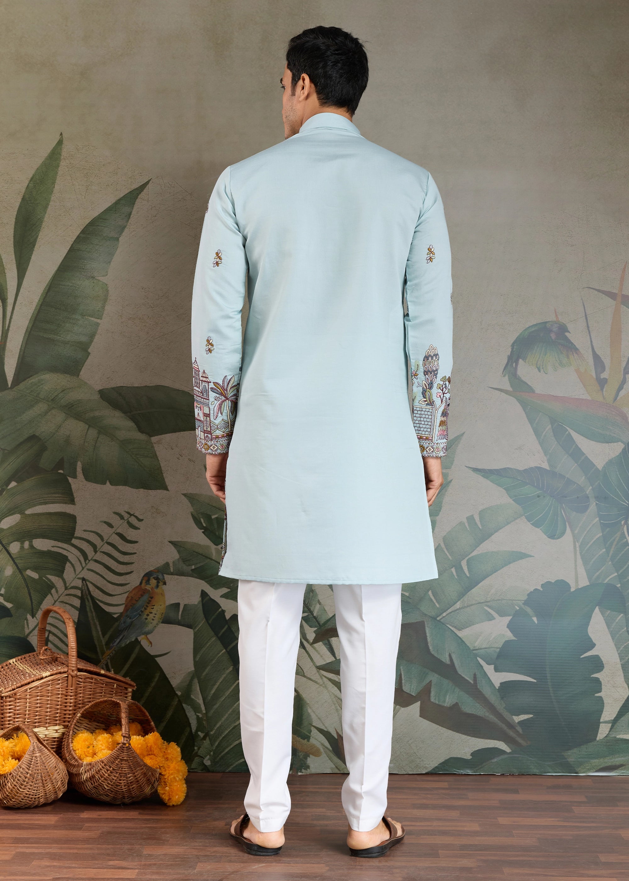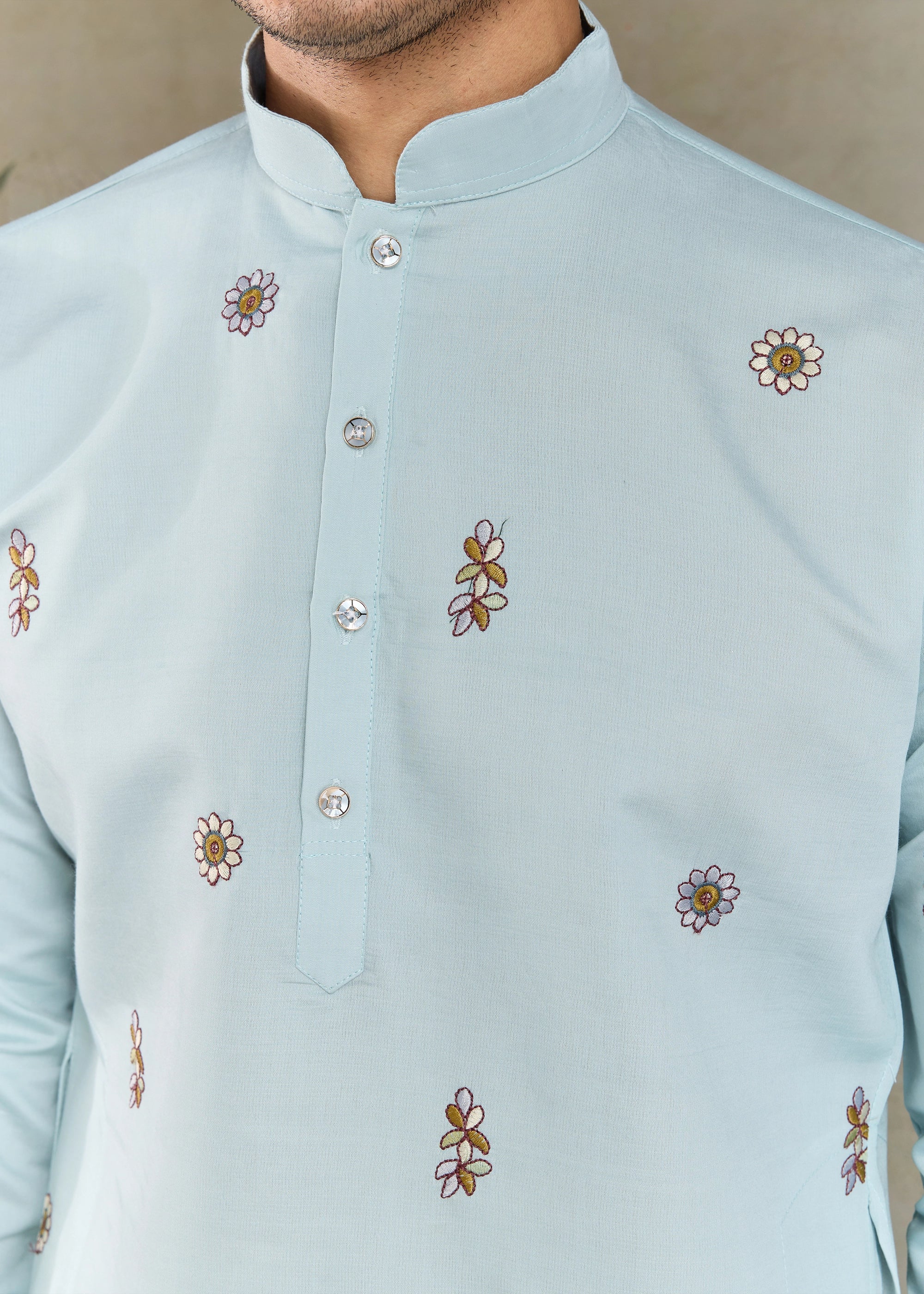This is a stylish and contemporary men's kurta in a light,  soft sky-blue color.The fabric appears to be a lightweight cotton or a similar blend, making it comfortable and breathable.The upper part of the kurta has small, scattered embroidery.The most prominent feature is a detailed, multi-colored border running horizontally along the hemline.The sleeves are adorned with a similar detailed pattern at the cuffs.