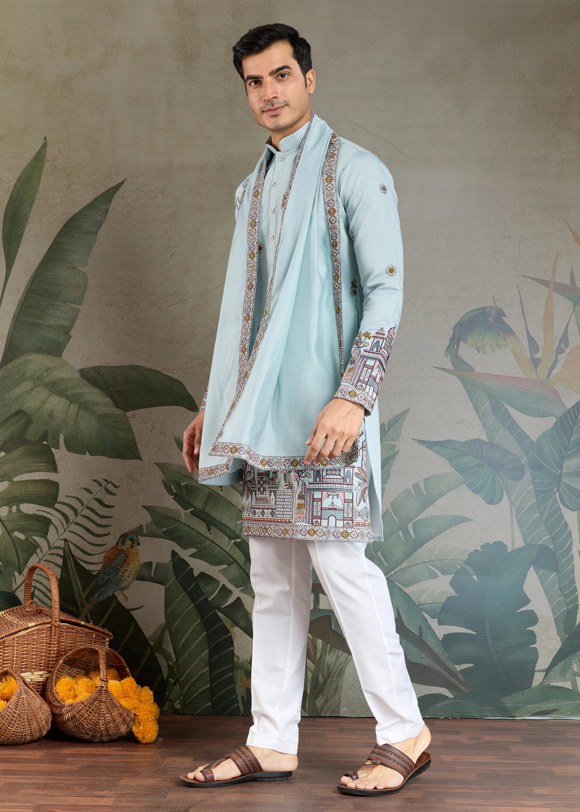This is a stylish and contemporary men's kurta in a light,  soft sky-blue color.The fabric appears to be a lightweight cotton...