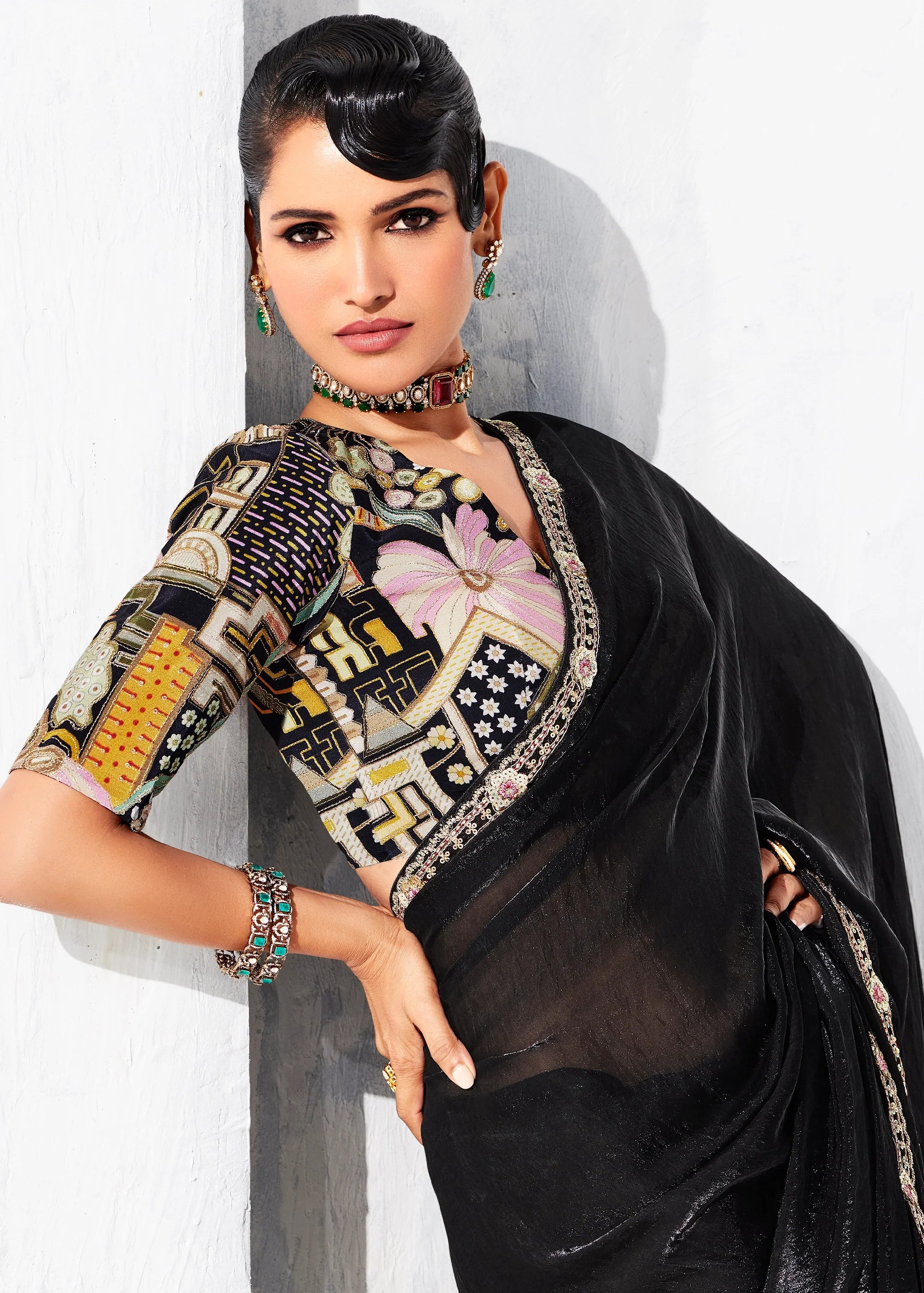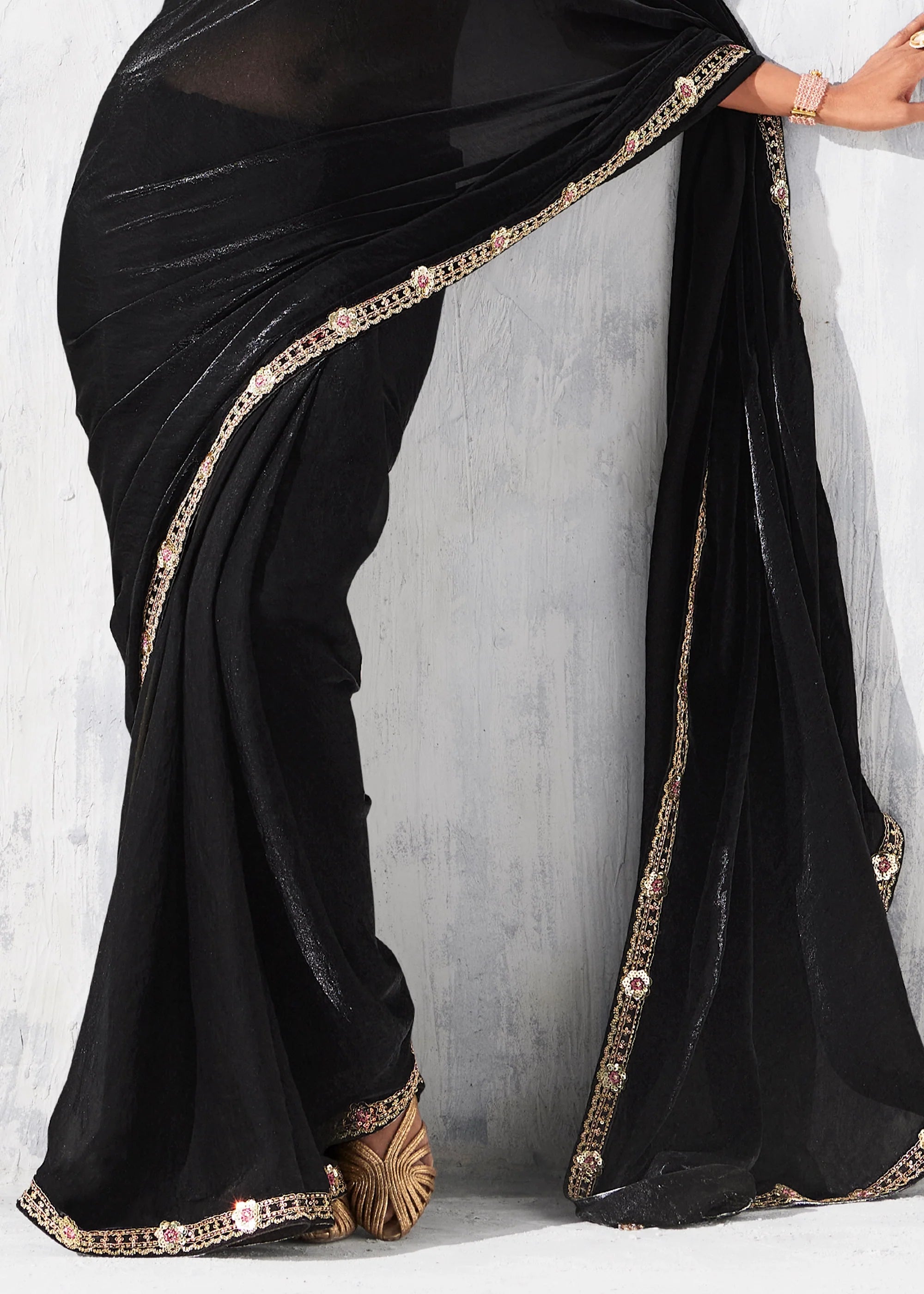 This stunning black saree, crafted from luxurious fabric, features a beautifully detailed, embellished blouse and a delicate border. It offers timeless elegance with a touch of sparkle, ideal for any special occasion or evening gathering.