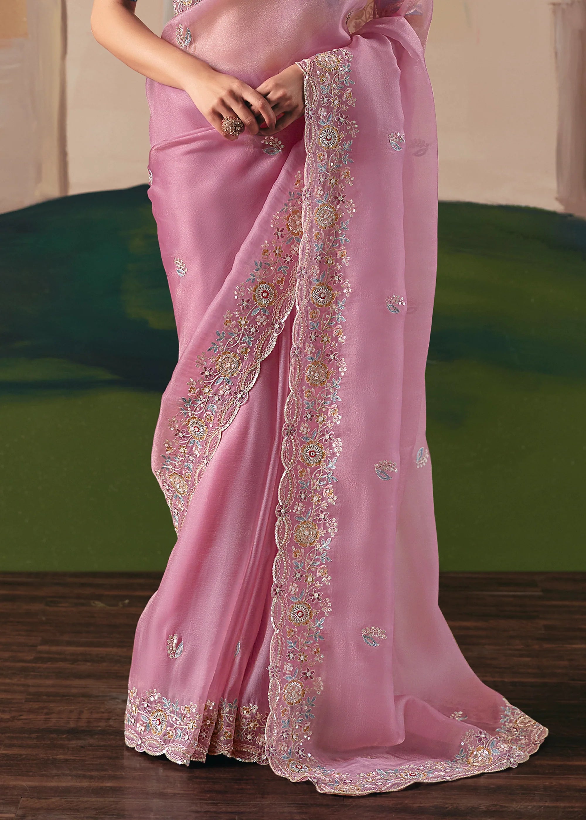 This elegant light pink saree features intricate resham embroidery, sequins, and moti work along the border, paired with a contrasting teal blue art silk blouse. Perfect for festive evenings or weddings, this ensemble brings a youthful and trendy vibe.