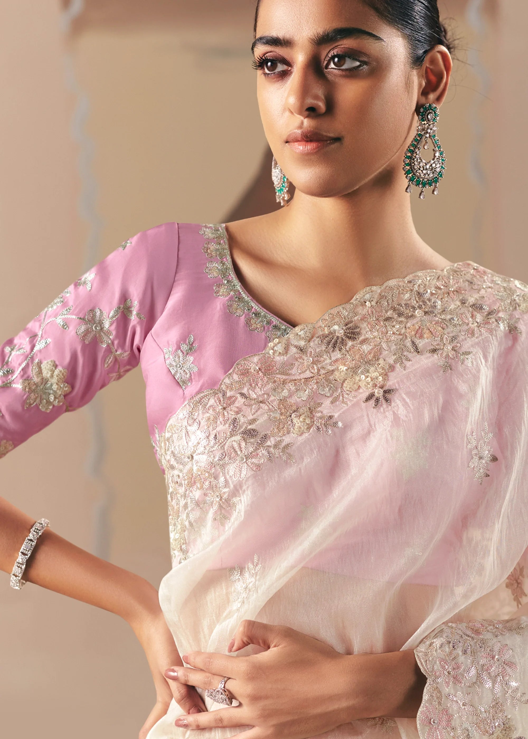 Step out in style with this elegant off-white fancy fabric saree, featuring intricate embroidery, sequins, and moti work, paired with a pink blouse for a stunning festive look.